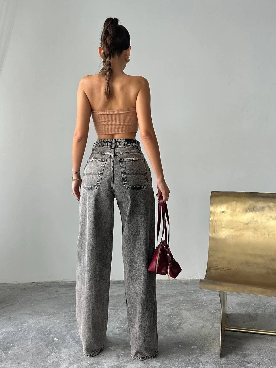 Sezonun en iddialı trendlerini bir araya getiren bu vintage yıkamalı gri denim pantolon, gardırobunuzun yeni favorisi olmaya aday! Yüksek bel tasarımı sayesinde bel hatlarını zarifçe kavrayıp şekillendirirken, dökümlü ve geniş paça (palazzo) kesimi ile gün boyu maksimum konfor sunar. Özel asit yıkama efekti, sokak stiline havalı ve modern bir dokunuş katar.