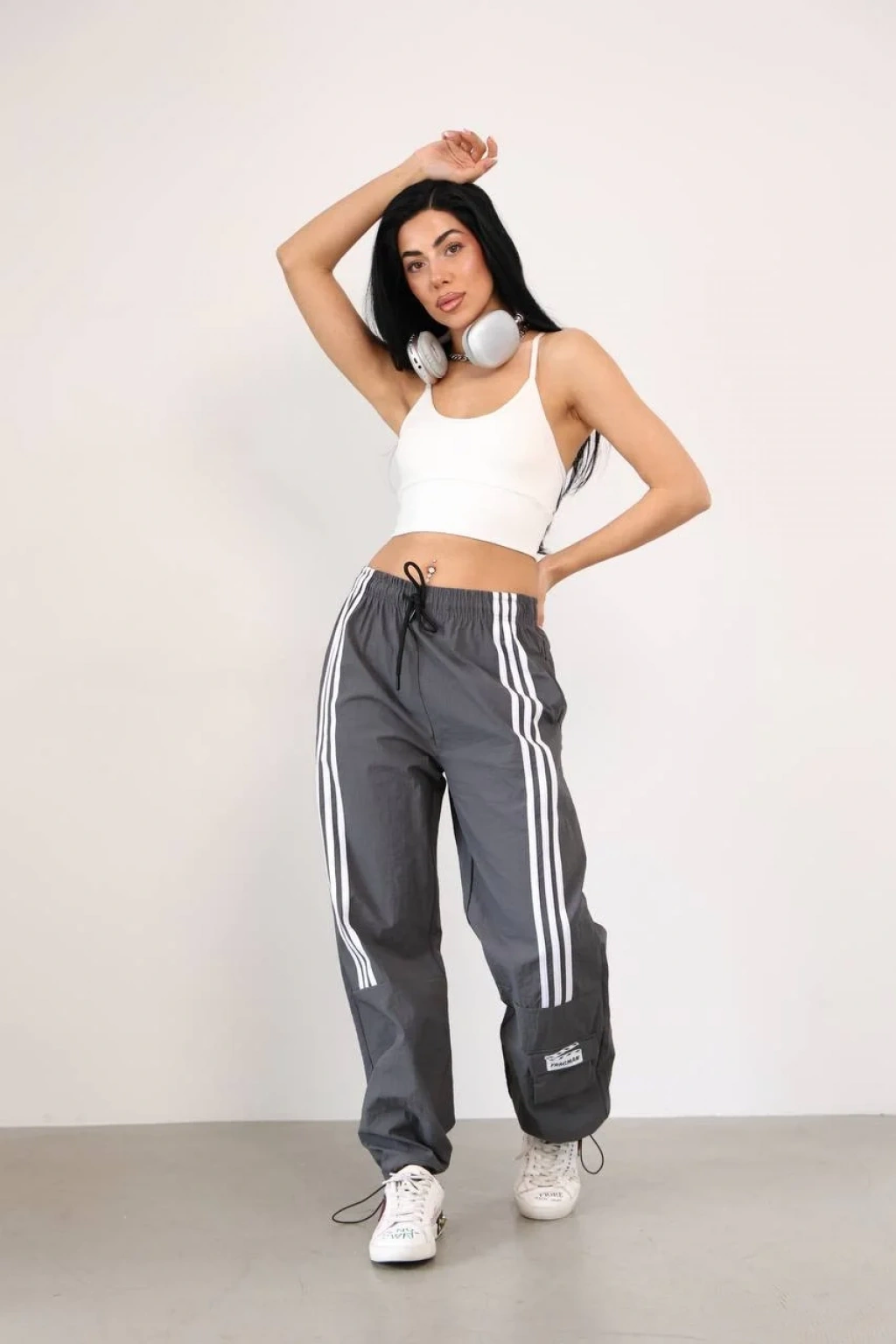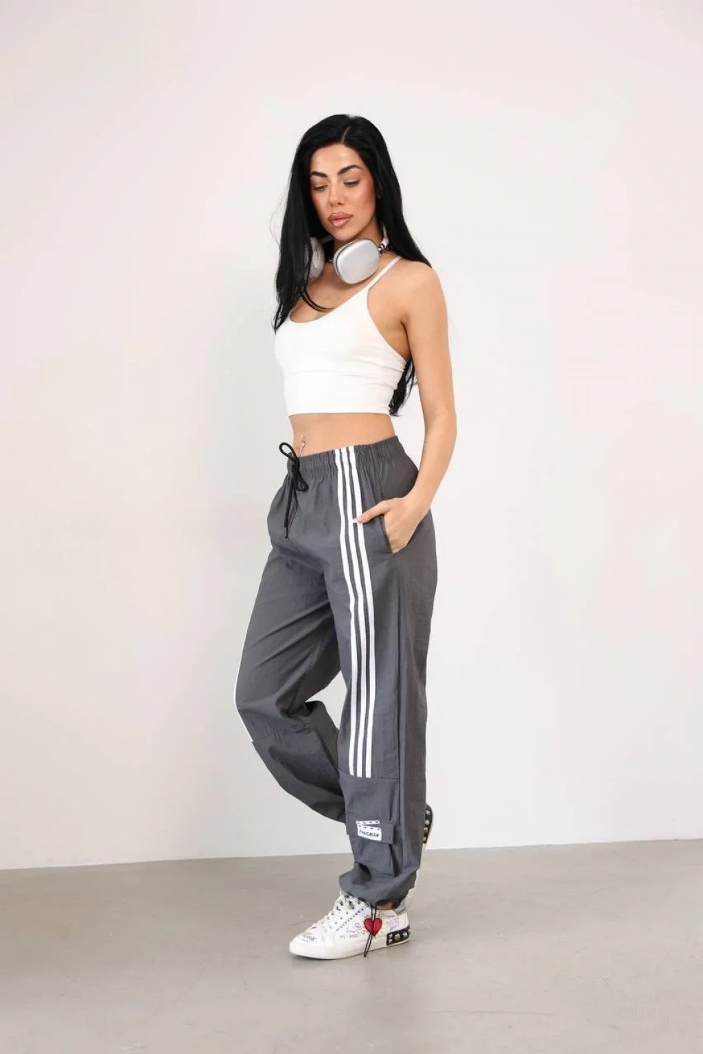 Modaskop'un şık tasarımıyla dikkat çeken Antrasit Önden Üç Şerit Paça Cep Detay Paraşüt Eşofman, spor şıklığına vurgu yapıyor.