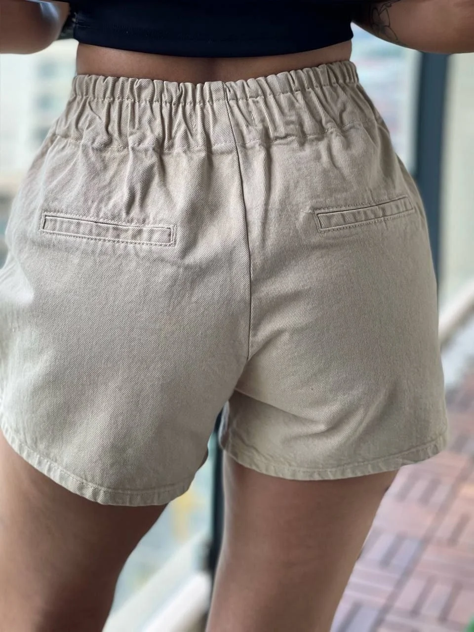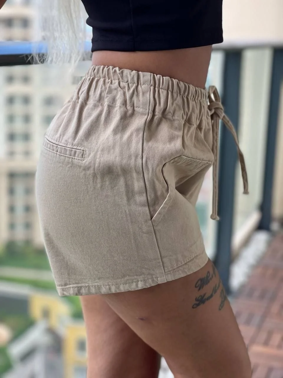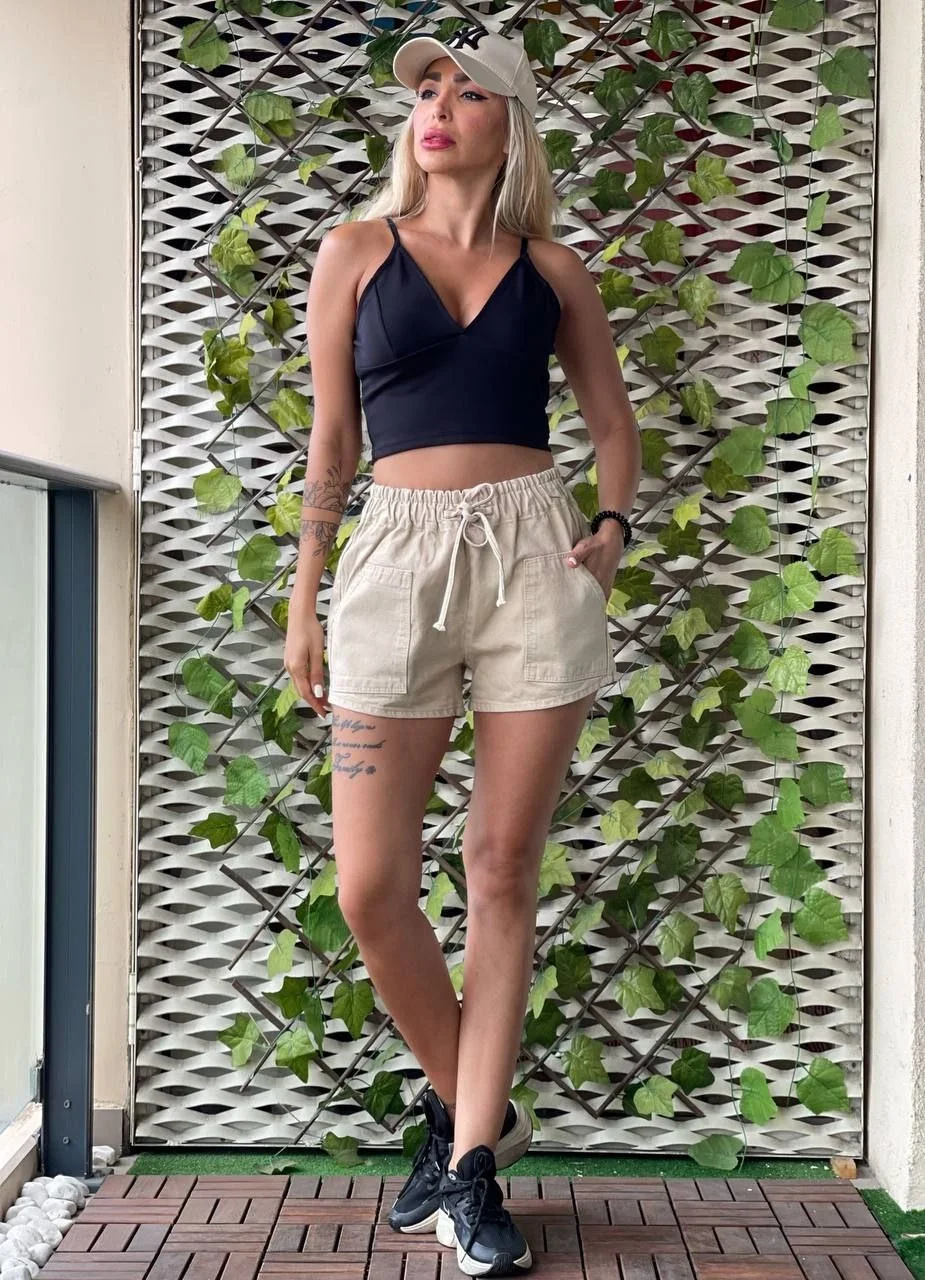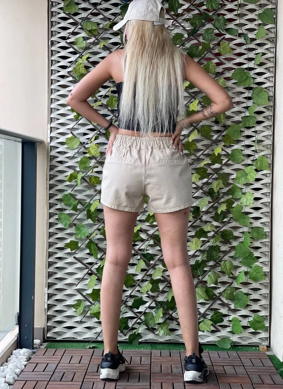 Bej Bağcıklı Kot Şort