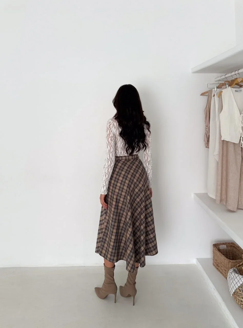 Bej Ekoseli Önü Düğmeli Kemerli Etek