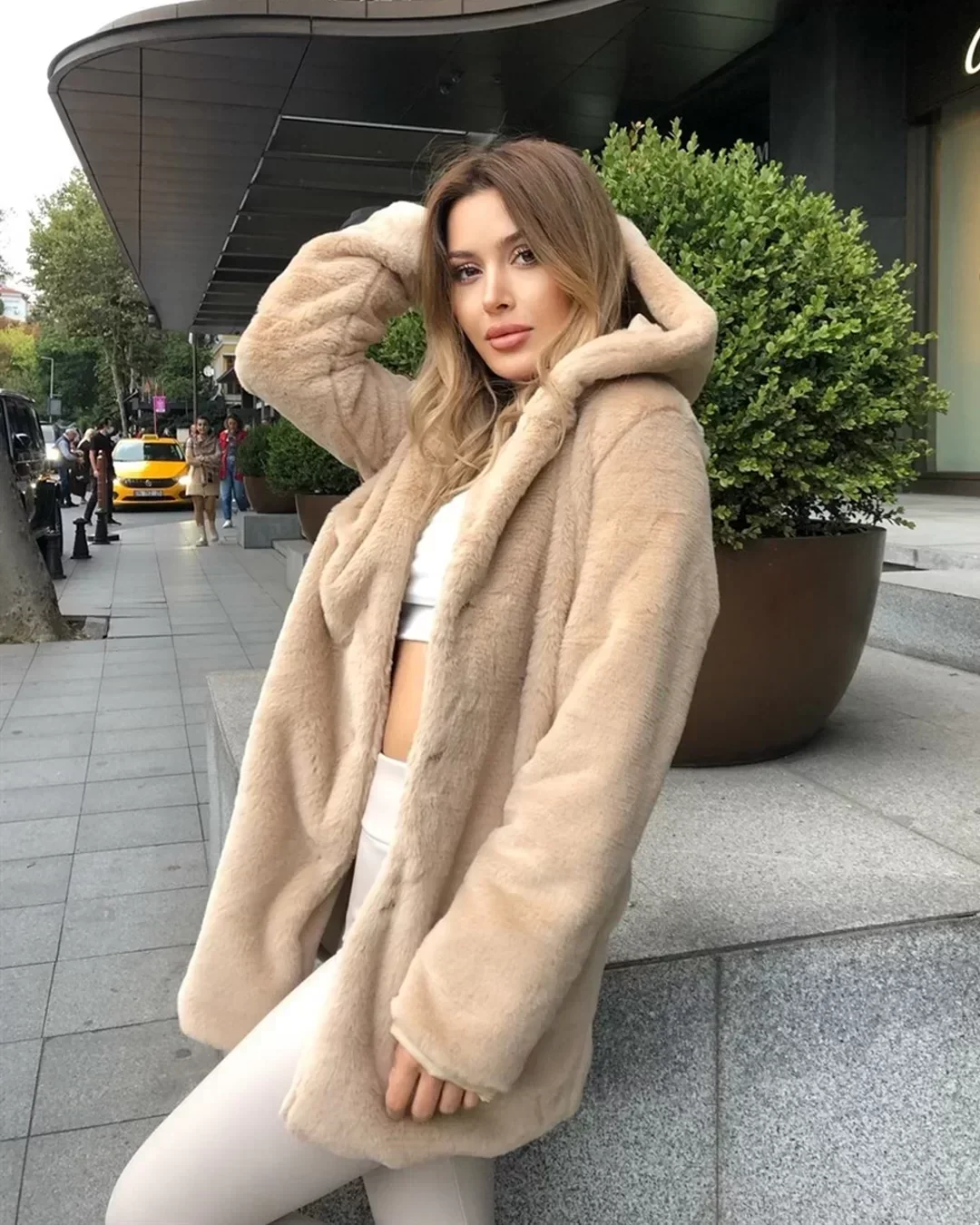 • Bej Kapşonlu İçi Astarlı Rabbit Peluş Kaban