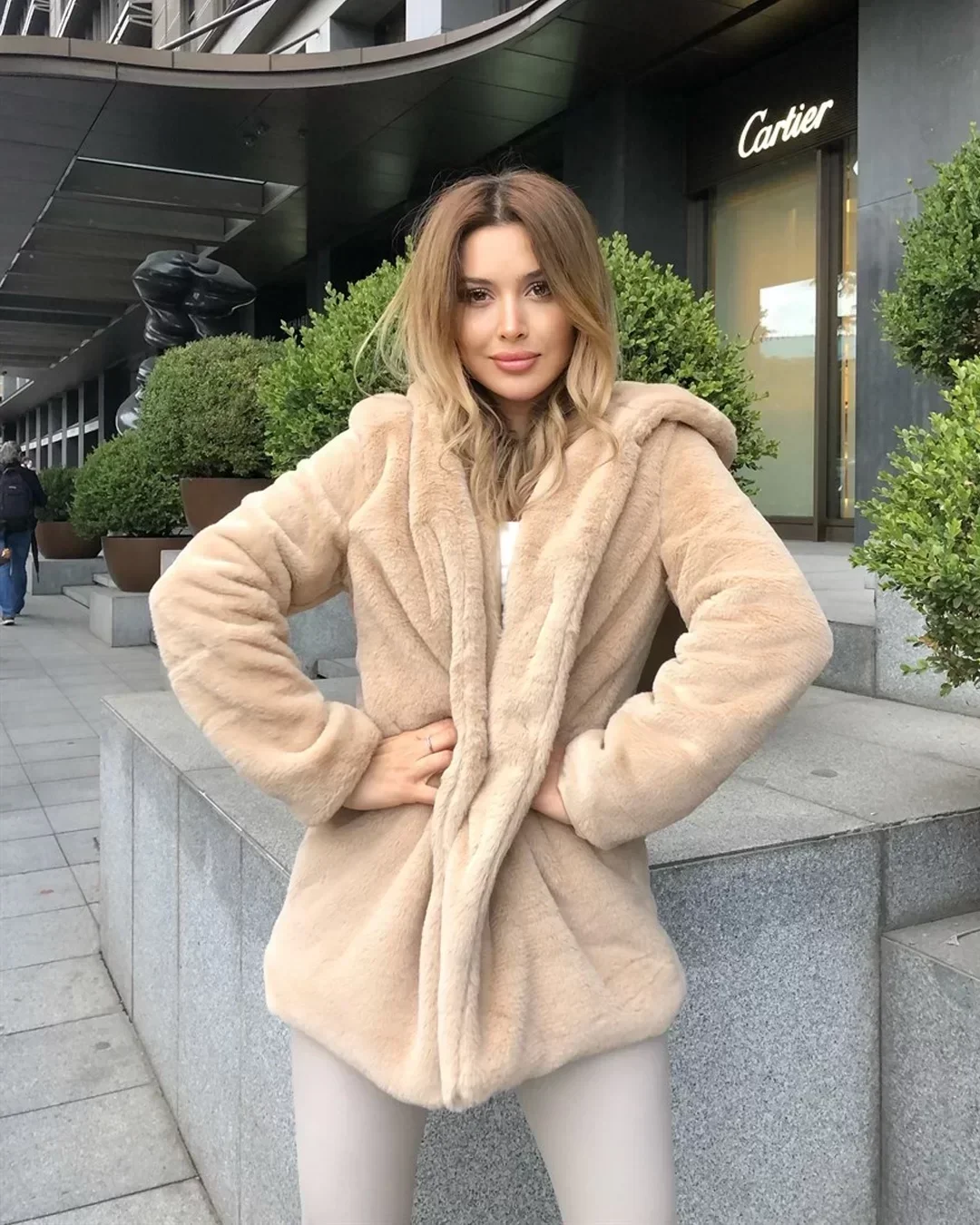 Bej Kapşonlu İçi Astarlı Rabbit Peluş Kaban