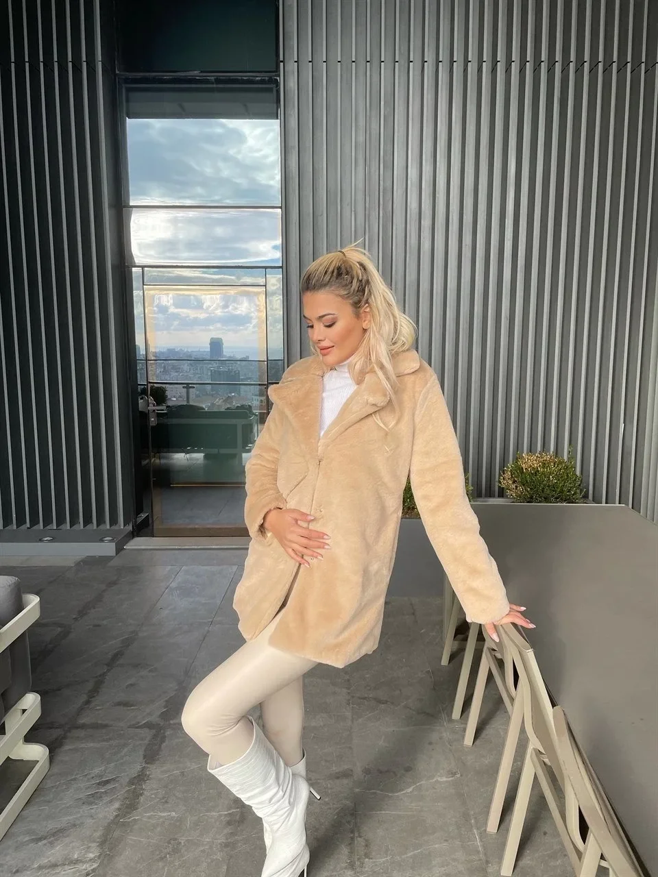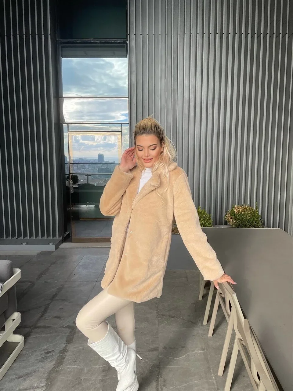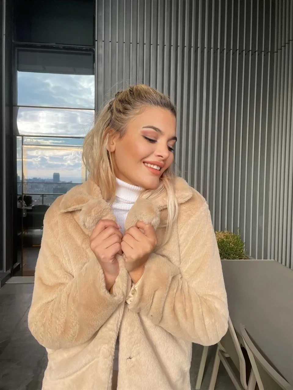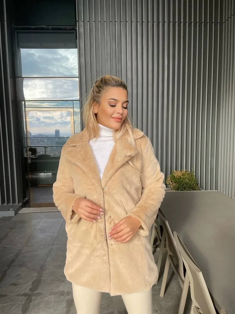 • Bej Şal Yaka İçi Astarlı Rabbit Peluş Kaban