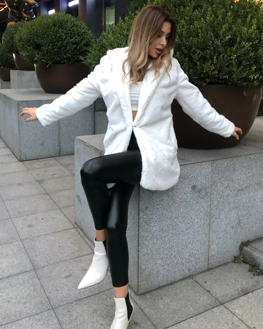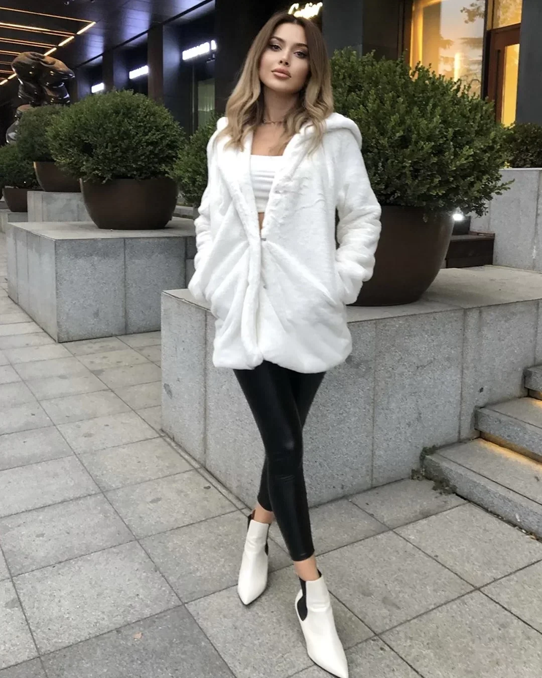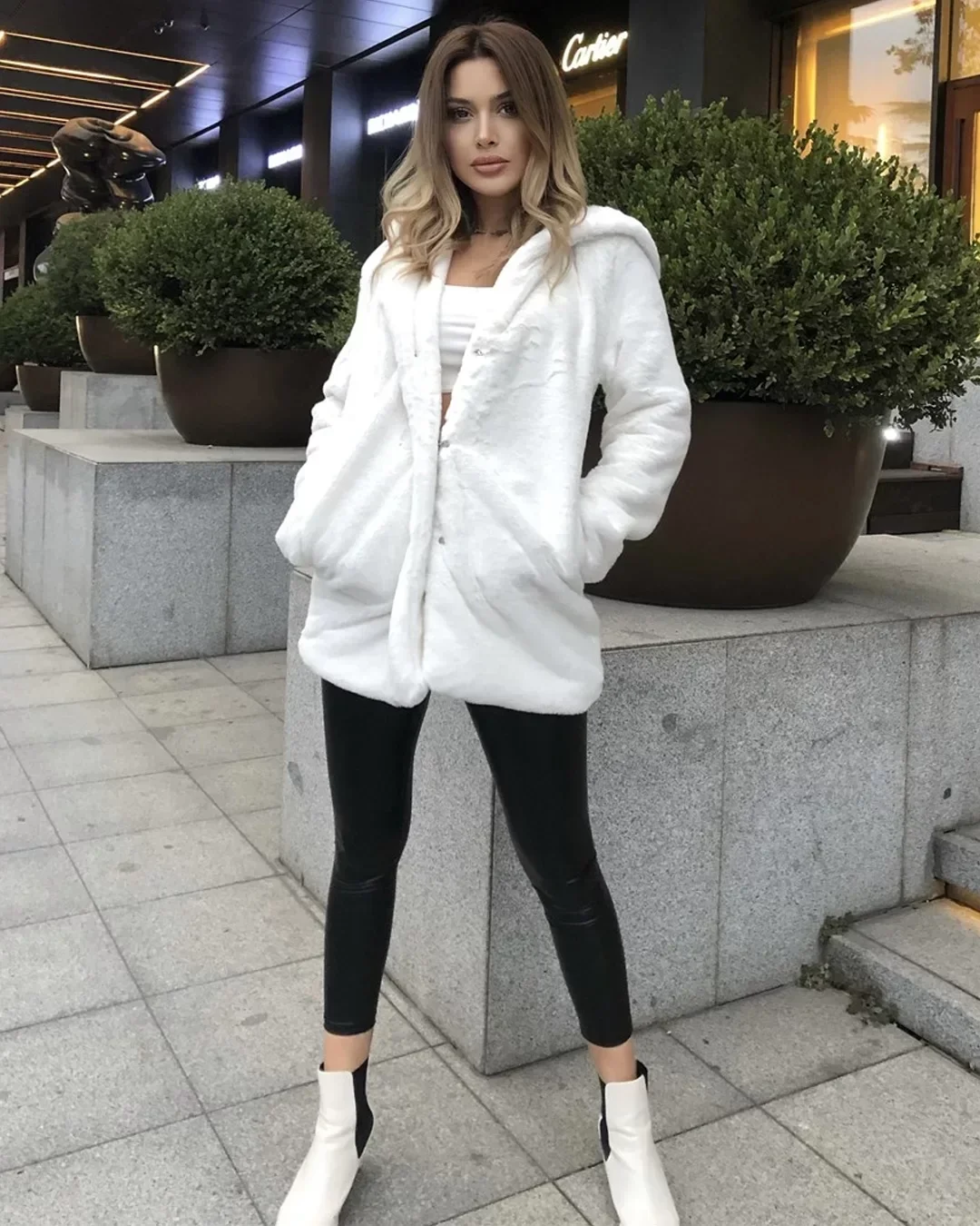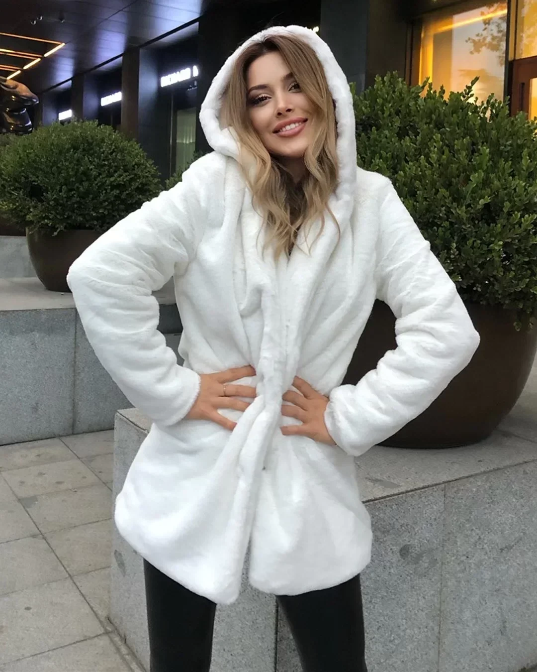 • Beyaz Kapşonlu İçi Astarlı Rabbit Peluş Kaban