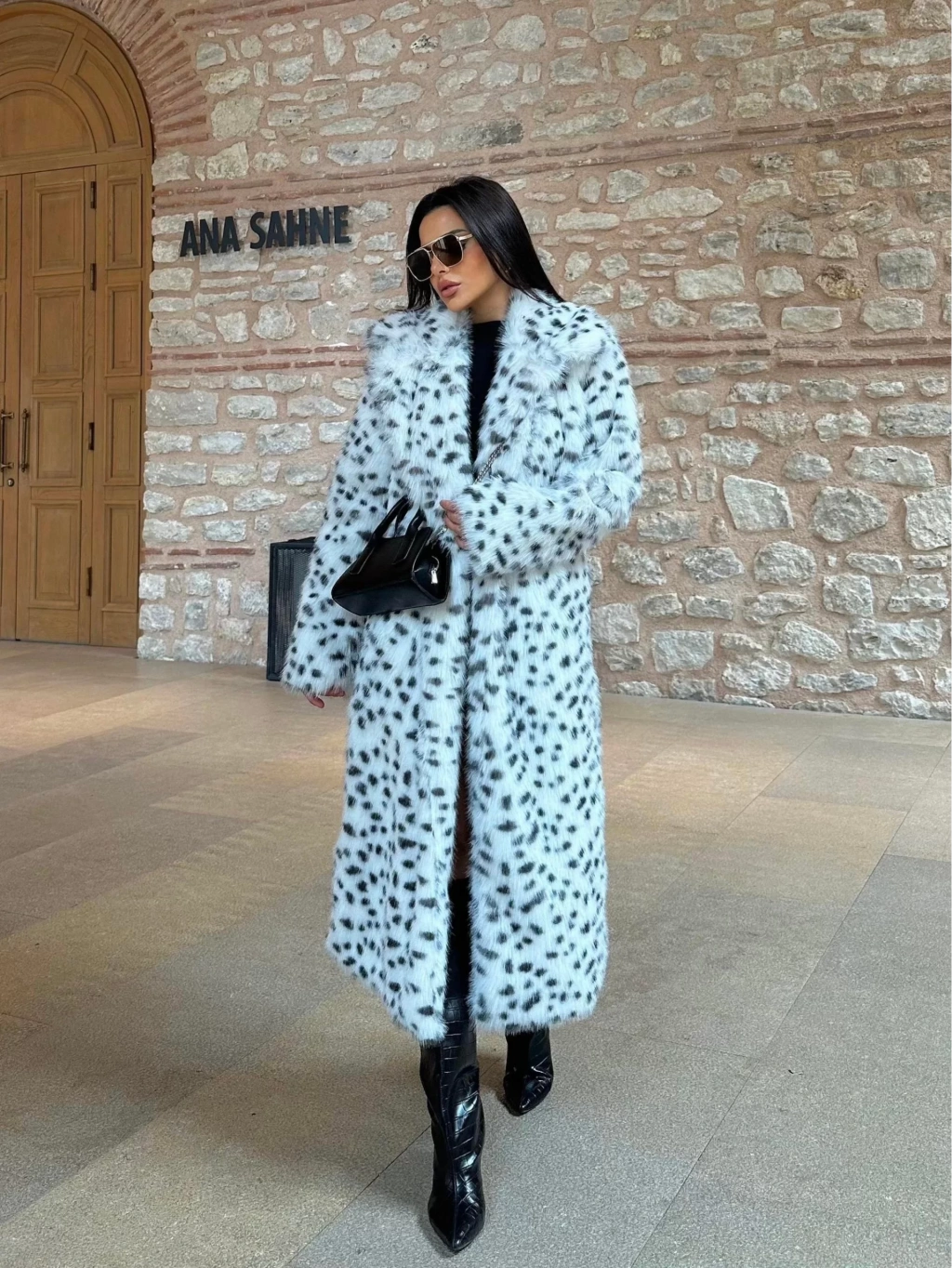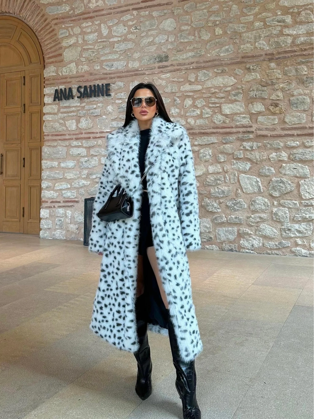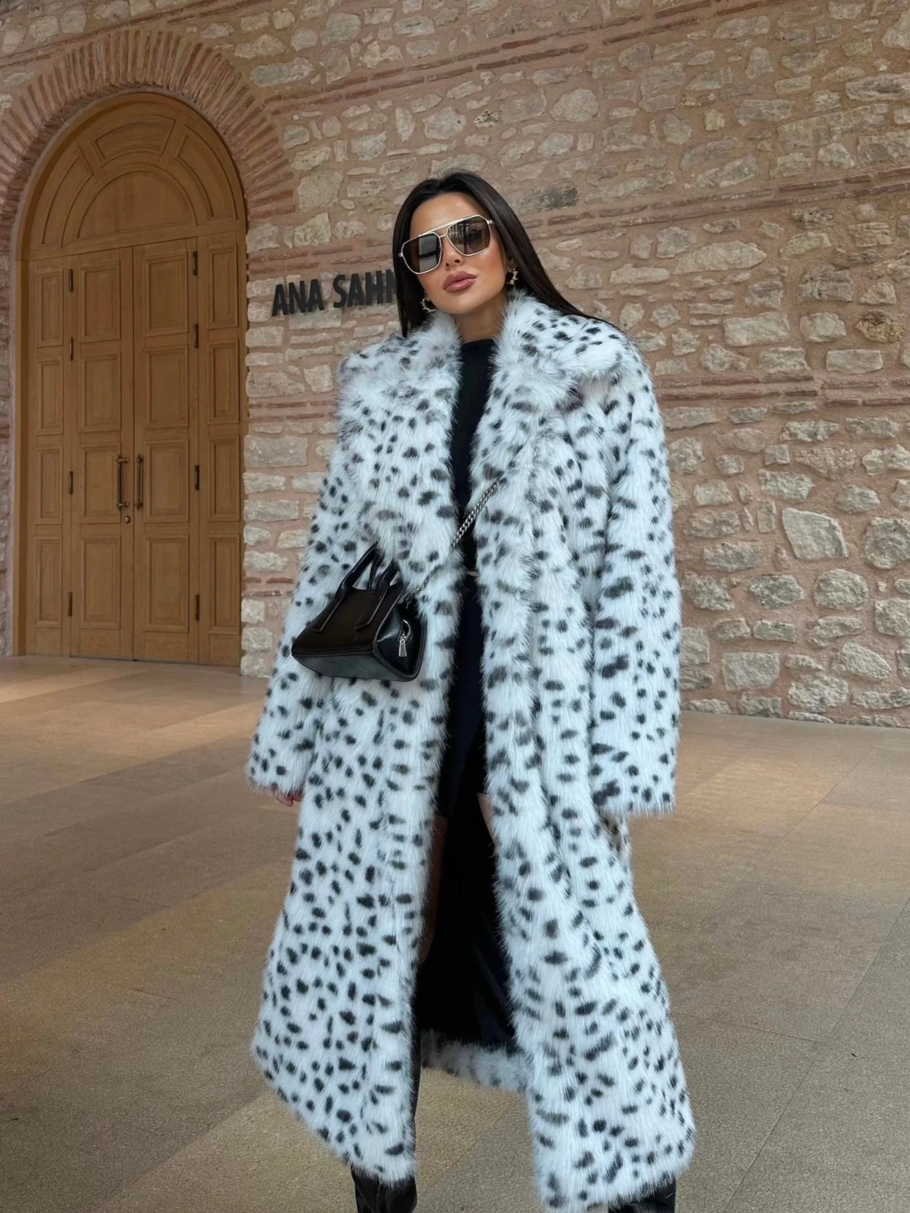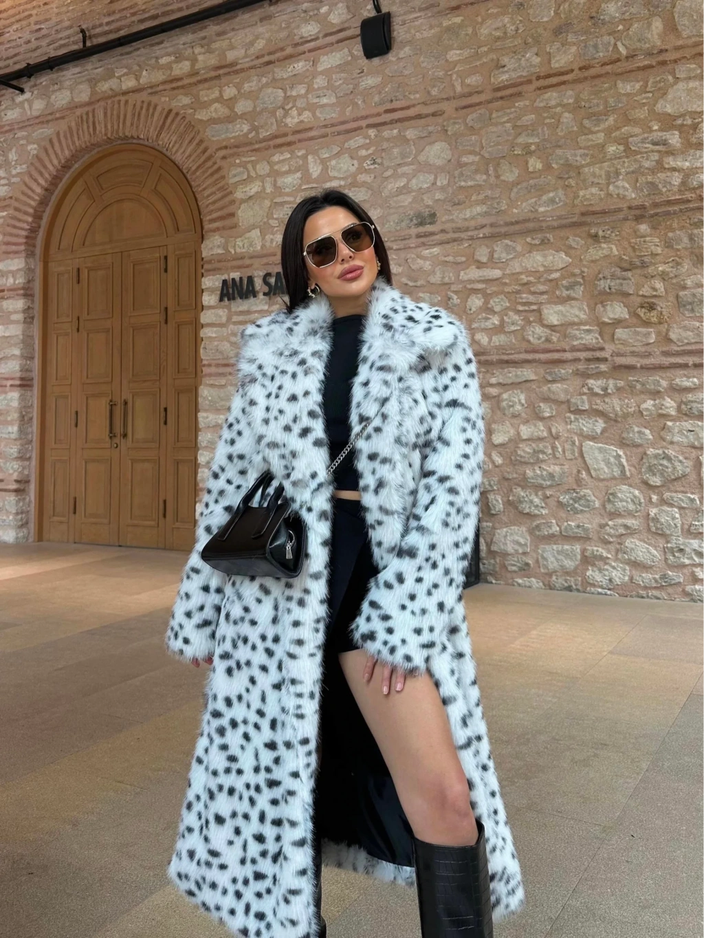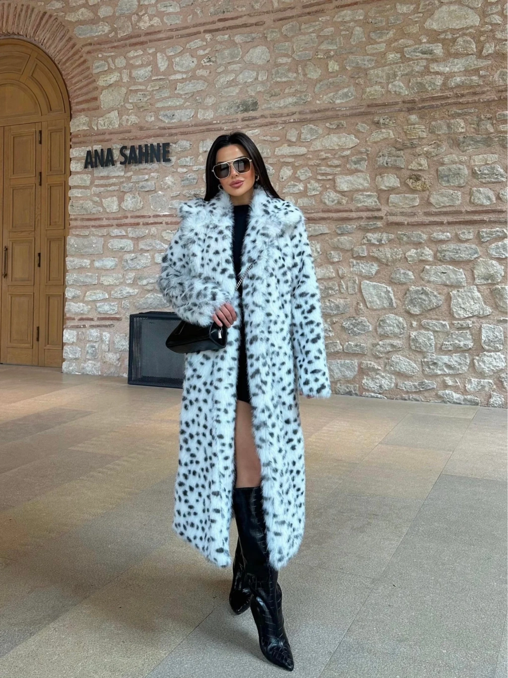 Beyaz Leopar Ceket Yaka İçi Satarlı Uzun Kürk Kaban