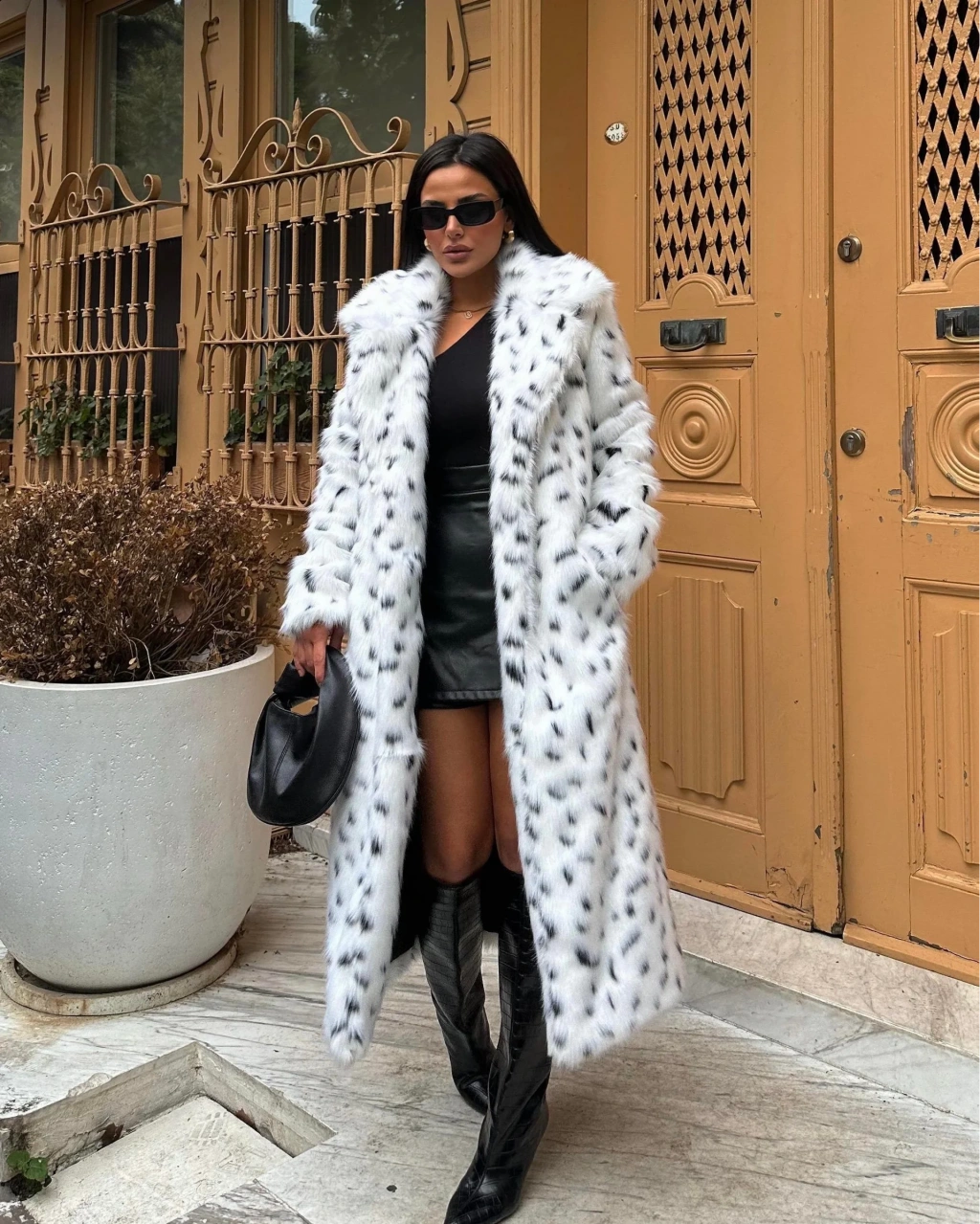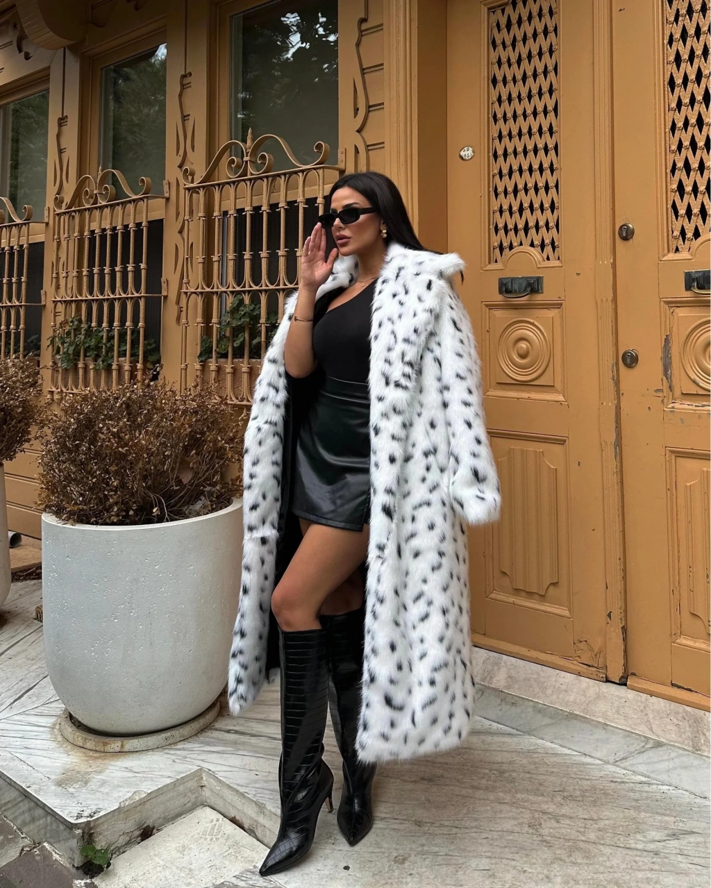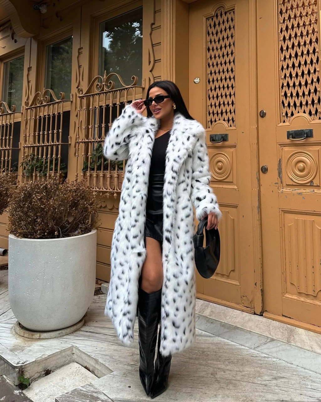 Leopar Ceket Yaka İçi Satarlı Uzun Kürk Kaban
