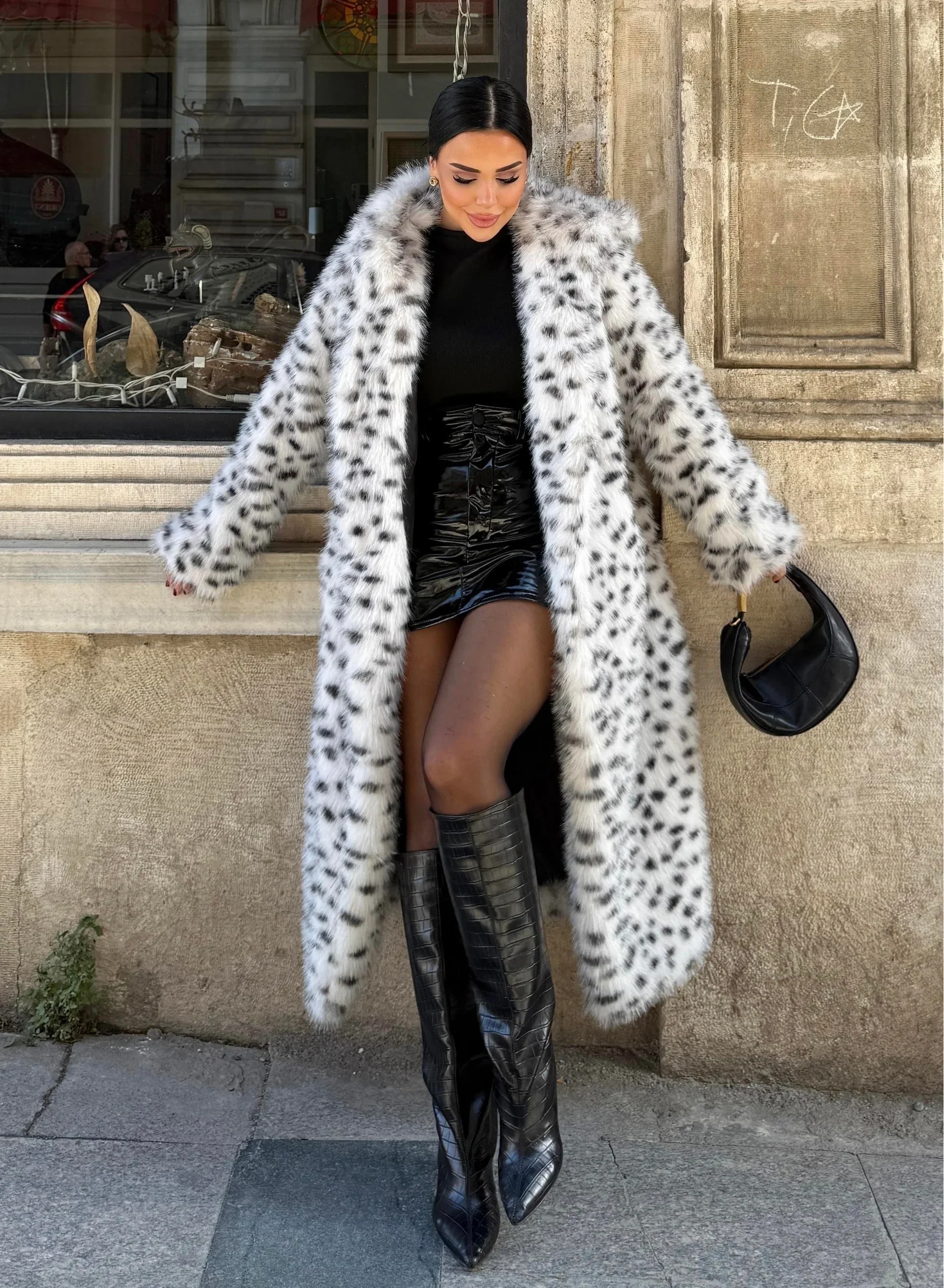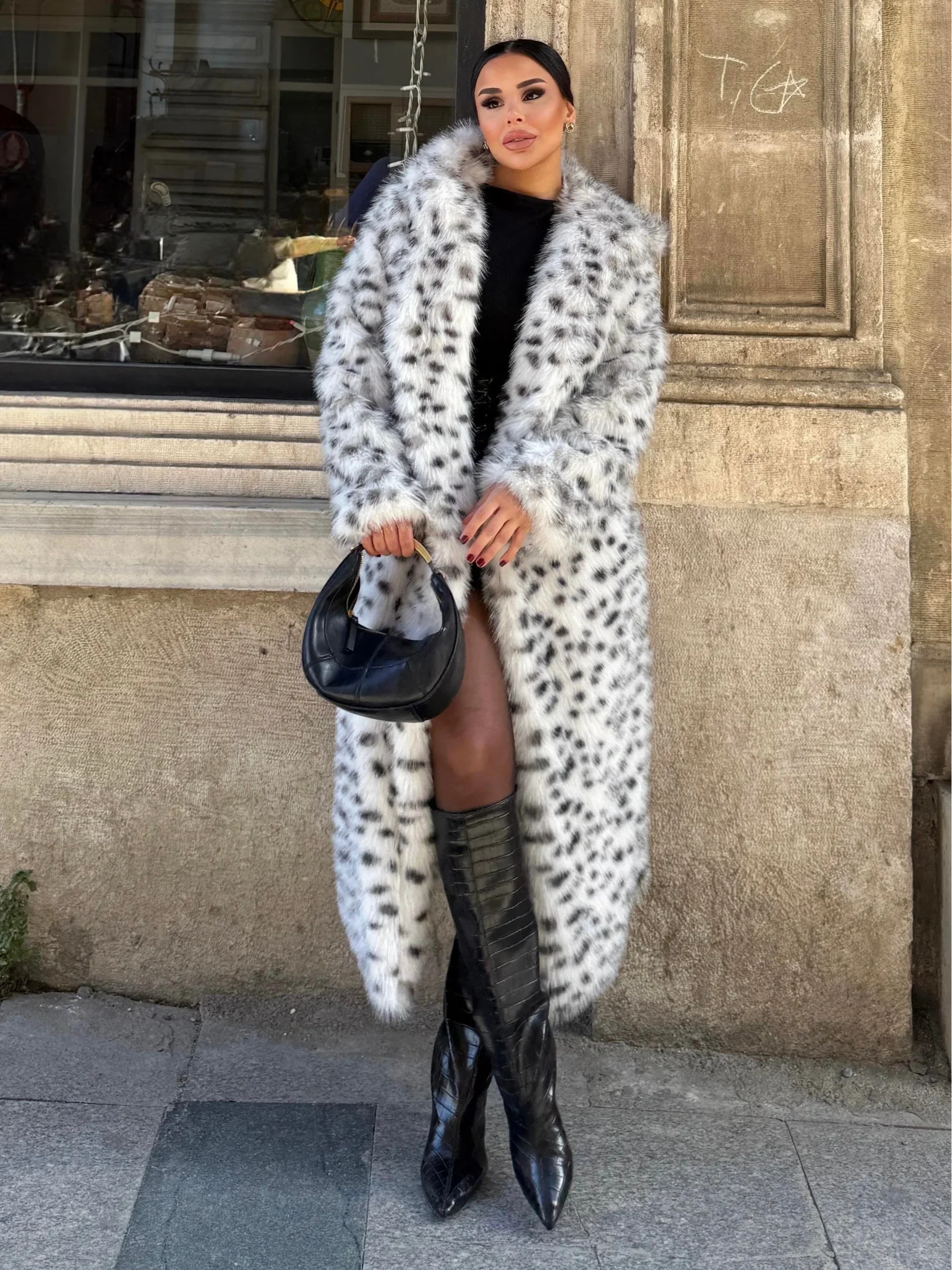 Beyaz Leopar Kapşonlu Uzun İthal Kürk