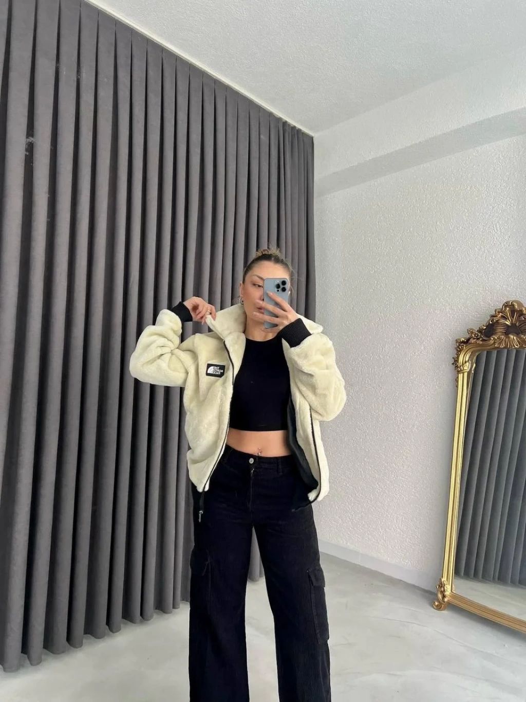 Modaskop Beyaz NF Oversize Unisex İçi Astarlı Rabbit Mont, şıklık ve rahatlığı bir arada sunar.