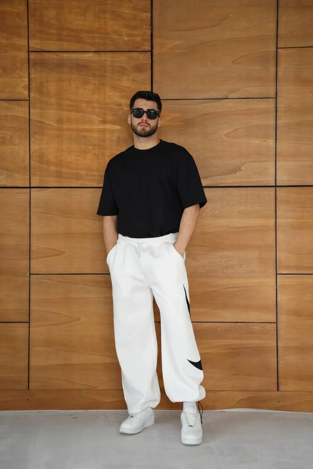 Beyaz Basic Biyeli Unisex Oversize Eşofman