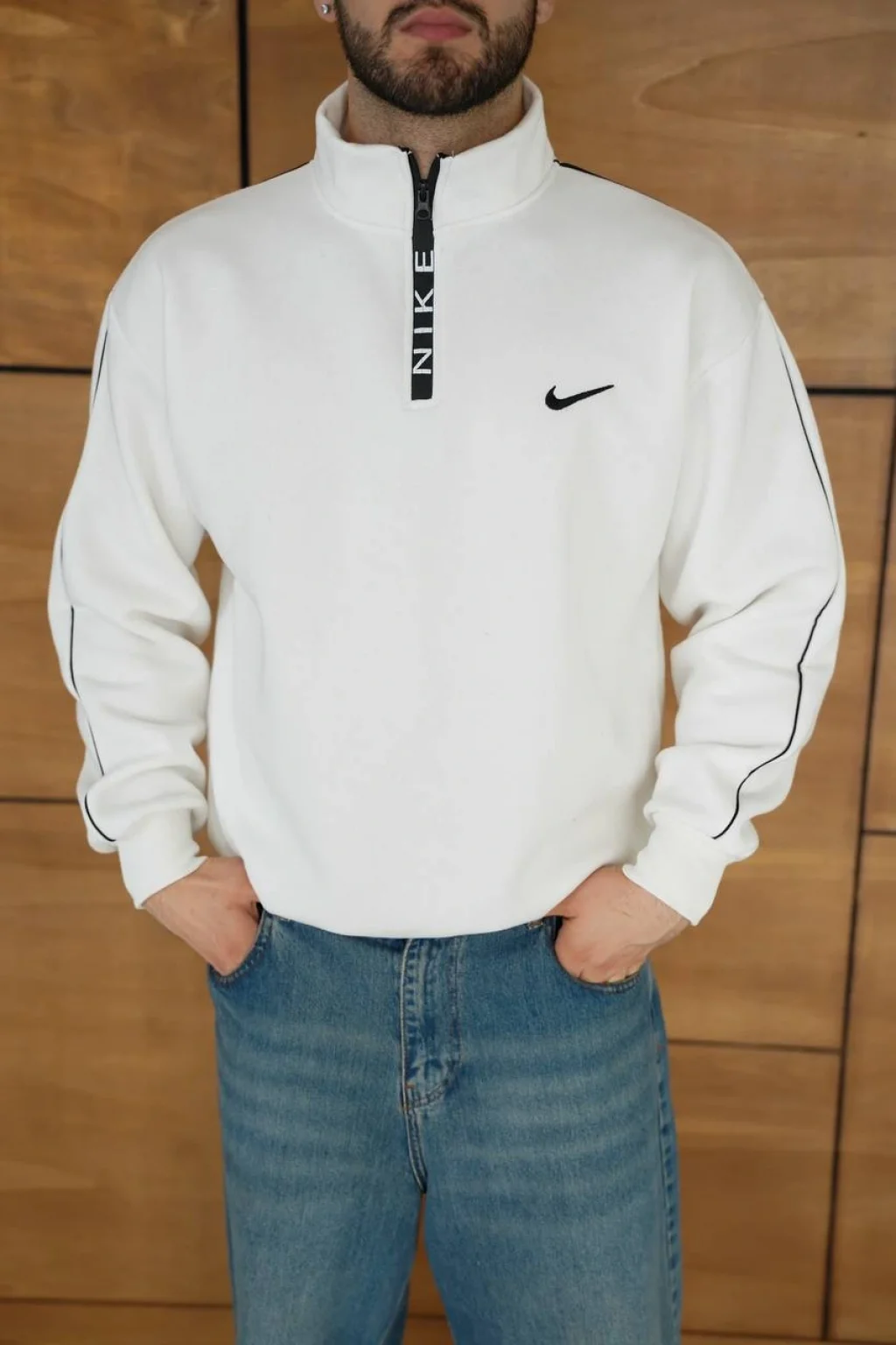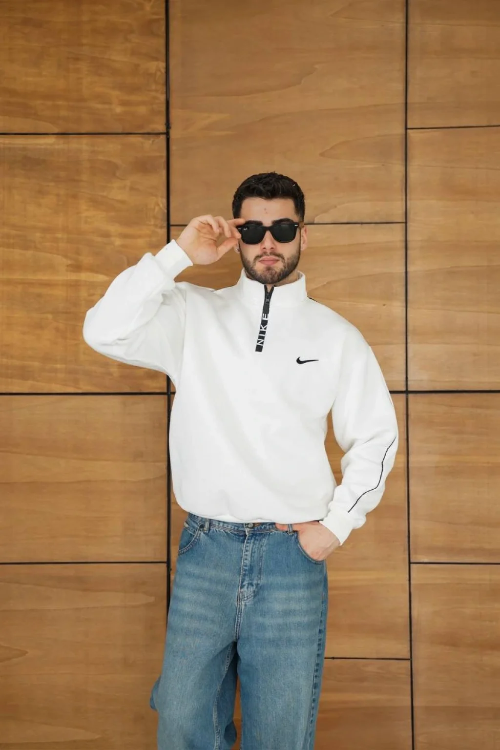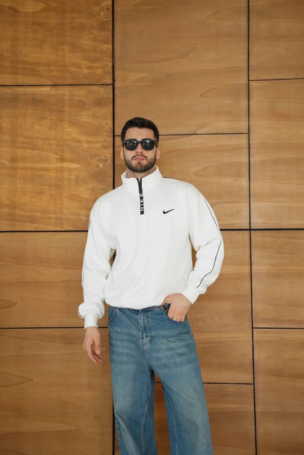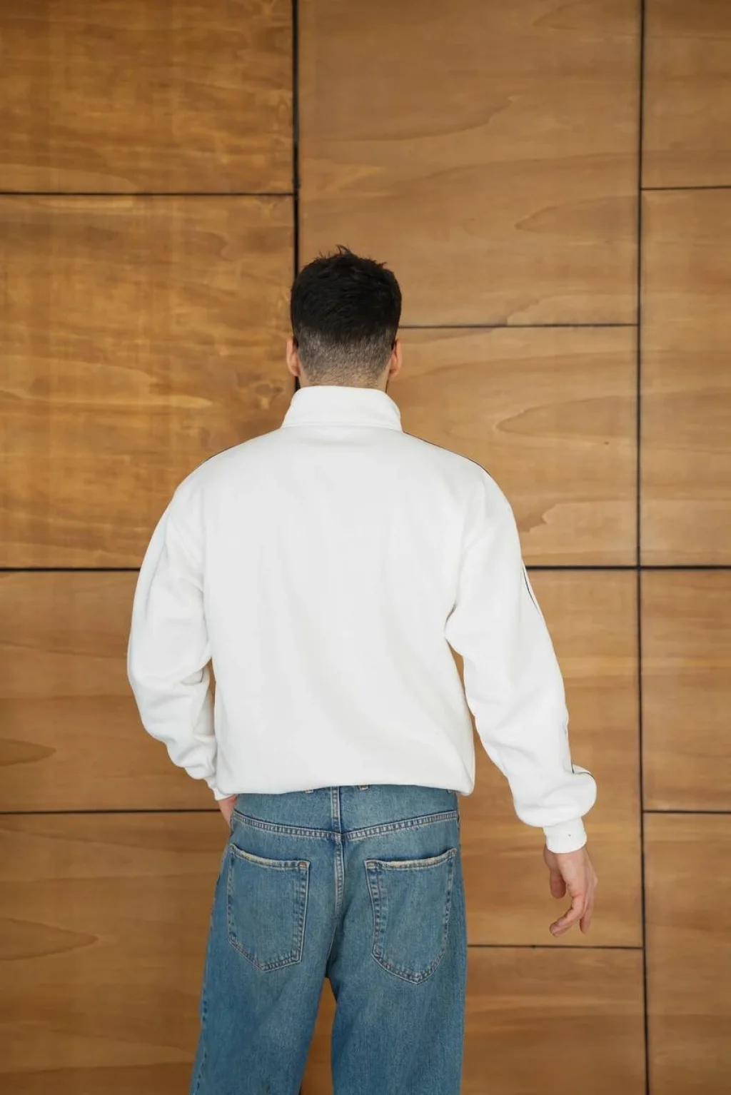 Beyaz ADD Üç Şerit Fermuar Yaka Unisex Oversize Sweat