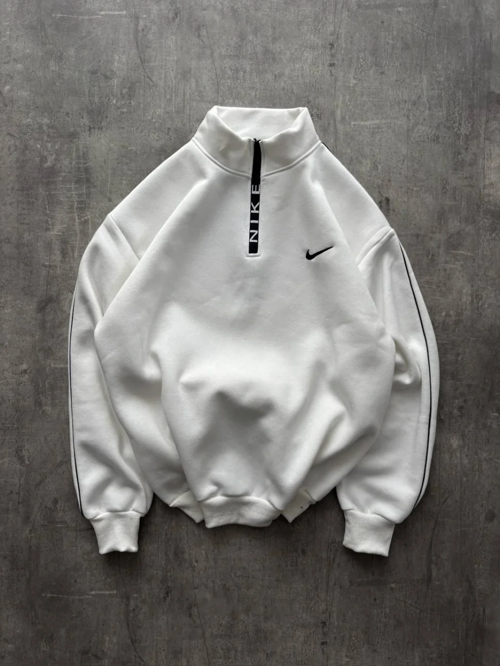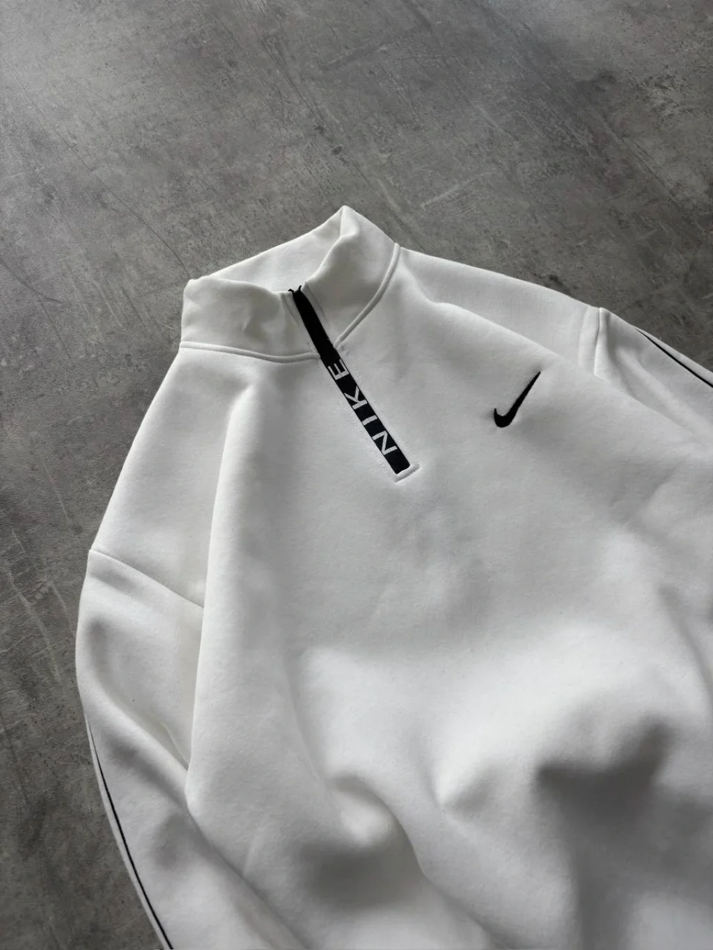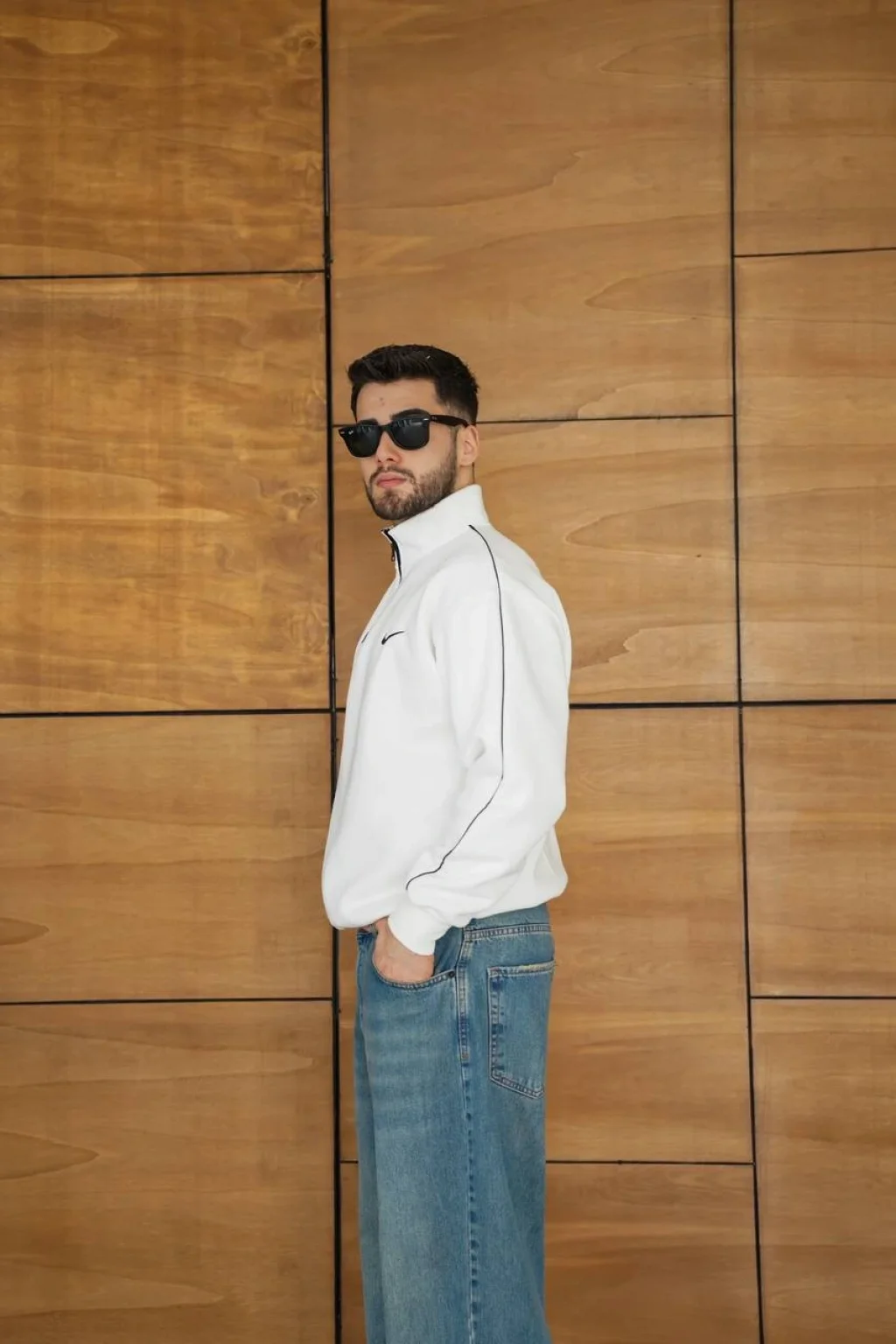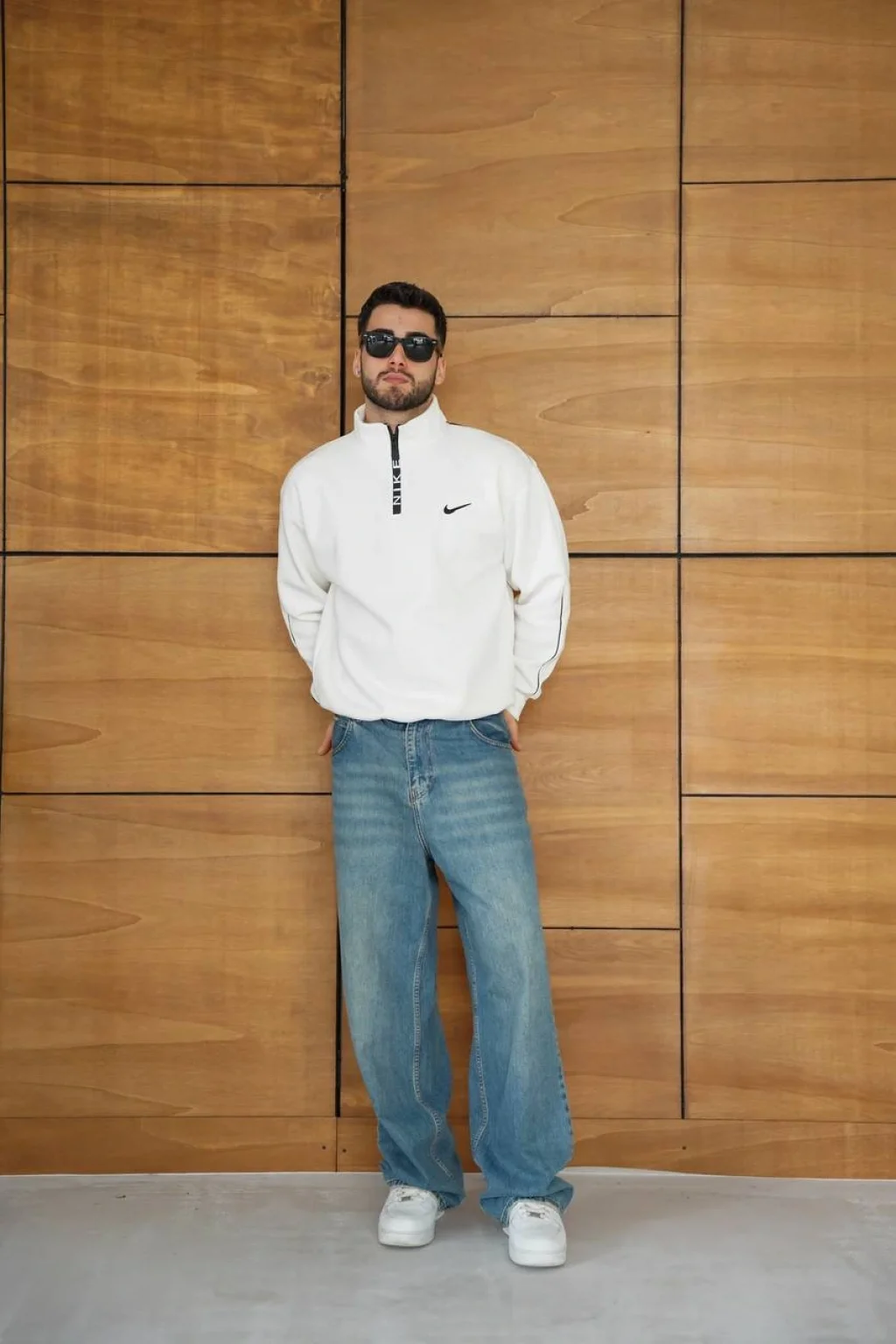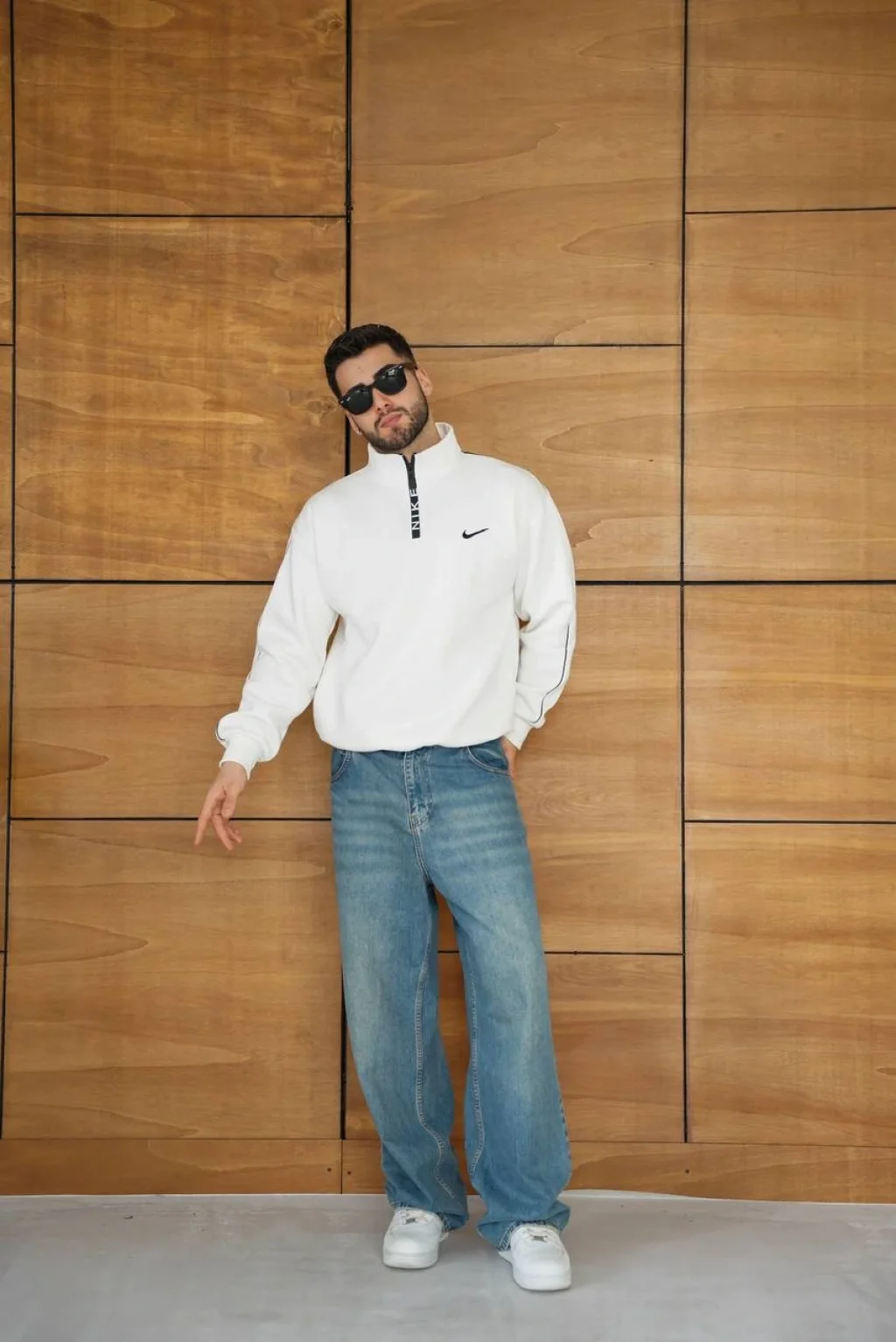 Beyaz ADD Üç Şerit Fermuar Yaka Unisex Oversize Sweat
