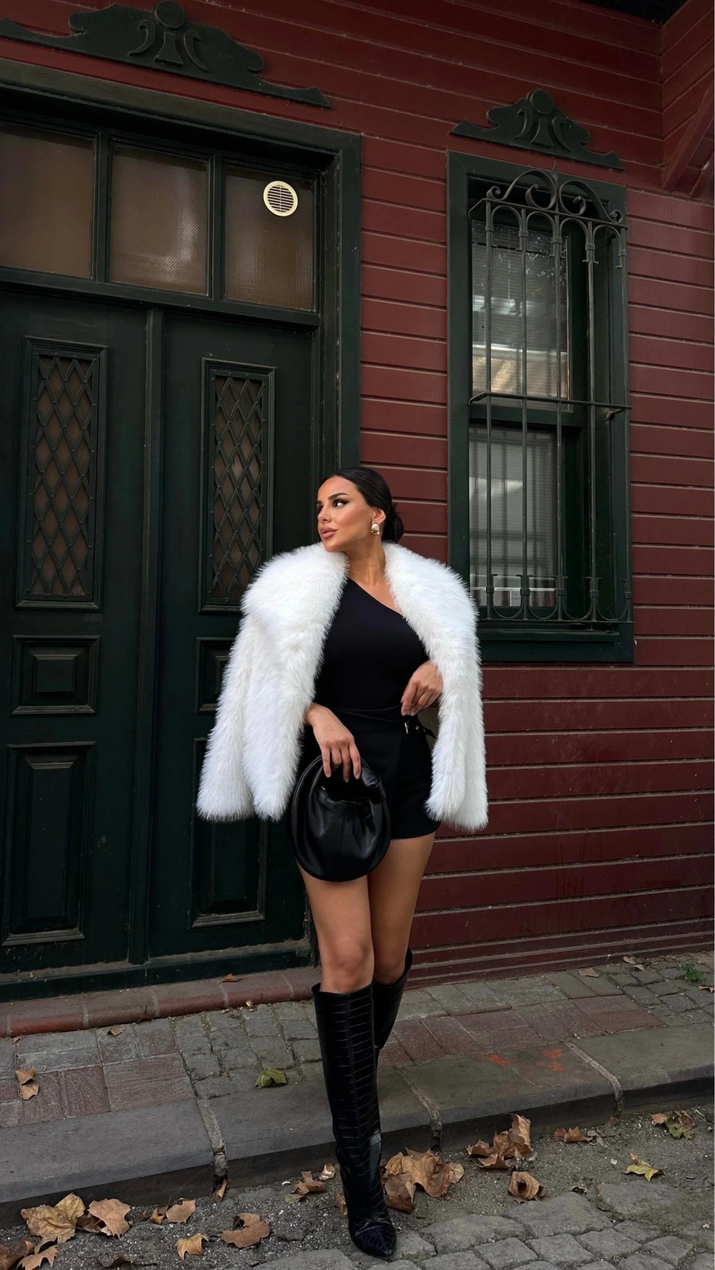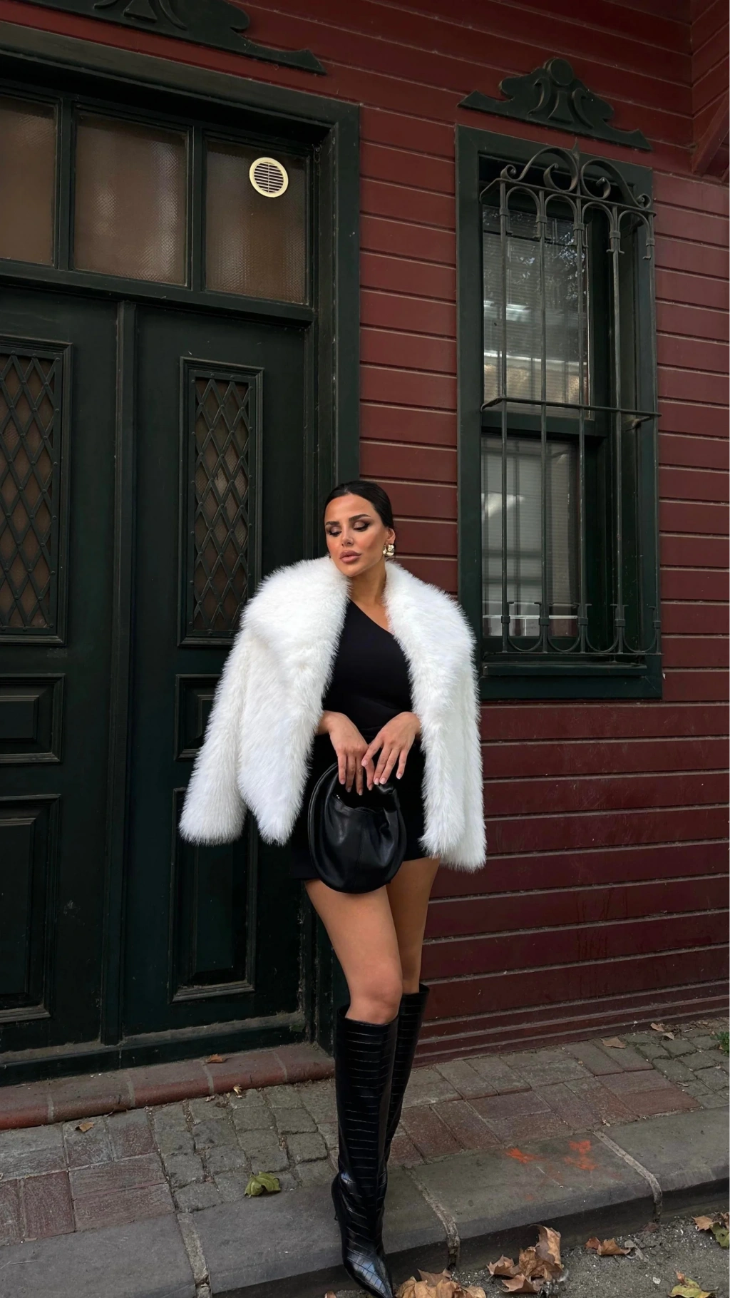 Beyaz Leopar Ceket Yaka İçi Satarlı Uzun Kürk Kaban