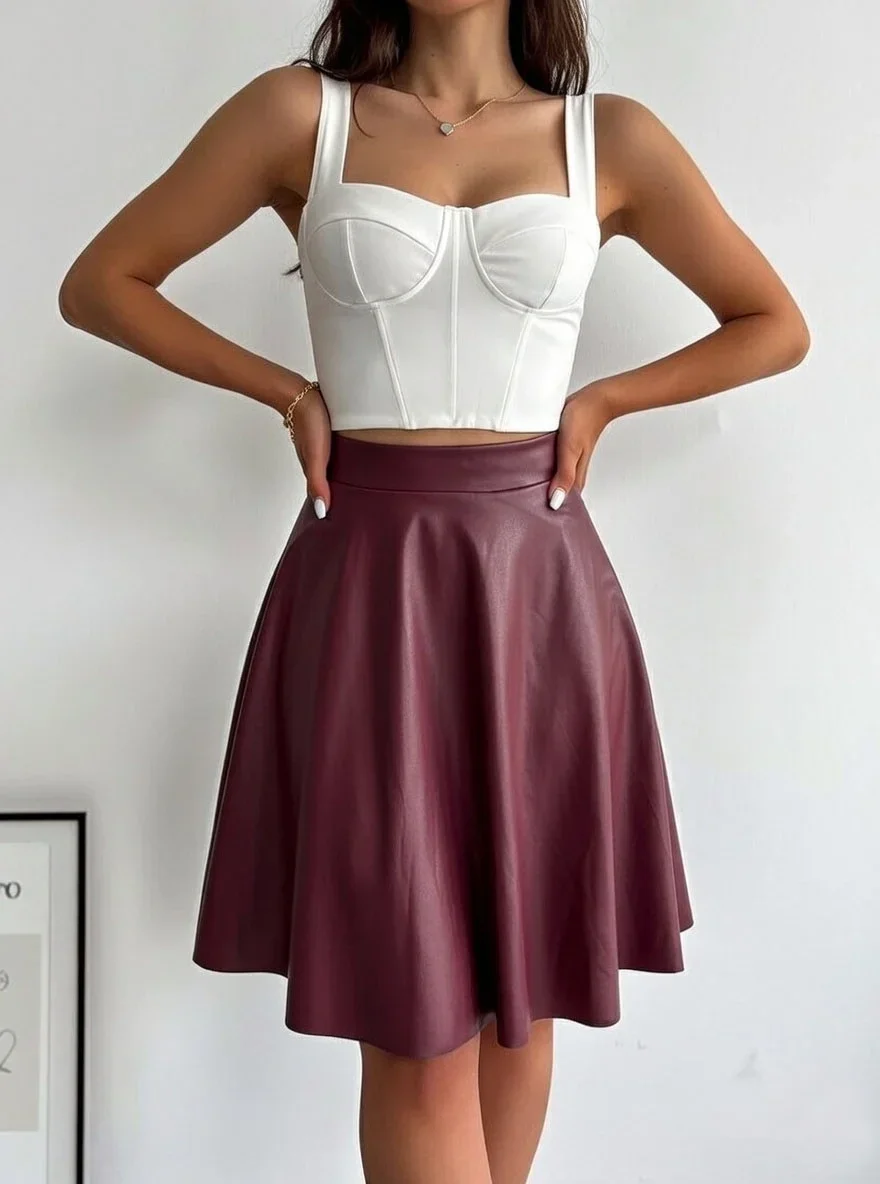 Bordo Deri Kloş Etek