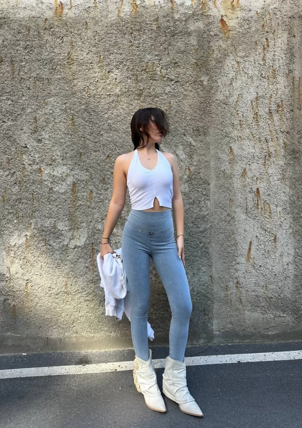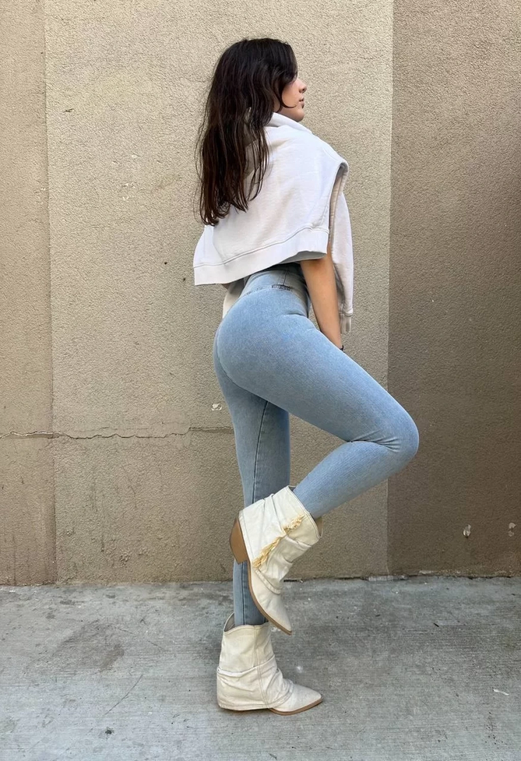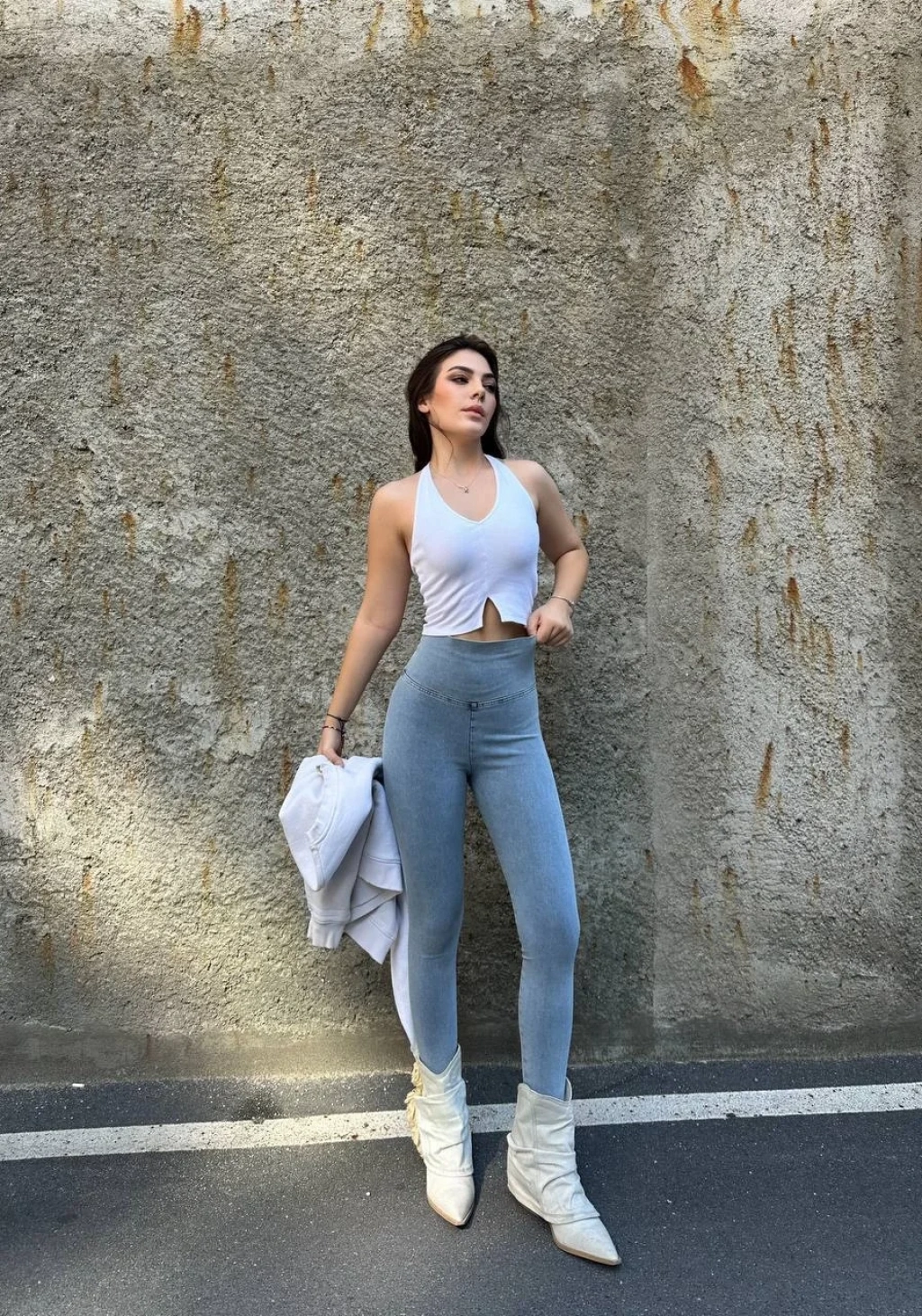 Modaskop Buz Mavi Yüksek Bel En Boy Likralı Kot Tayt, şıklığı ve konforu bir arada sunar.