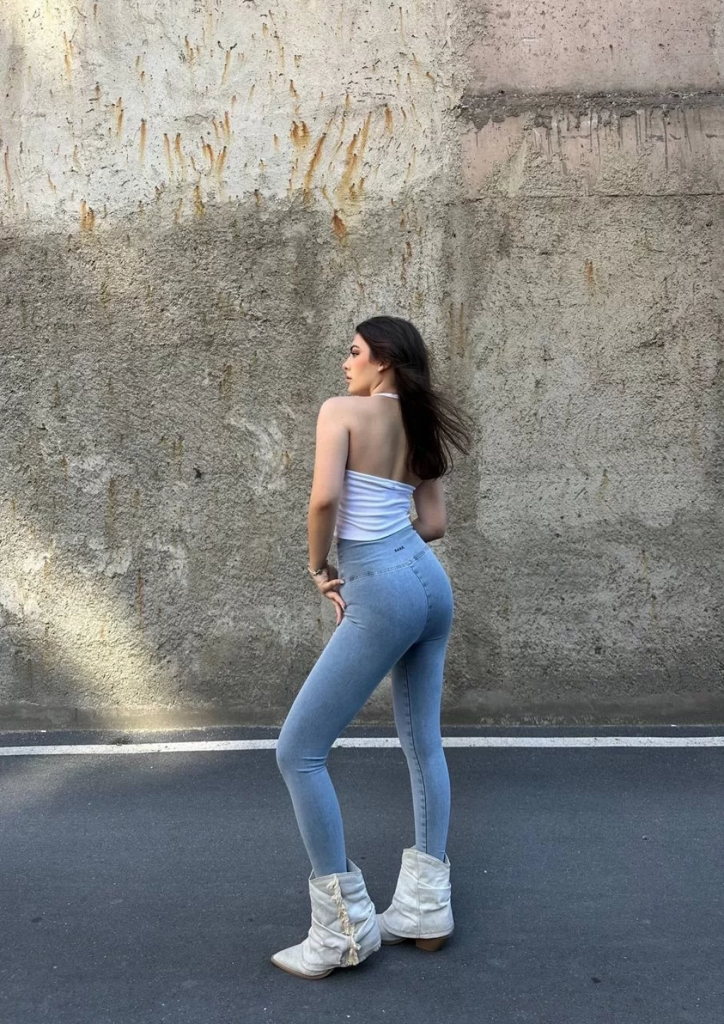 Buz Mavi Yüksek Bel En Boy Likralı Kot Tayt