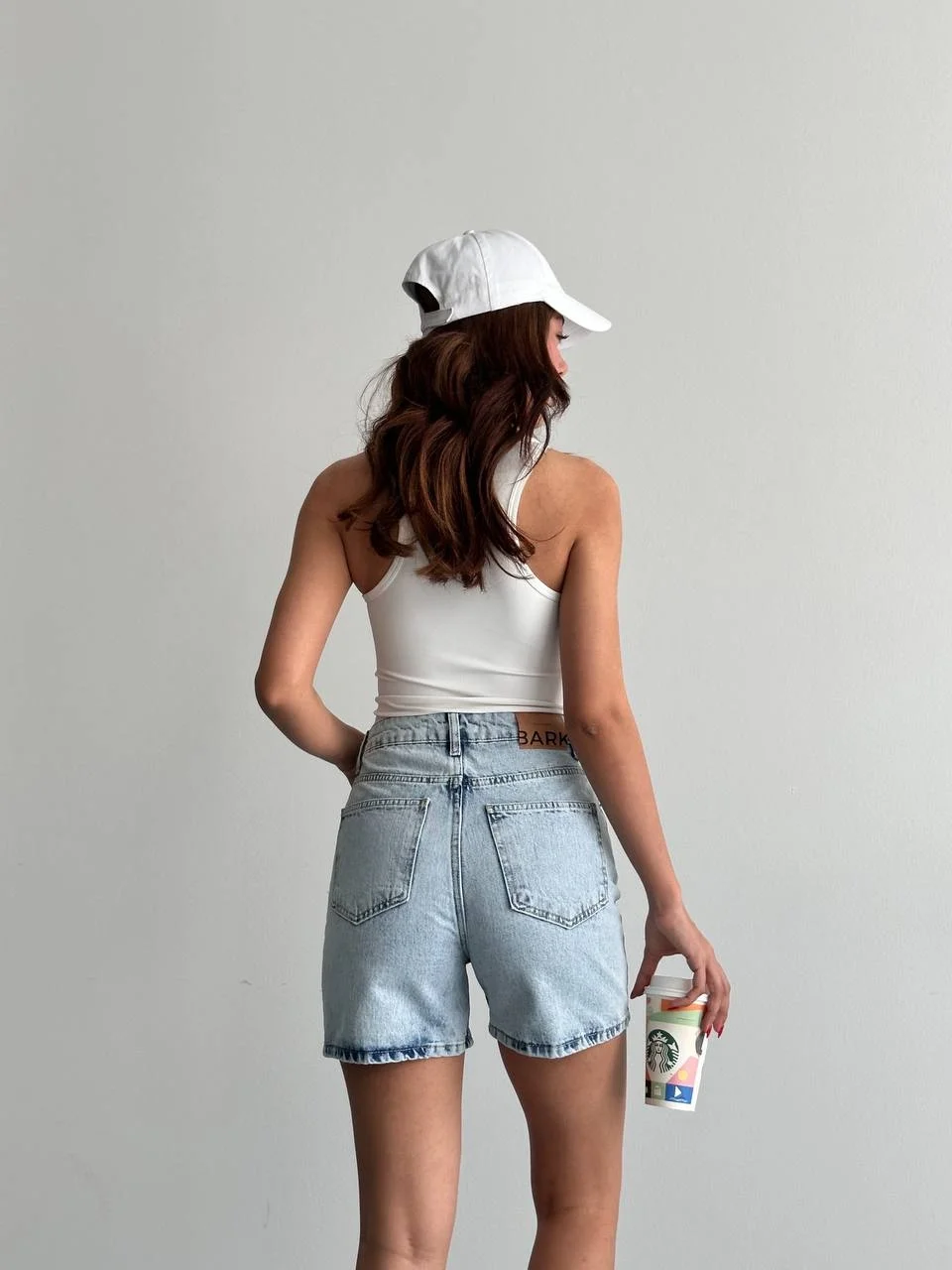 Buz Mavi Yüksek Bel Premium Denim Bermuda Şort