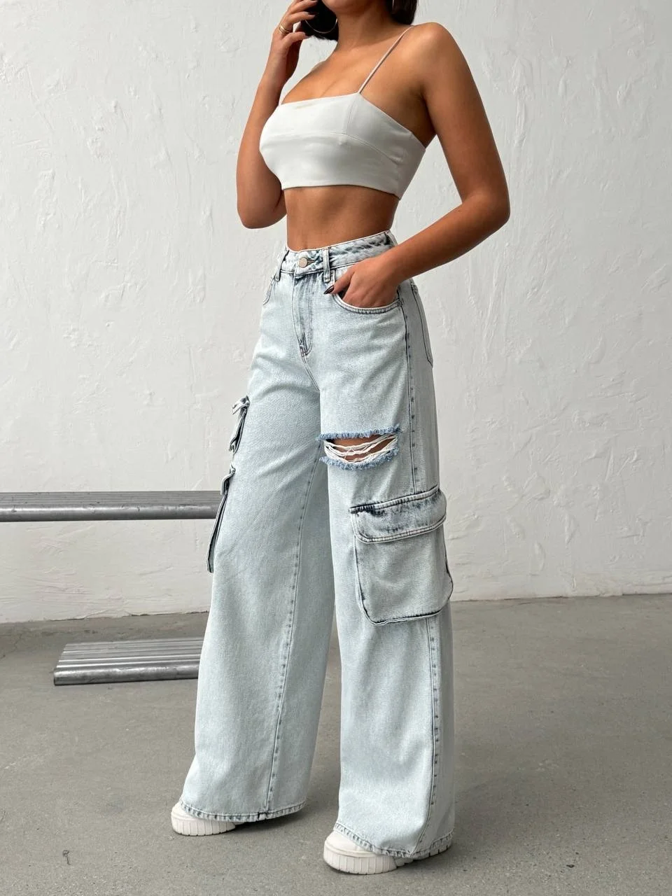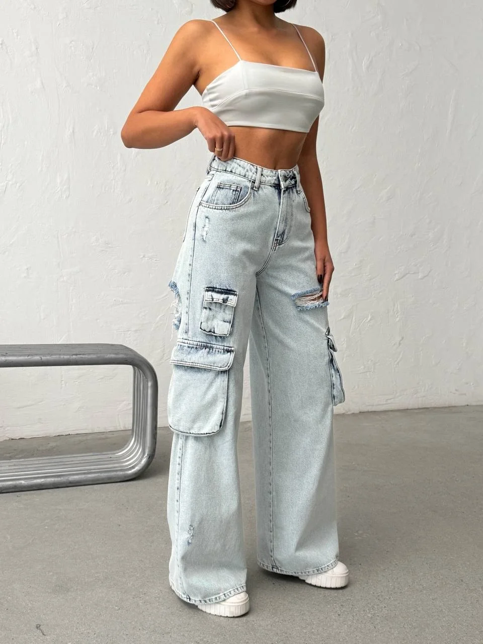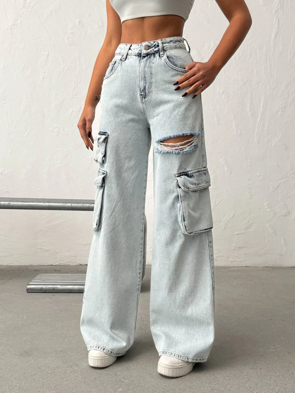 Stil Önerisi: Kargo ceplerin ve yırtıkların hacmini dengelemek için üst bedene oturan parçalarla (basic tişörtler veya crop top) eşleştirmeniz önerilir.