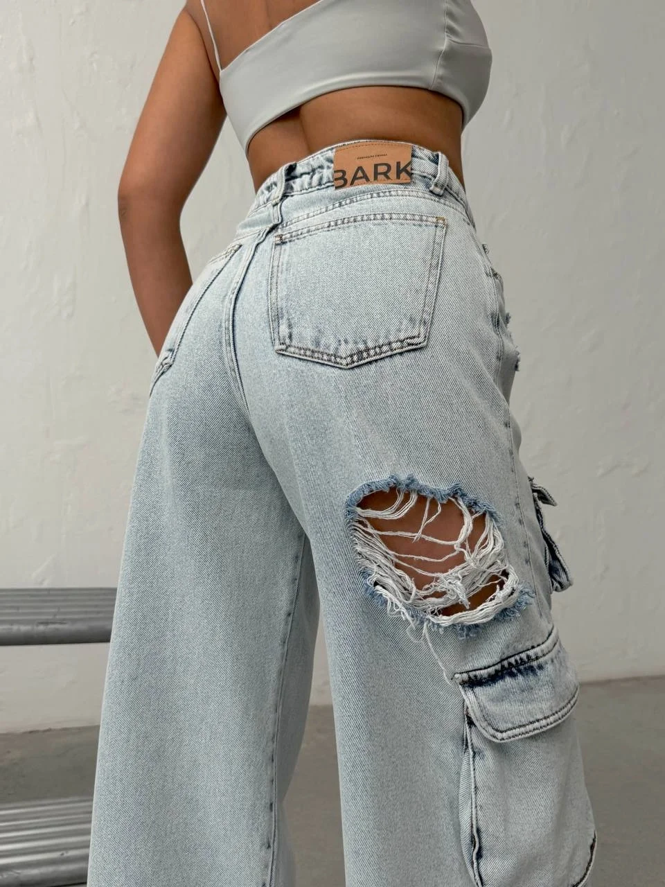 Detay: Yan bacaklarda kapaklı kargo cepler, ön ve arka bacakta geniş yırtık (distressed) detayları, arka belde BARK marka etiket