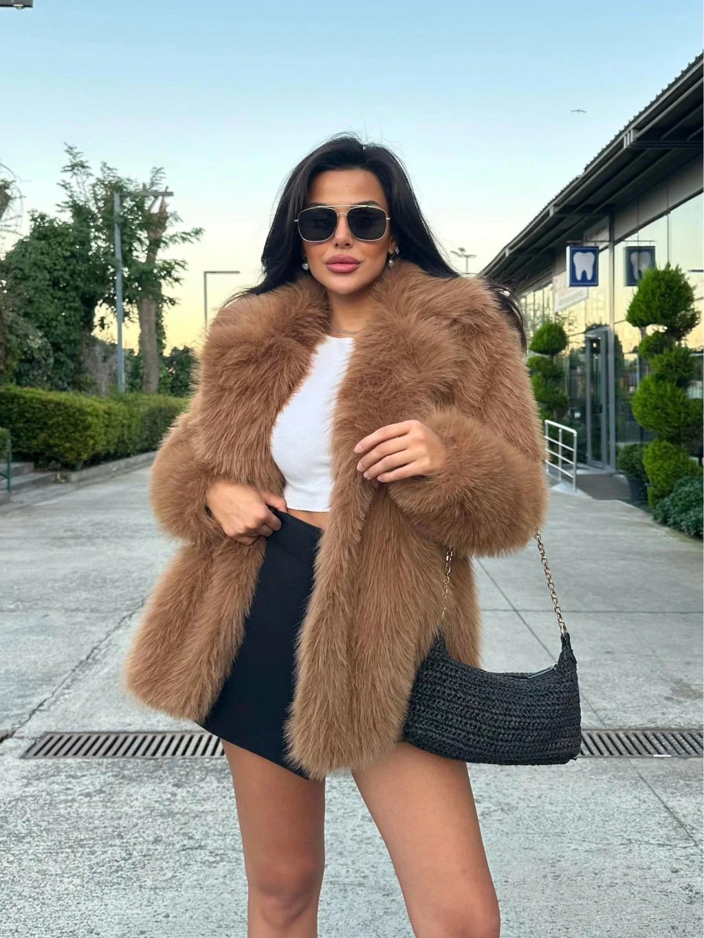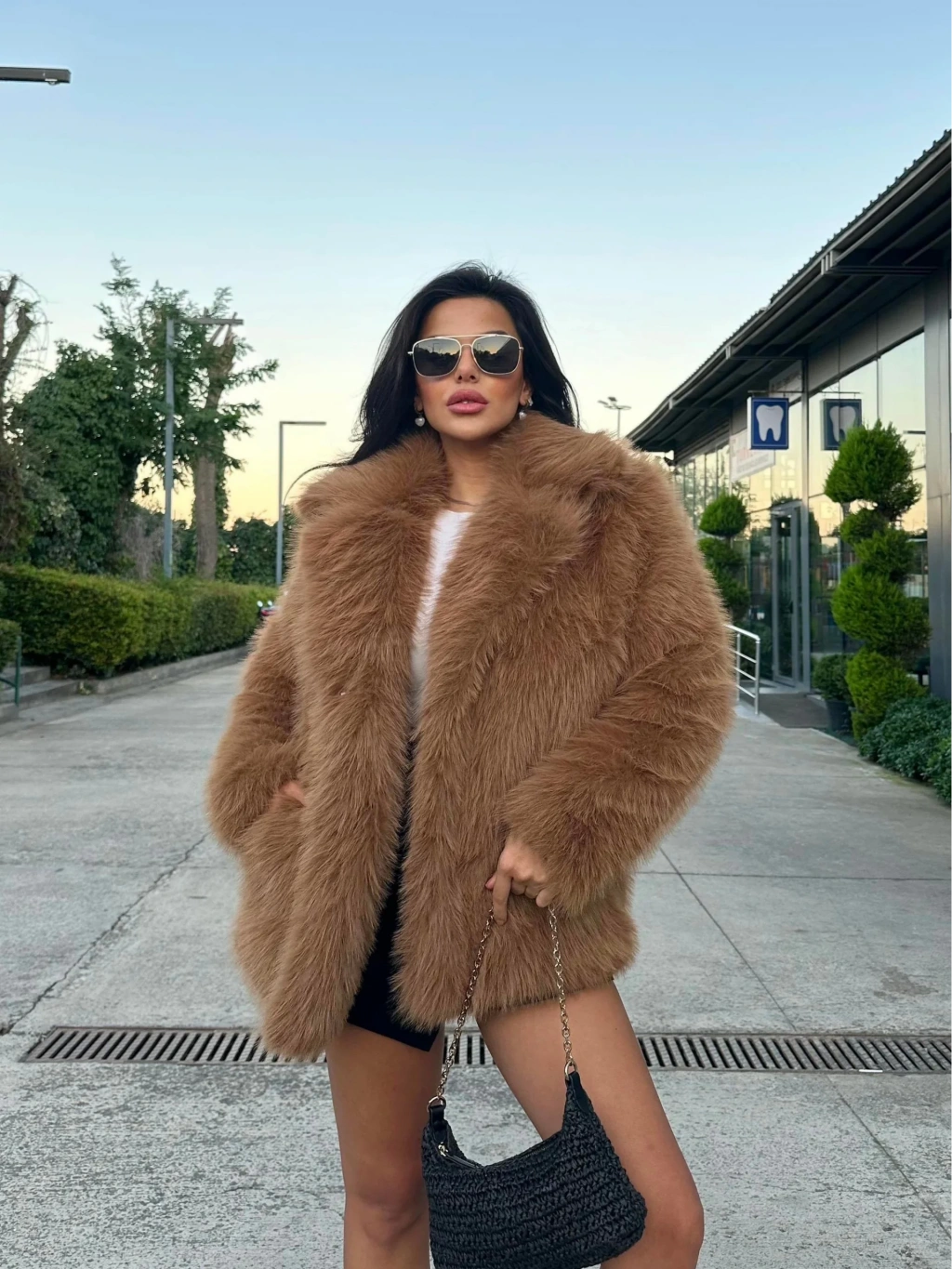 Sarı Leopar Ceket Yaka İçi Satarlı Uzun Kürk Kaban