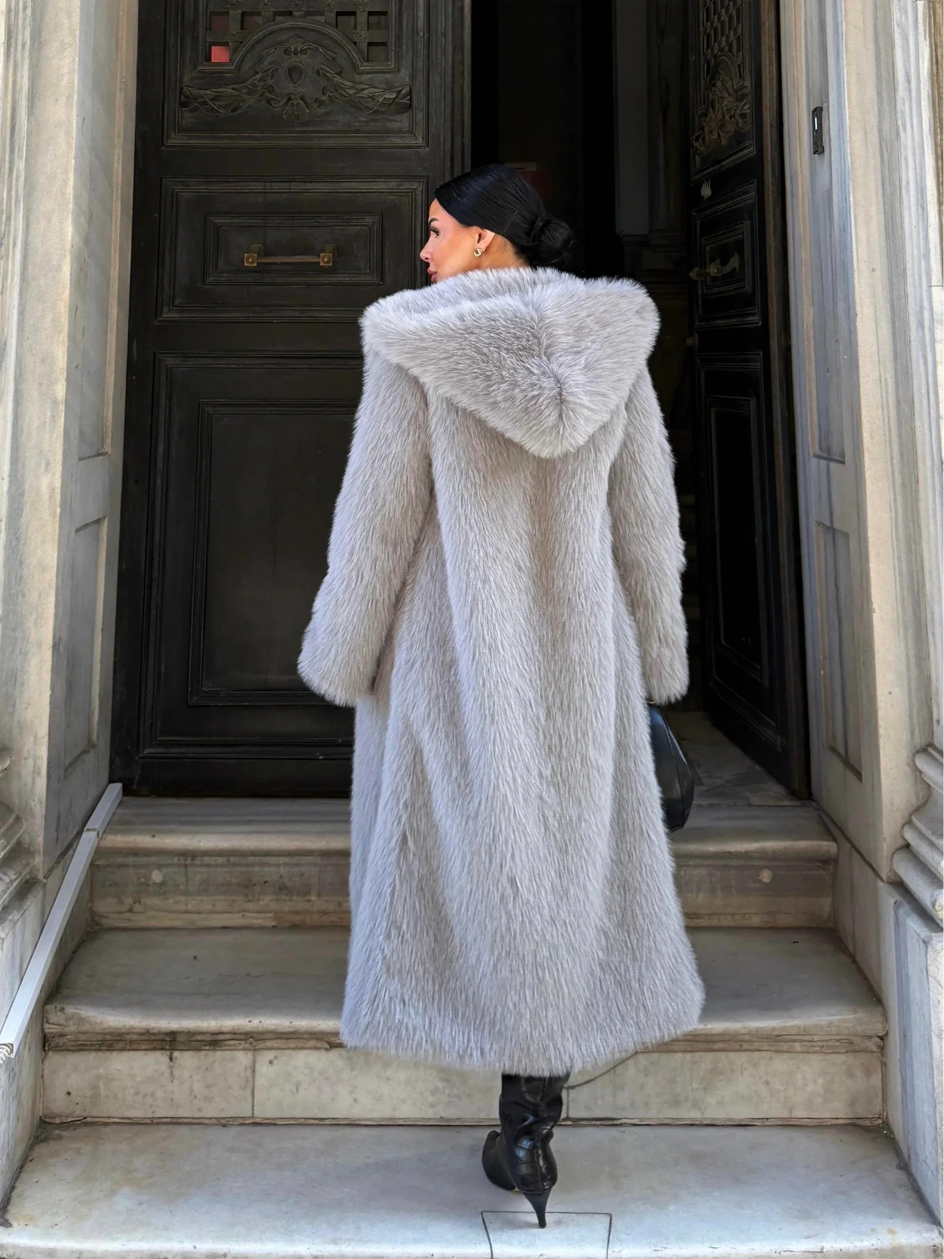 Gri Kapşonlu Uzun İthal Kürk