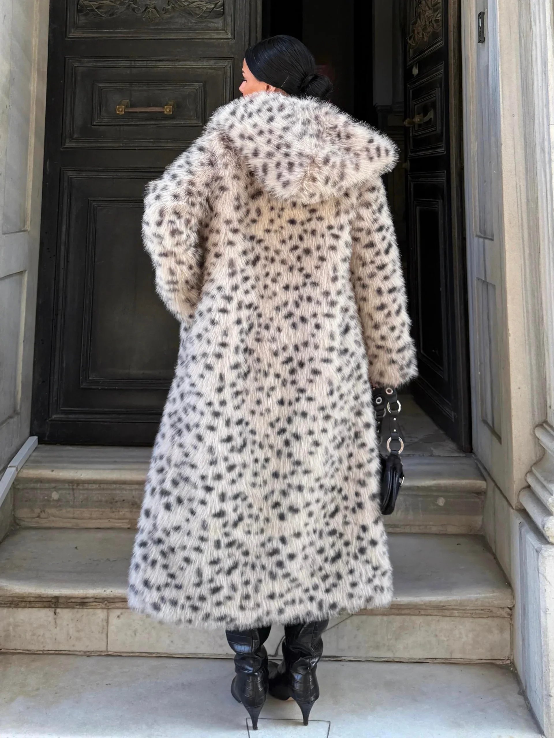 Gri Leopar Kapşonlu Uzun İthal Kürk