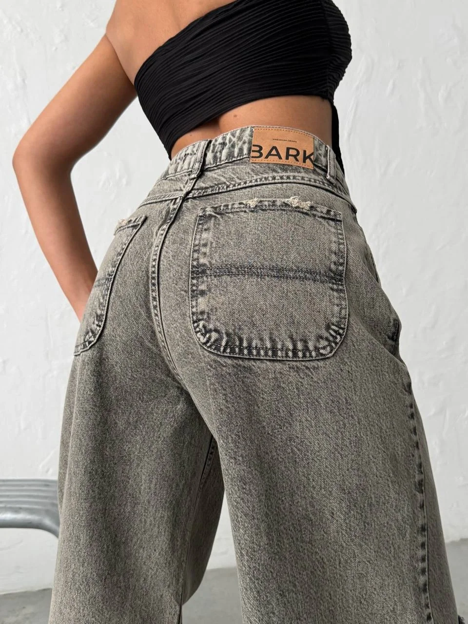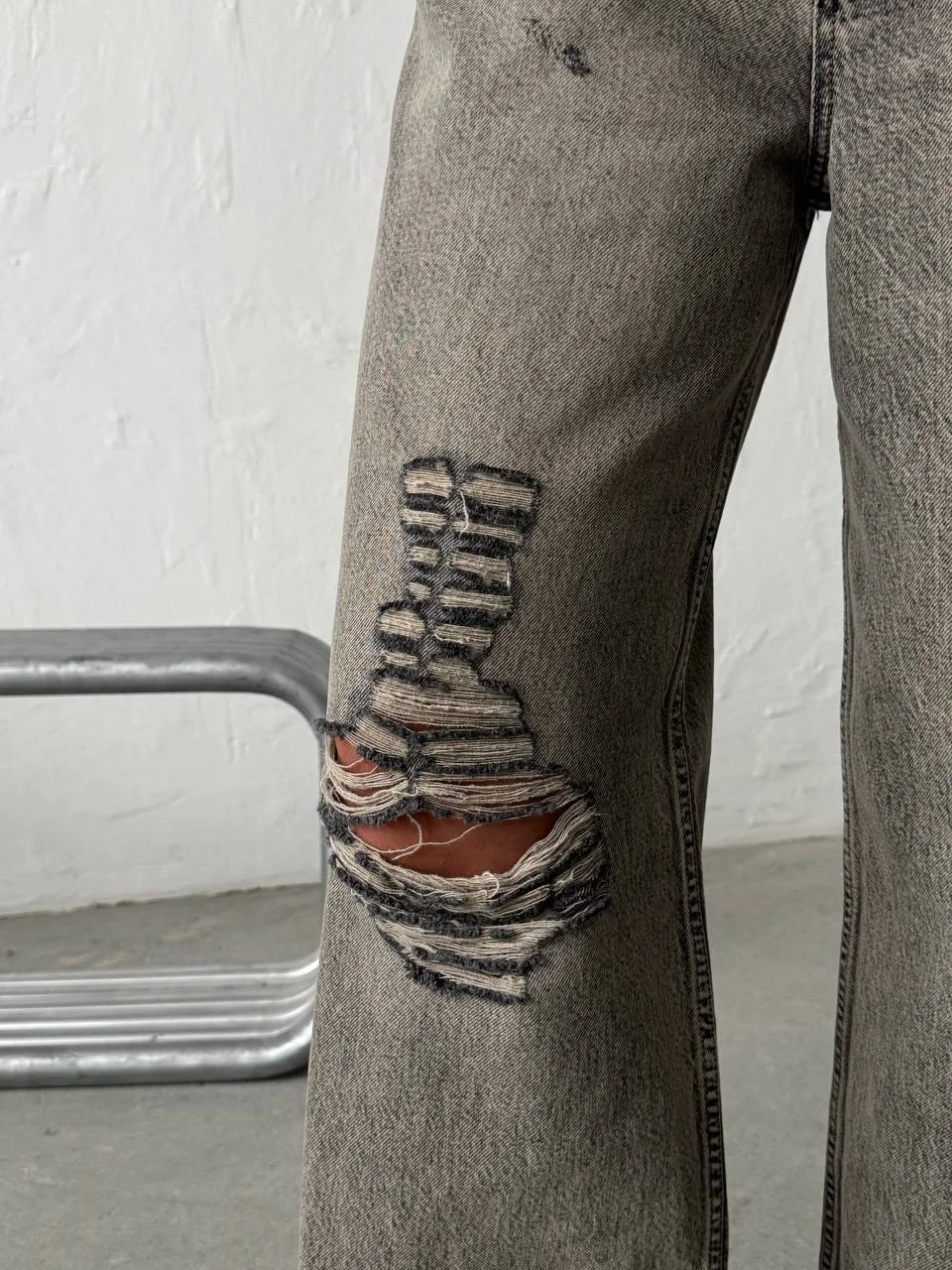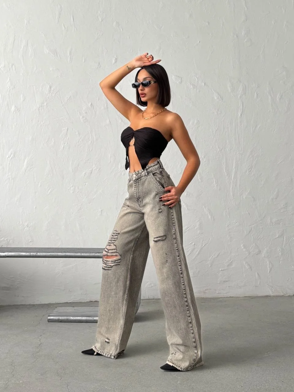 Klasik kalıpların dışına çıkmayı sevenler için tasarlanan bu asit yıkamalı gri denim pantolon, iddialı duruşuyla kombinlerinizin yıldızı olacak. Diz kısımlarındaki belirgin yırtık (distressed) detayları ve vintage eskitme görünümü, tasarıma havalı bir "grunge" havası katıyor. Yüksek bel kesimi ve dökümlü palazzo paçaları sayesinde hem modern bir silüet yaratır hem de gün boyu rahat hareket etmenizi sağlar.
