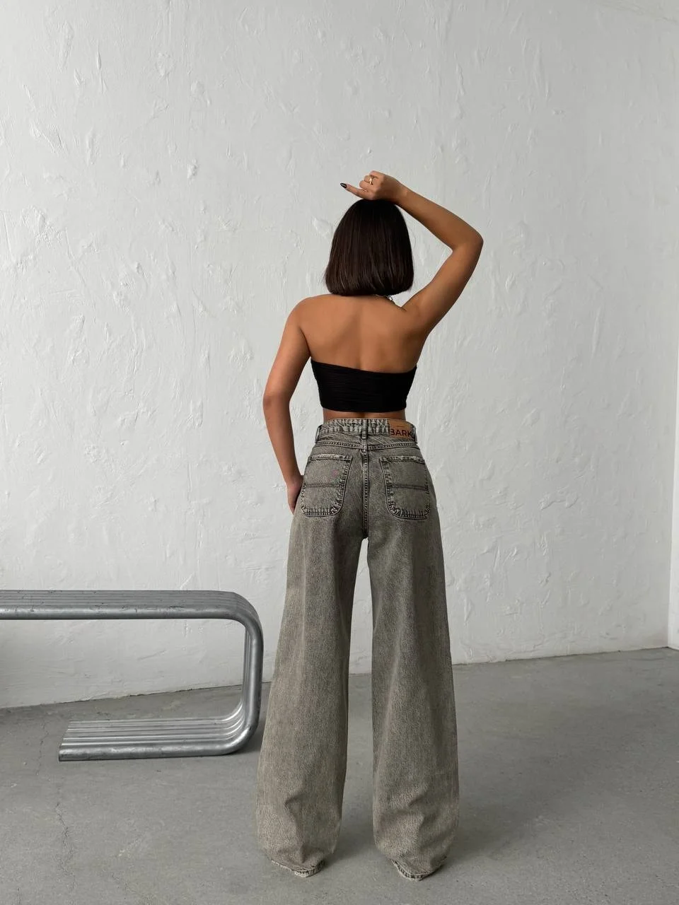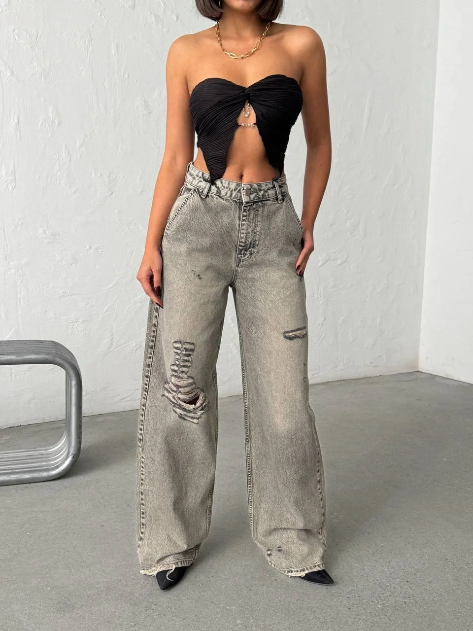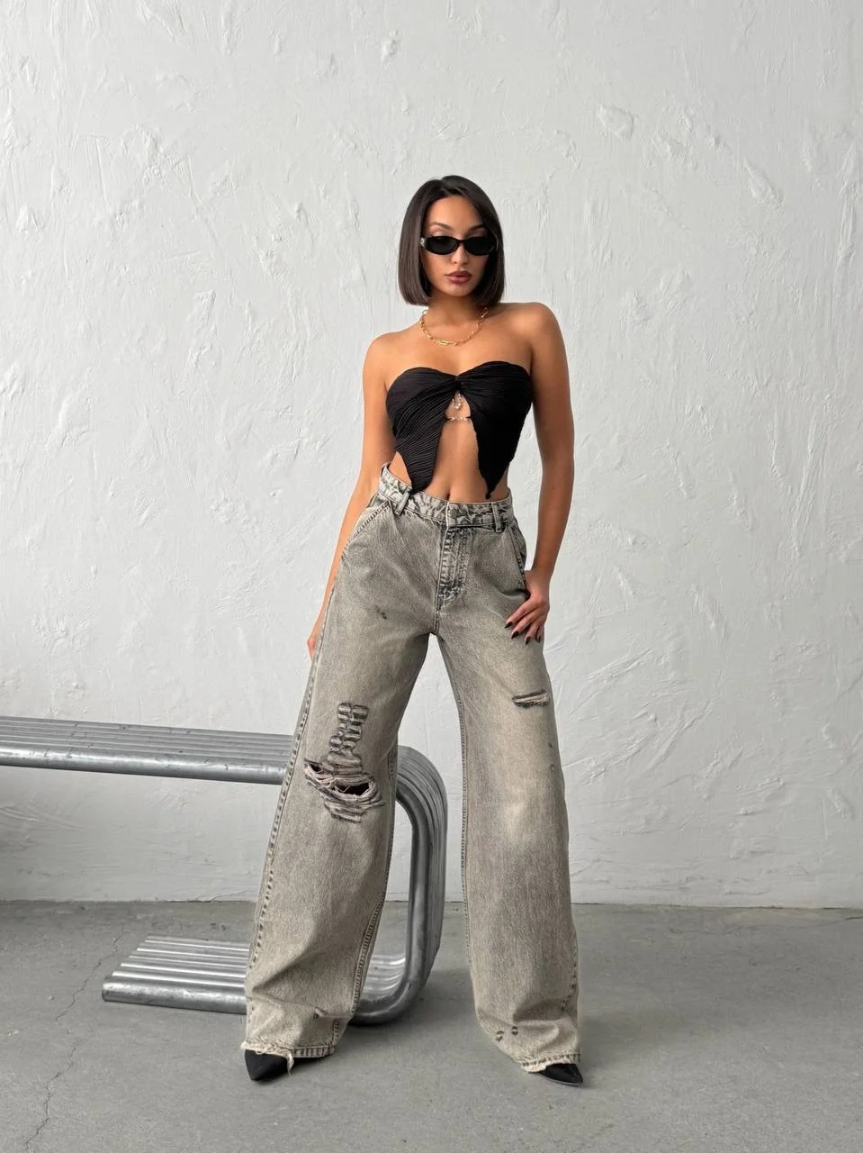 Klasik kalıpların dışına çıkmayı sevenler için tasarlanan bu asit yıkamalı gri denim pantolon, iddialı duruşuyla kombinlerinizin yıldızı olacak. Diz kısımlarındaki belirgin yırtık (distressed) detayları ve vintage eskitme görünümü, tasarıma havalı bir "grunge" havası katıyor. Yüksek bel kesimi ve dökümlü palazzo paçaları sayesinde hem modern bir silüet yaratır hem de gün boyu rahat hareket etmenizi sağlar.
