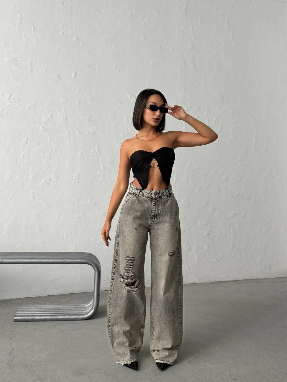 Siyah asimetrik kesim büstiyerler, zincir kolyeler ve iddialı güneş gözlükleriyle eşleştirerek görseldeki gibi kusursuz bir stil elde edebilirsiniz. Topuklu botlar veya kalın tabanlı sneaker'lar ile paça dökümünü zevkinize göre ayarlayabilir, girdiğiniz her ortamda dikkatleri üzerinize çekebilirsiniz.