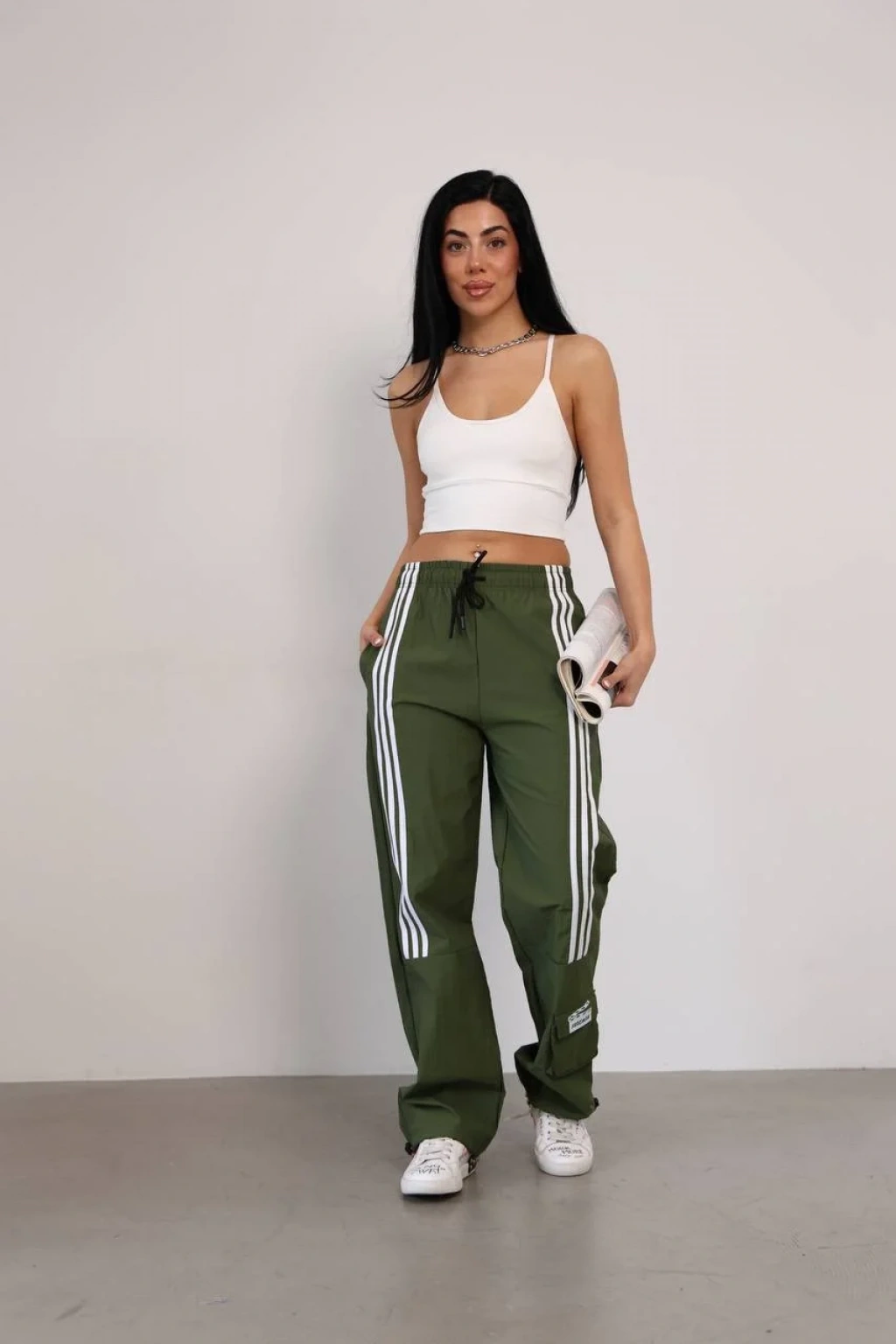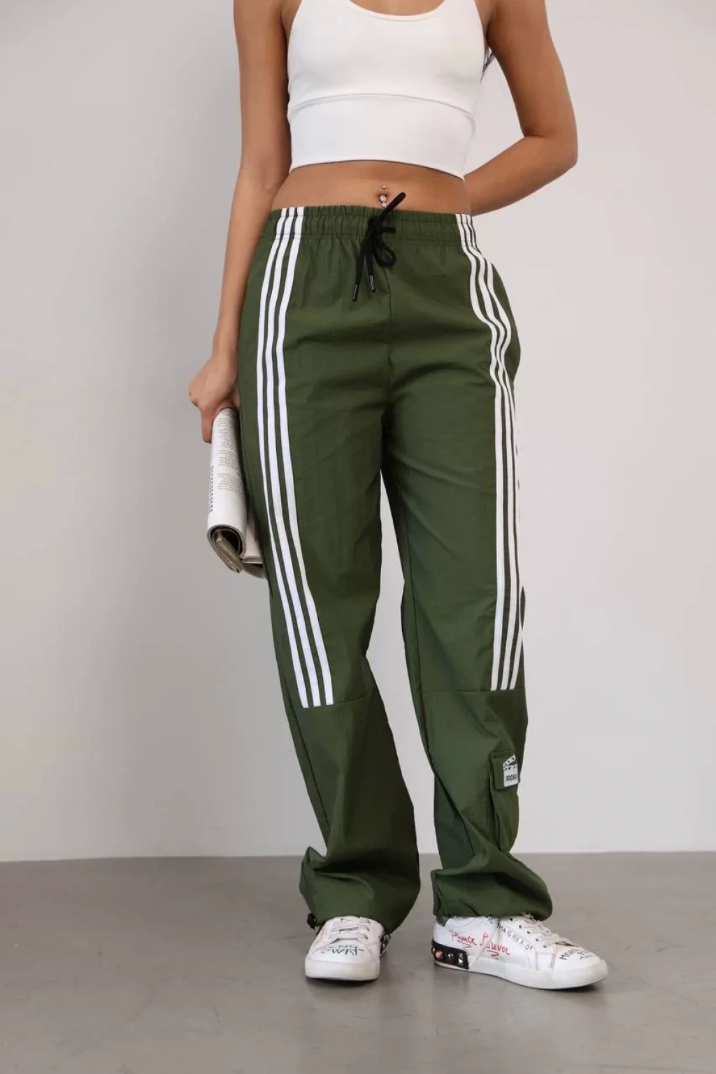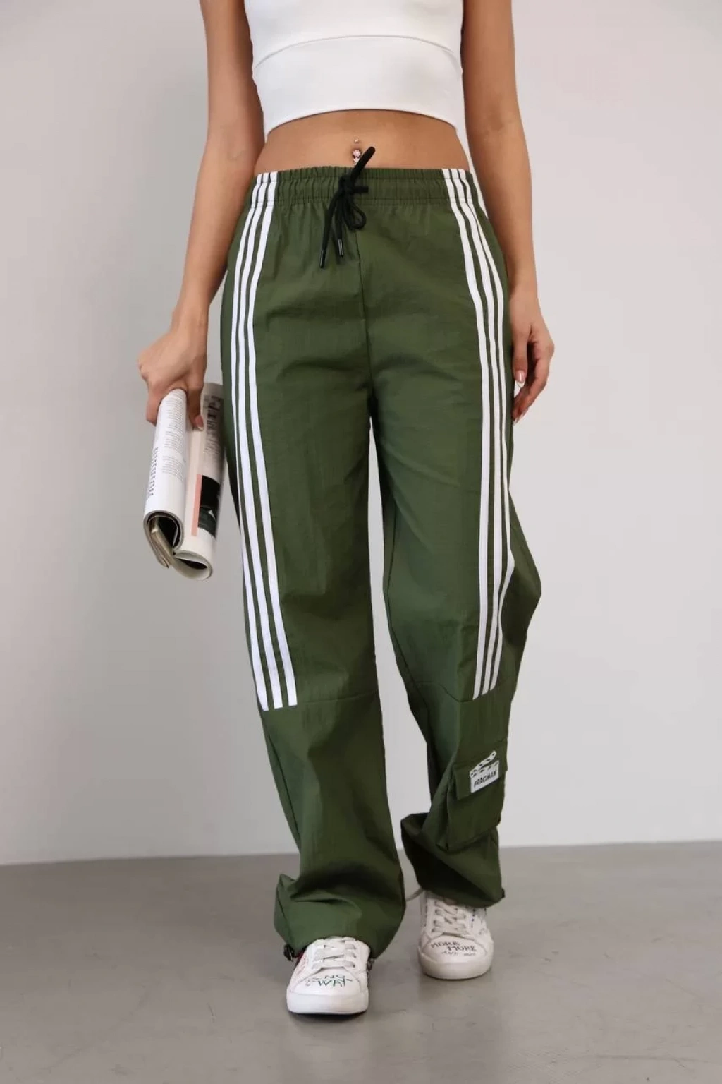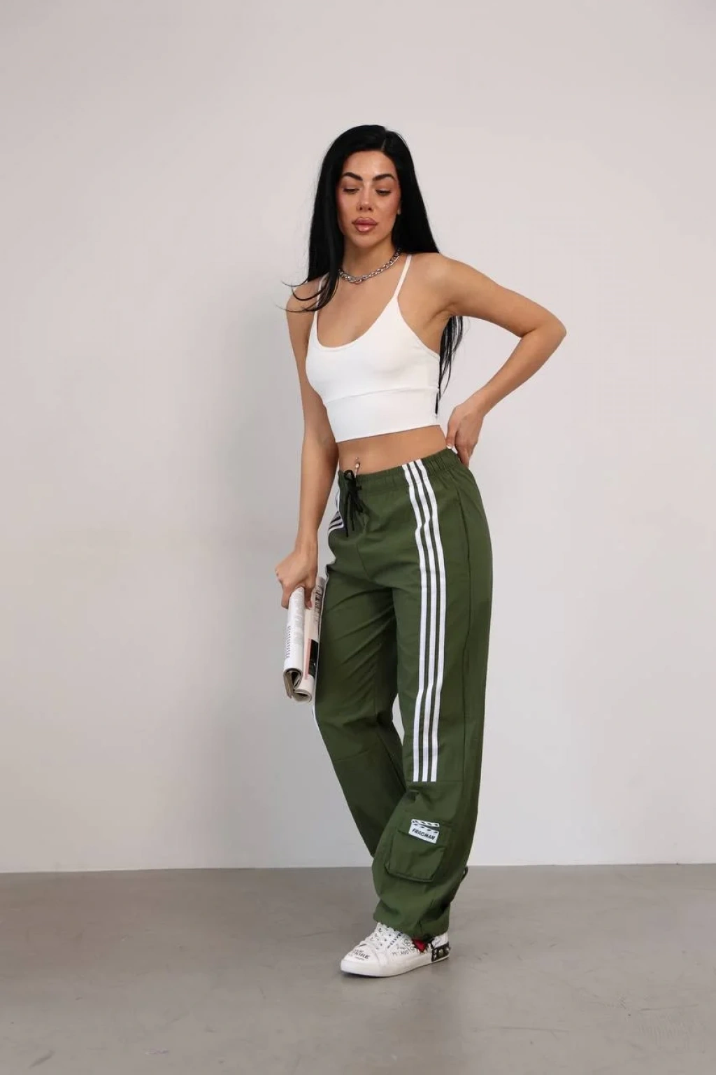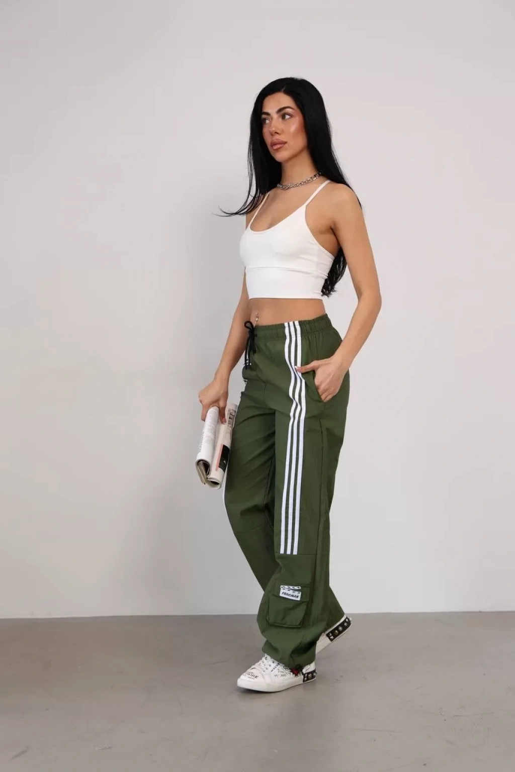 Haki Önden Üç Şerit Paça Cep Detay Paraşüt Eşofman