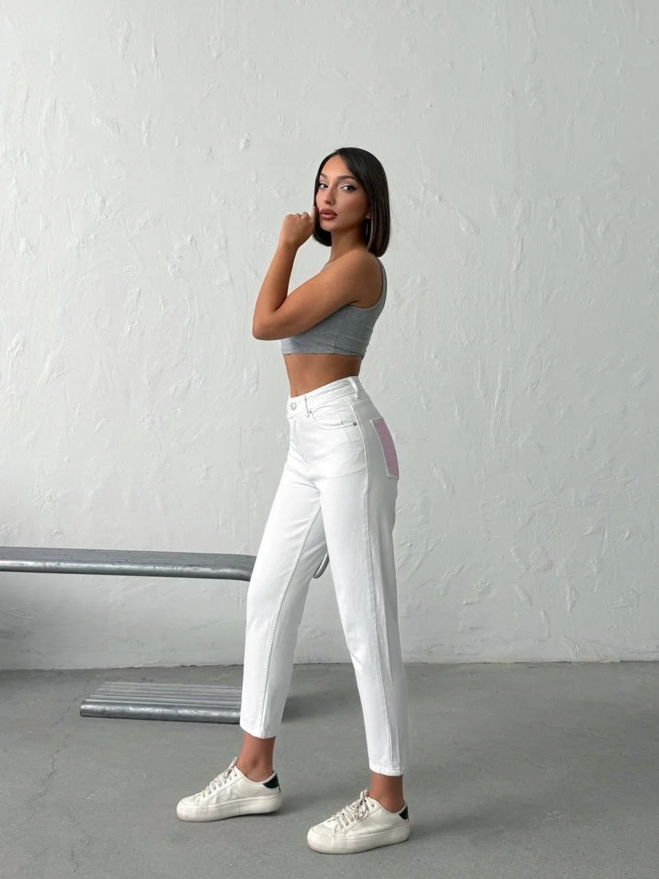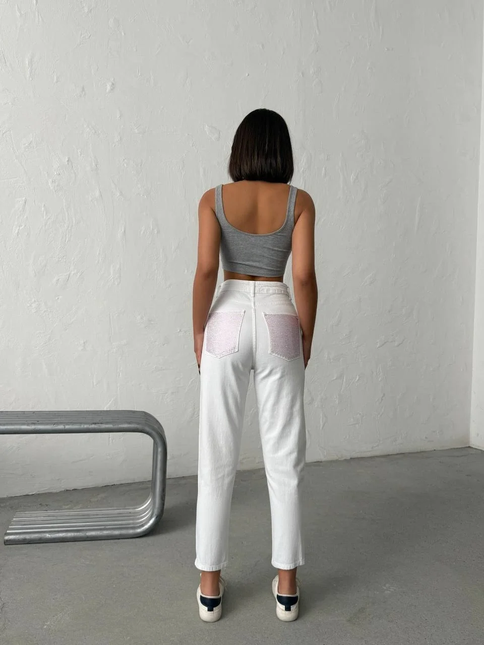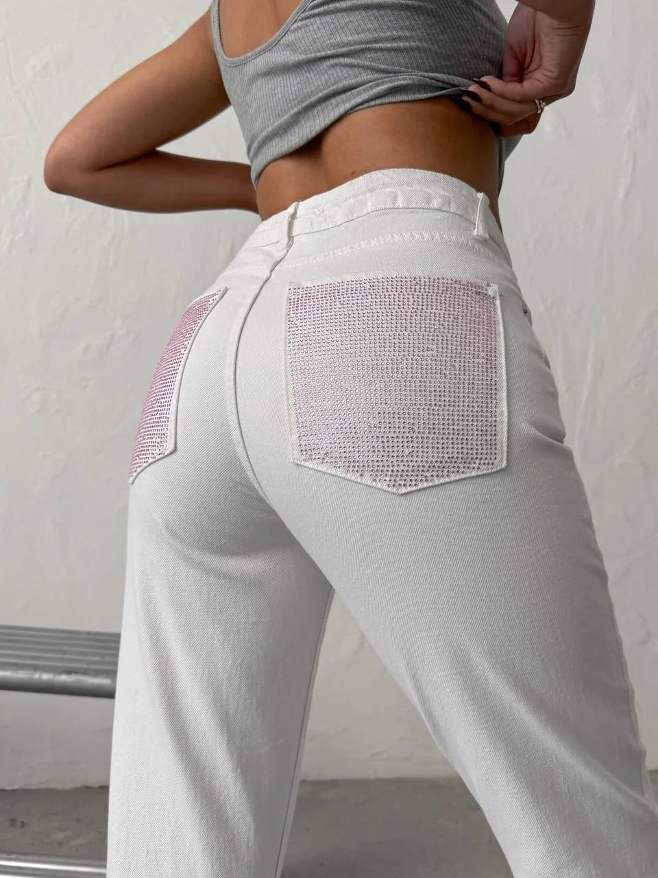 Önden bakıldığında zamansız, sade ve klasik bir beyaz jean; arkadan bakıldığında ise ışıltısıyla göz kamaştıran iddialı bir tasarım! Yüksek bel kesimi ve bilekte biten konforlu kalıbıyla vücut hatlarınızı kusursuzca toparlayan bu pantolon, arka ceplerindeki yoğun pembe taş (kristal) işlemeleriyle stilinize eğlenceli ve feminen bir dokunuş katıyor.
