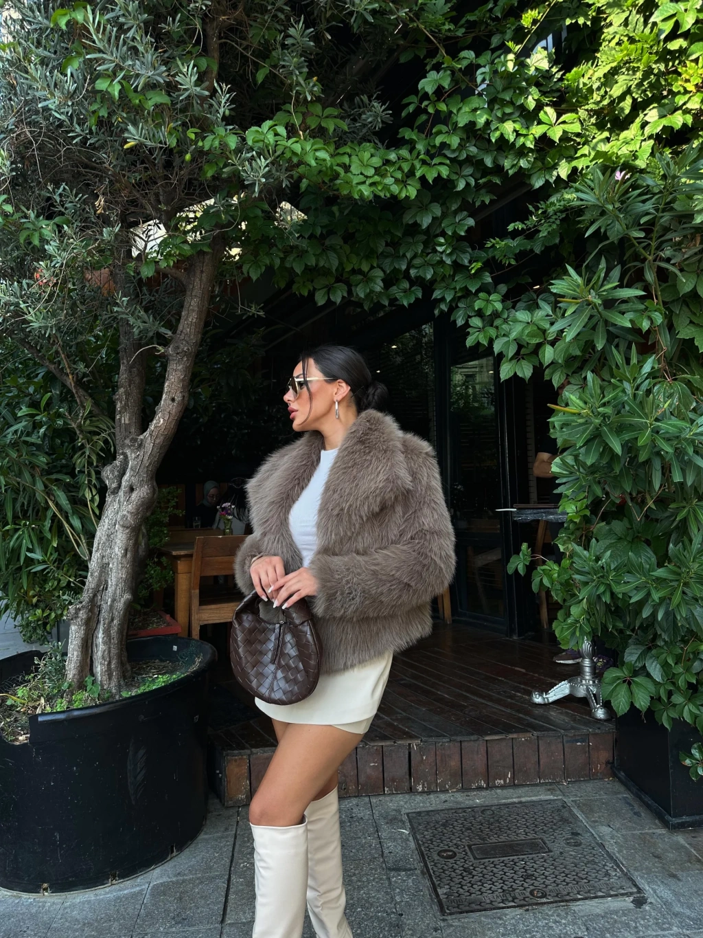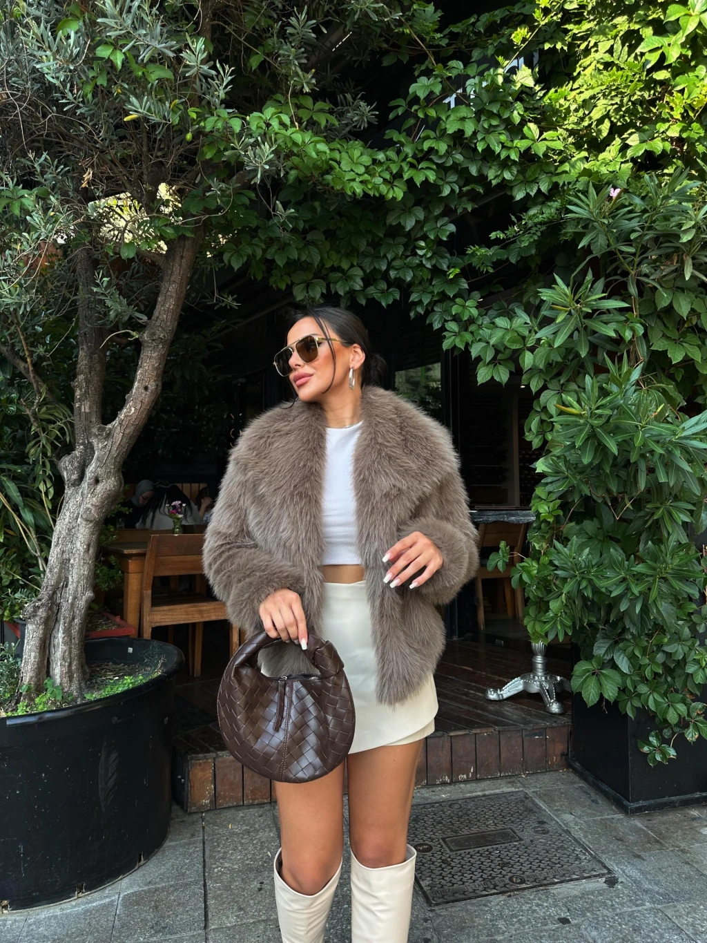 Bej Şal Yaka İçi Astarlı Kürk Kaban