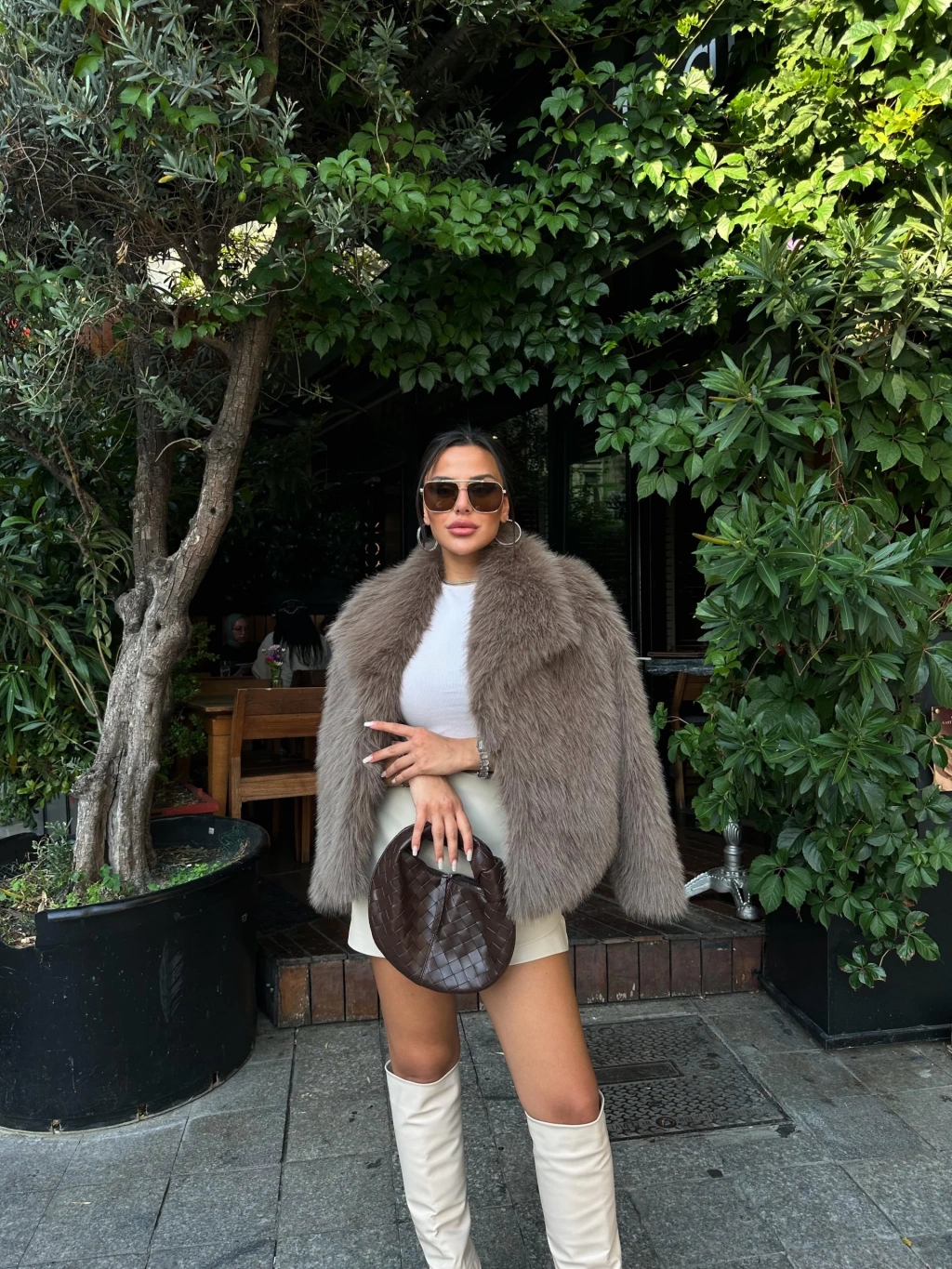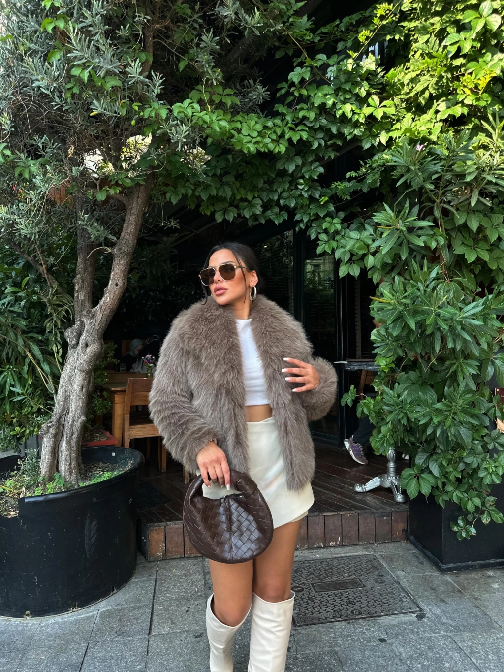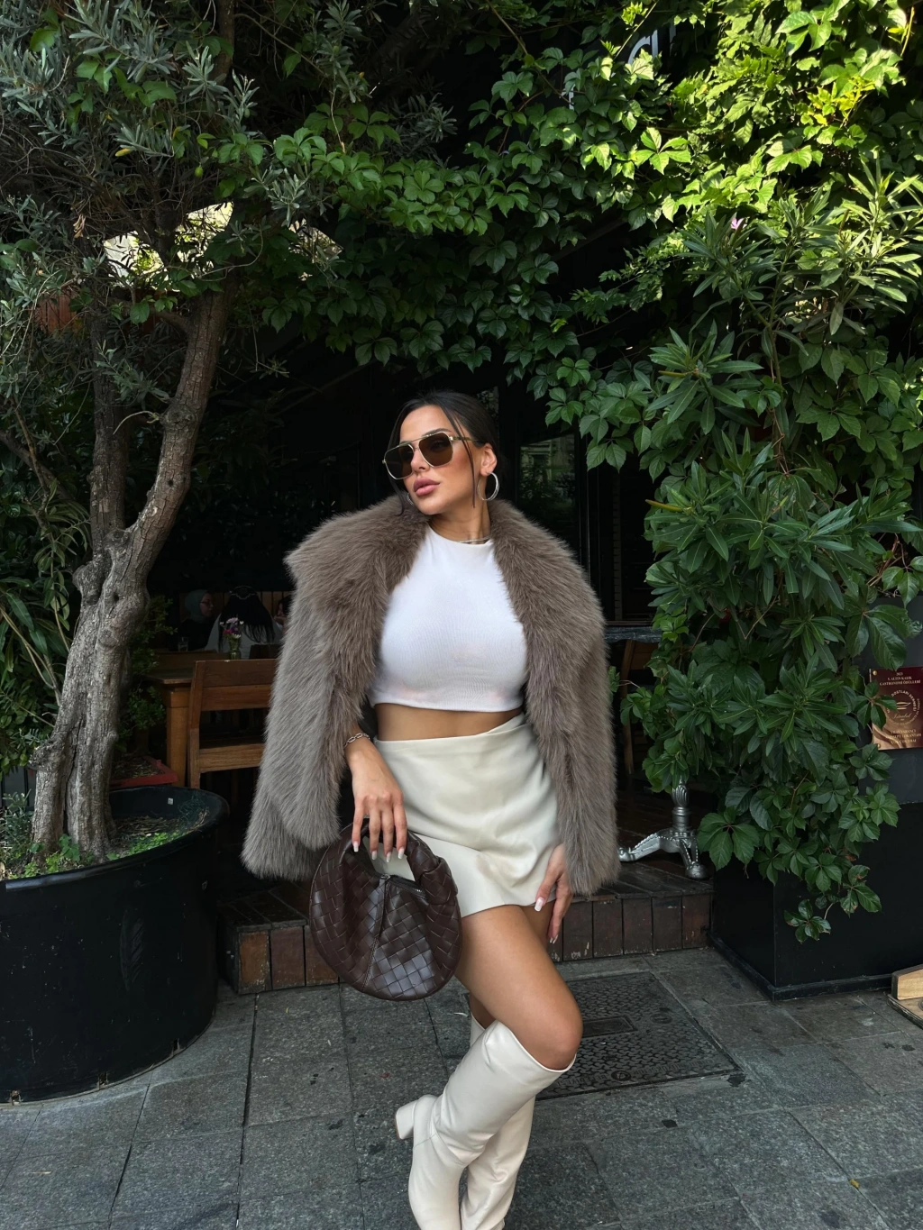 Beyaz Leopar Ceket Yaka İçi Satarlı Uzun Kürk Kaban