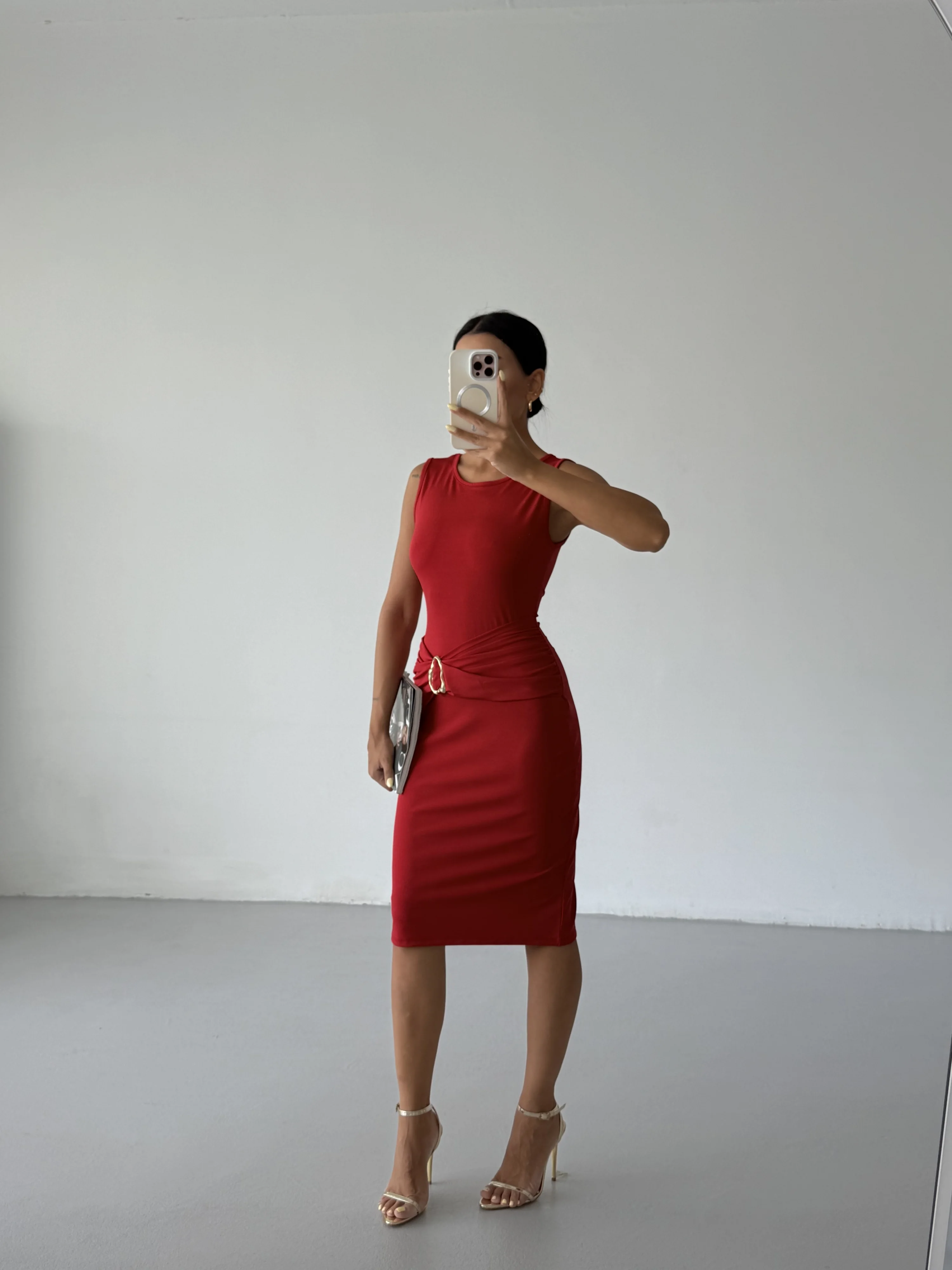 • Kırmızı Toka Detay Midi Boy Dalgıç Elbise