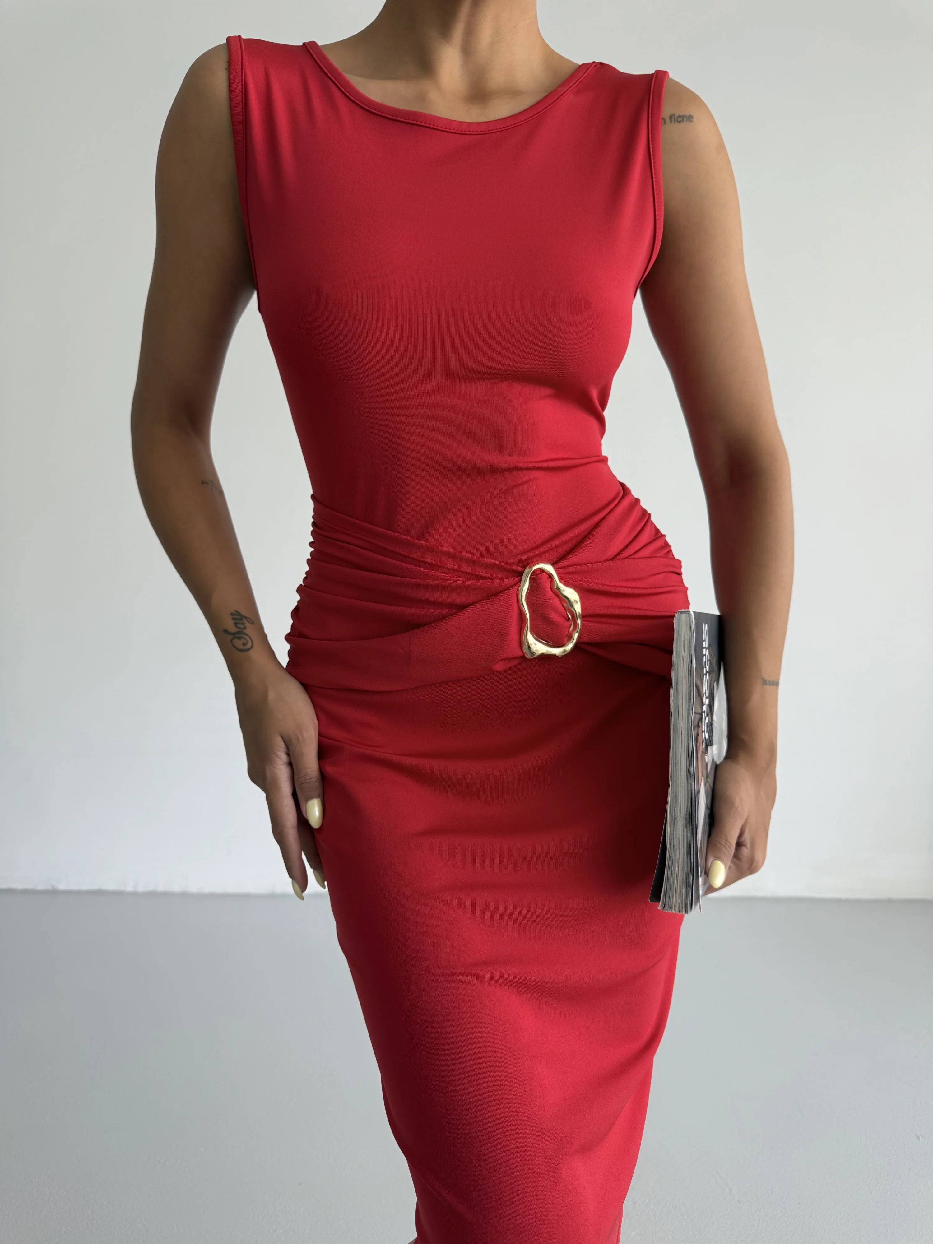 Kırmızı Toka Detay Midi Boy Dalgıç Elbise