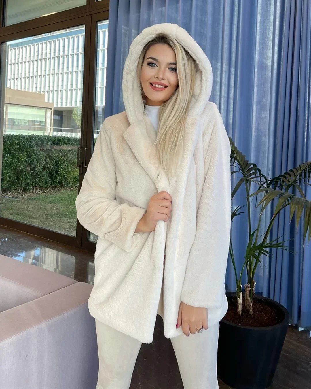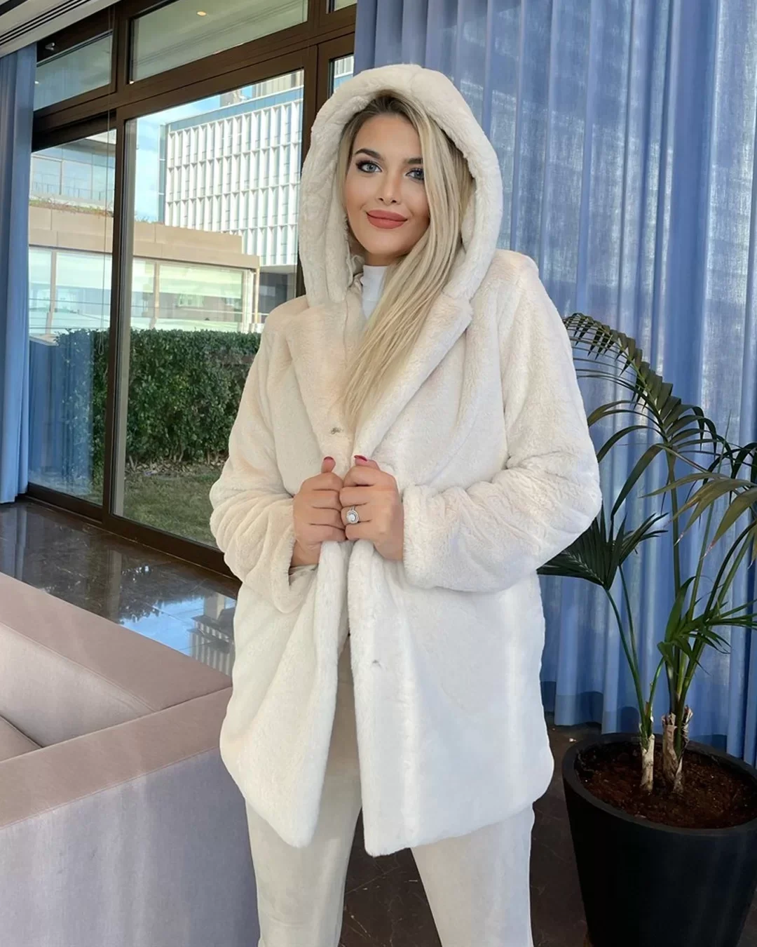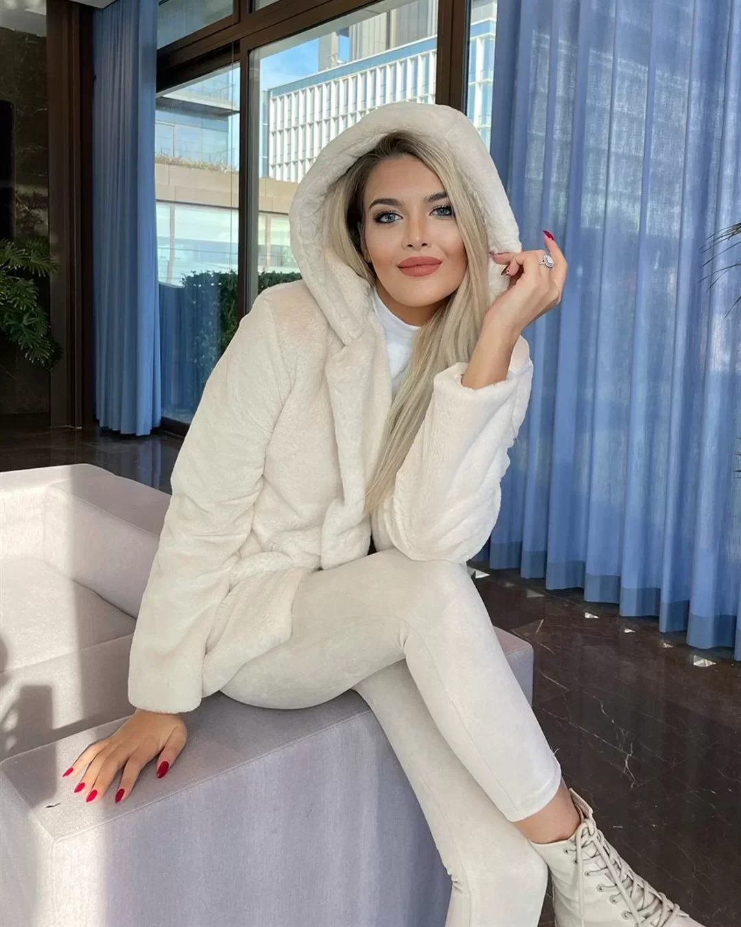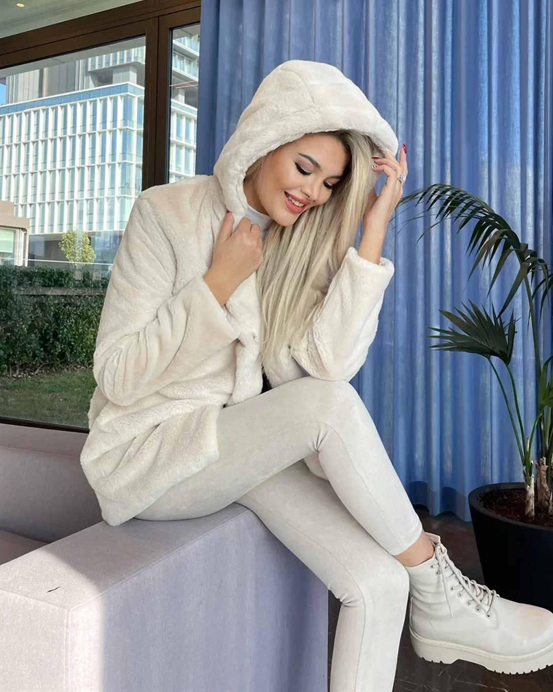 • Krem Kapşonlu İçi Astarlı Rabbit Peluş Kaban