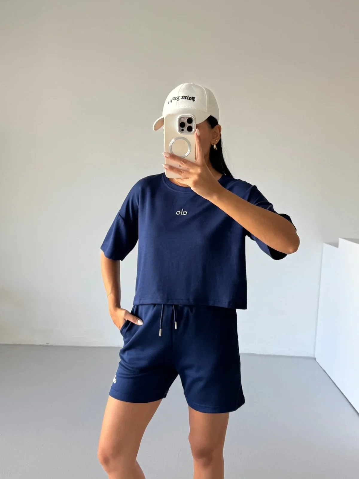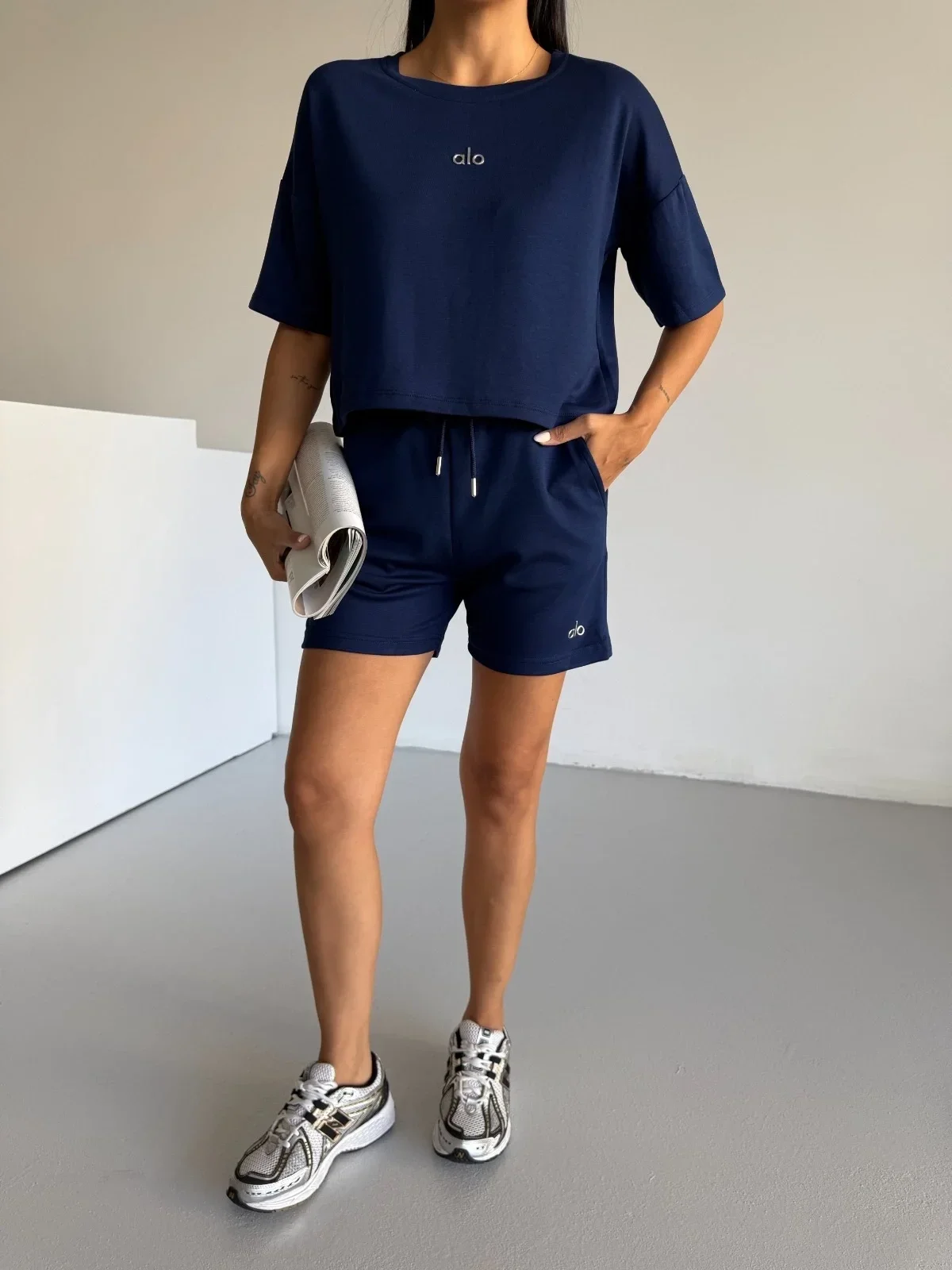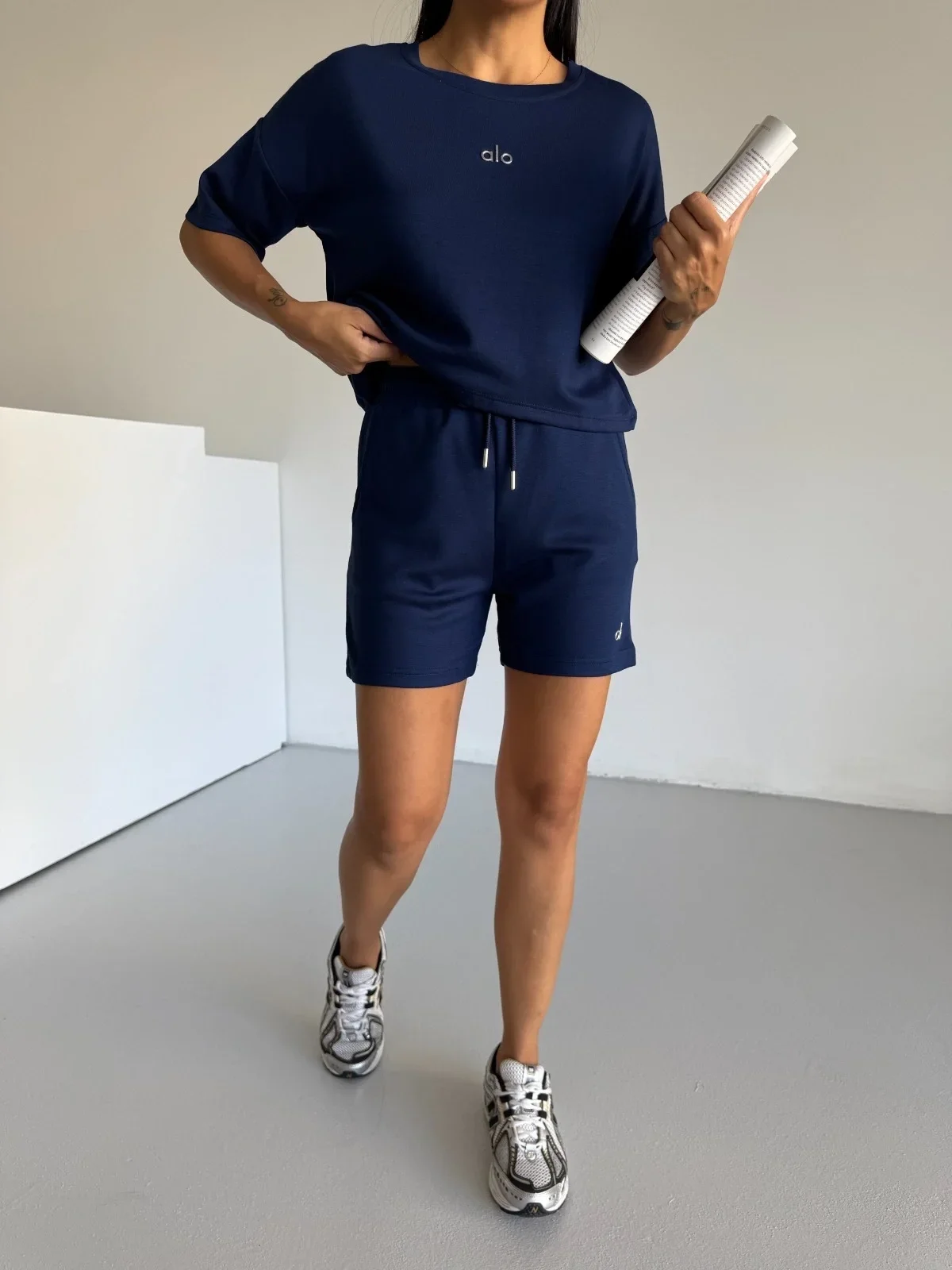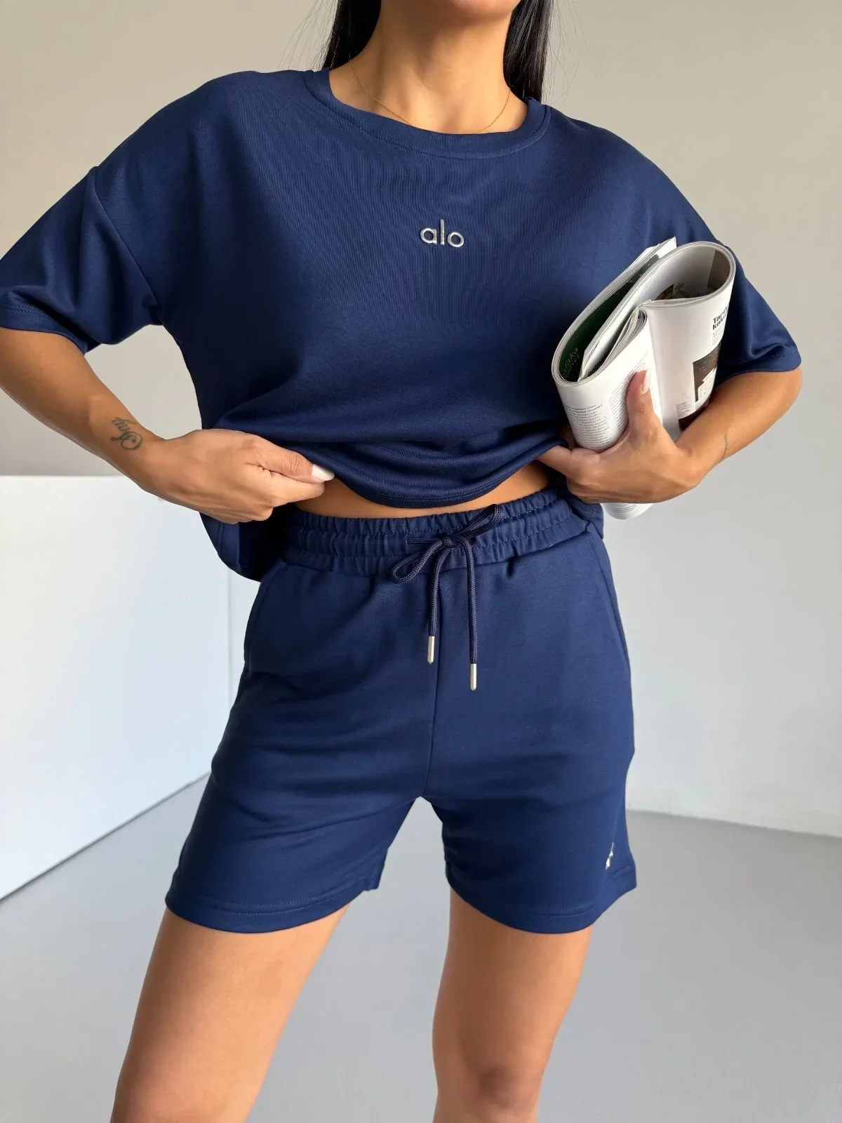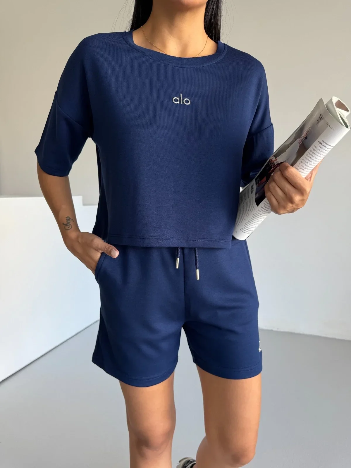 Lacivert Alo Yoga Modal Crop Şortlu Takım