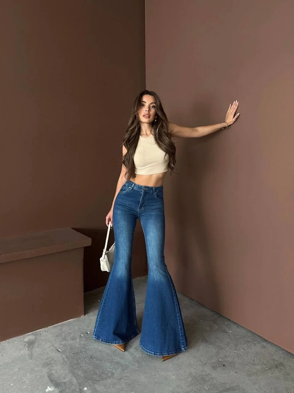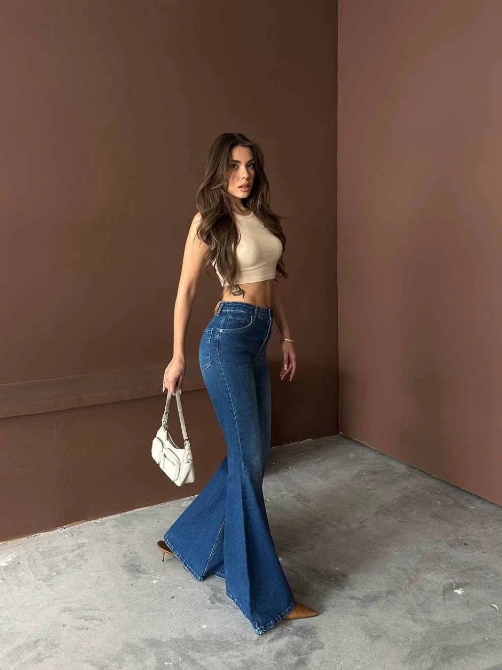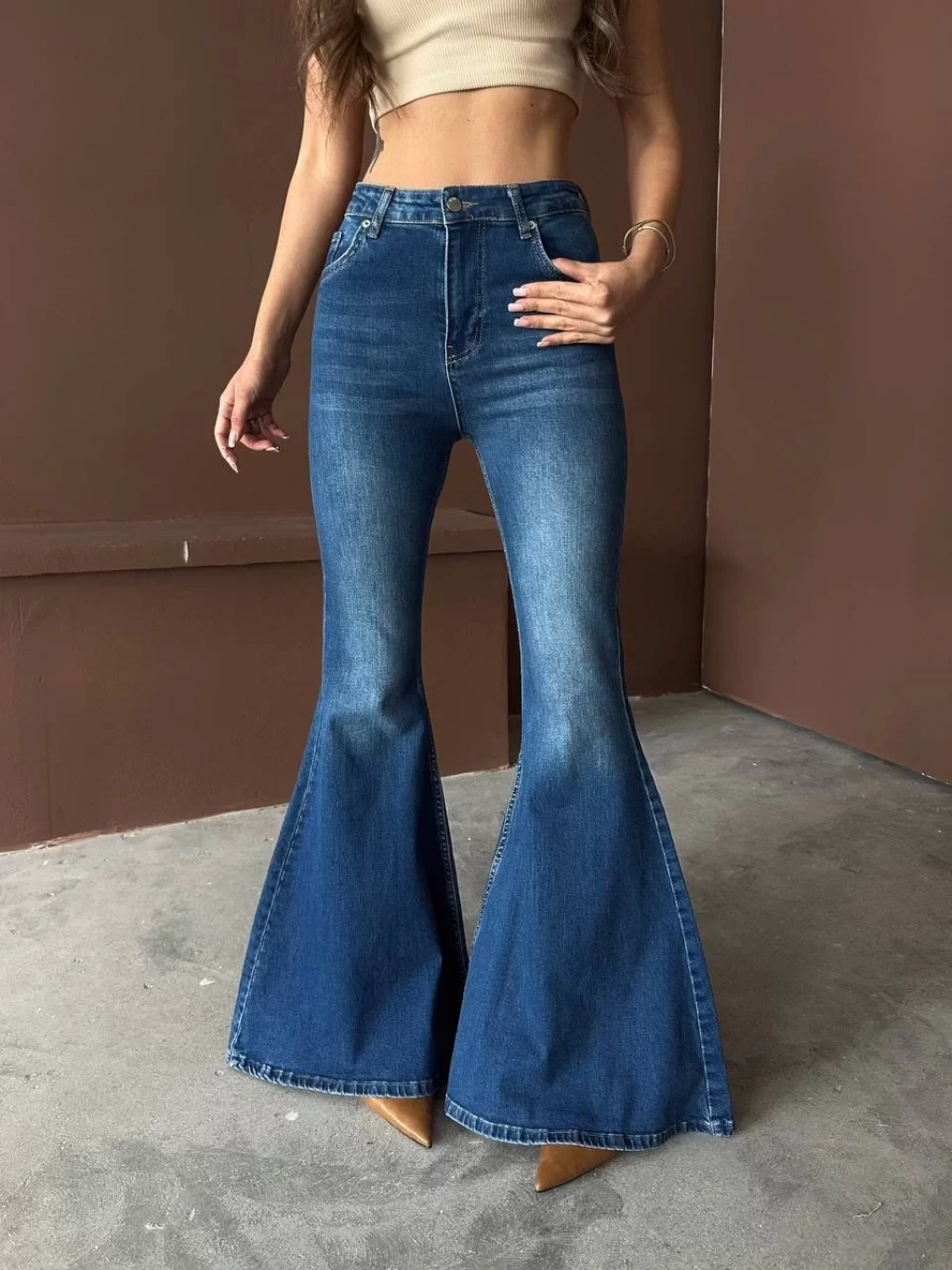 Modaskop'un mavi İspanyol paça likralı kot pantolonu şıklığı ve rahatlığı bir arada sunar.