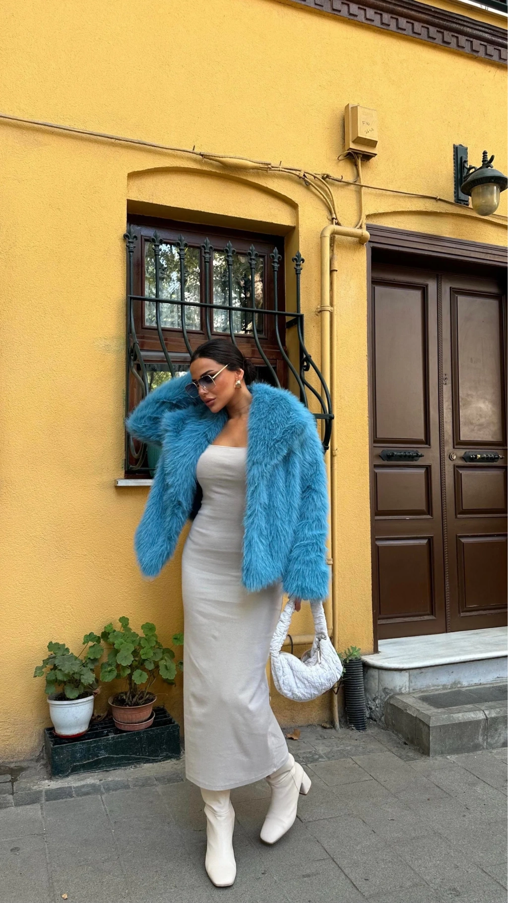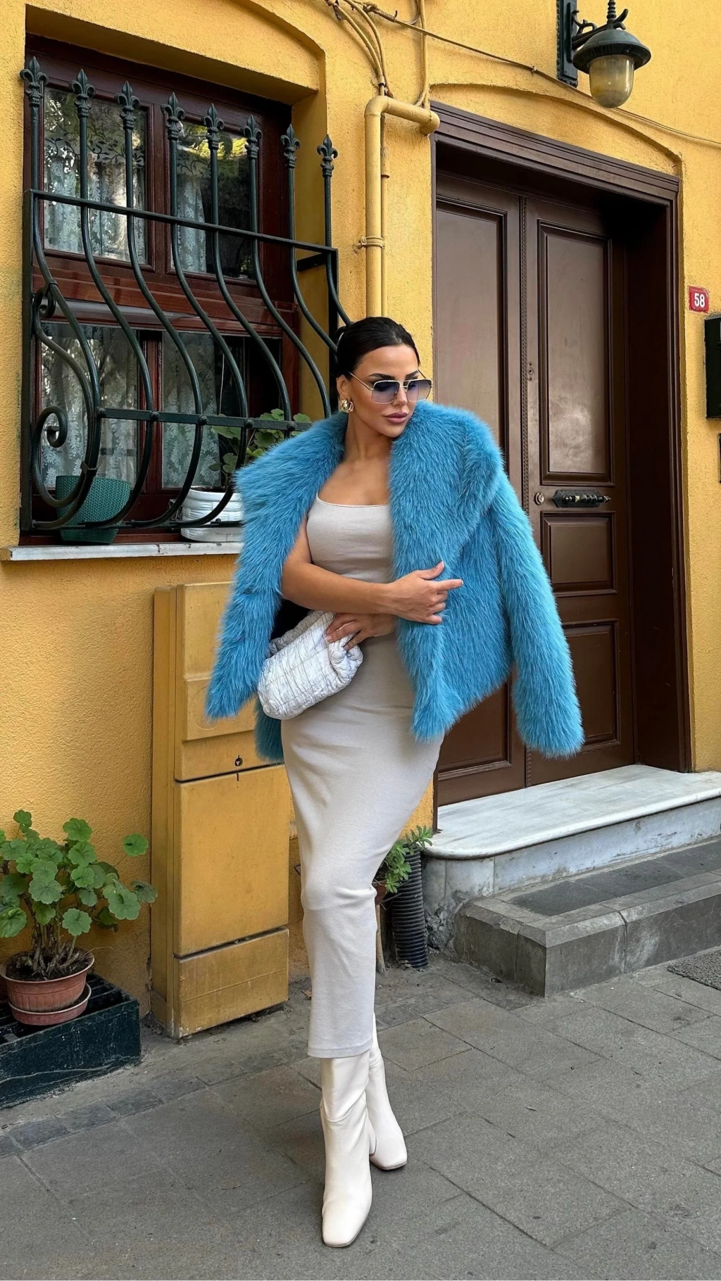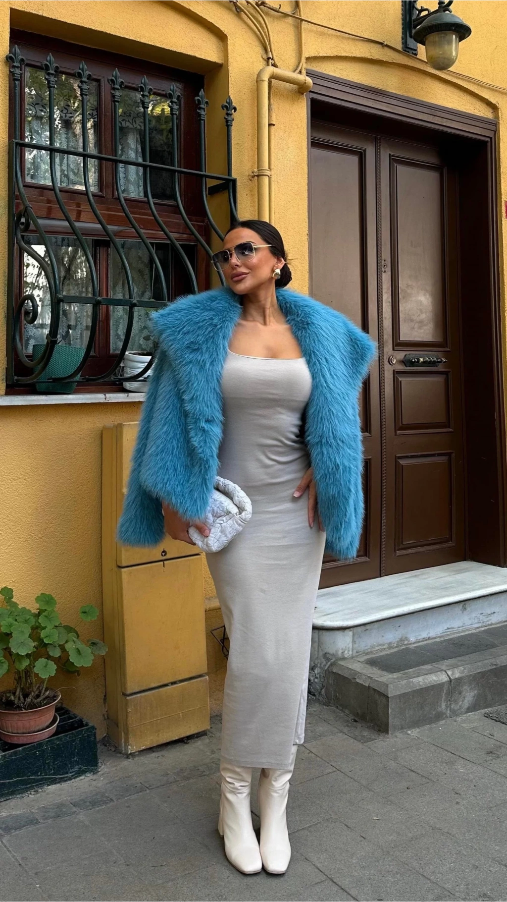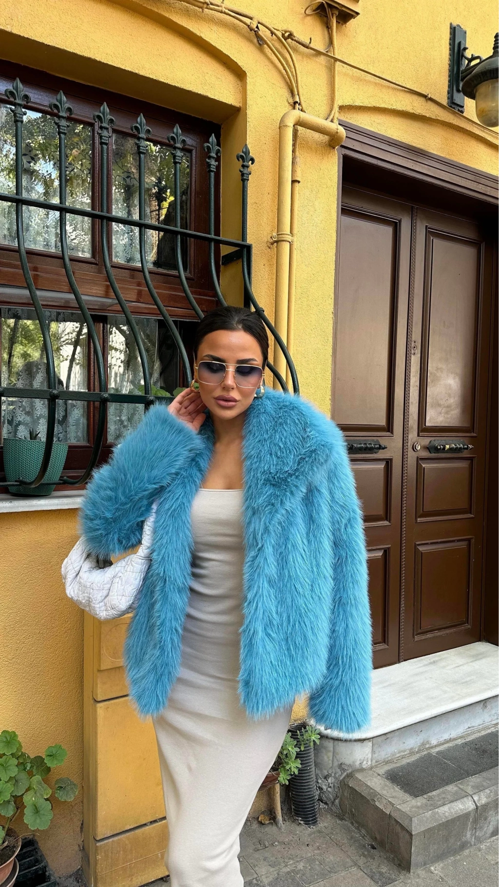 Mavi Şal Yaka İçi Astarlı Kürk Kaban