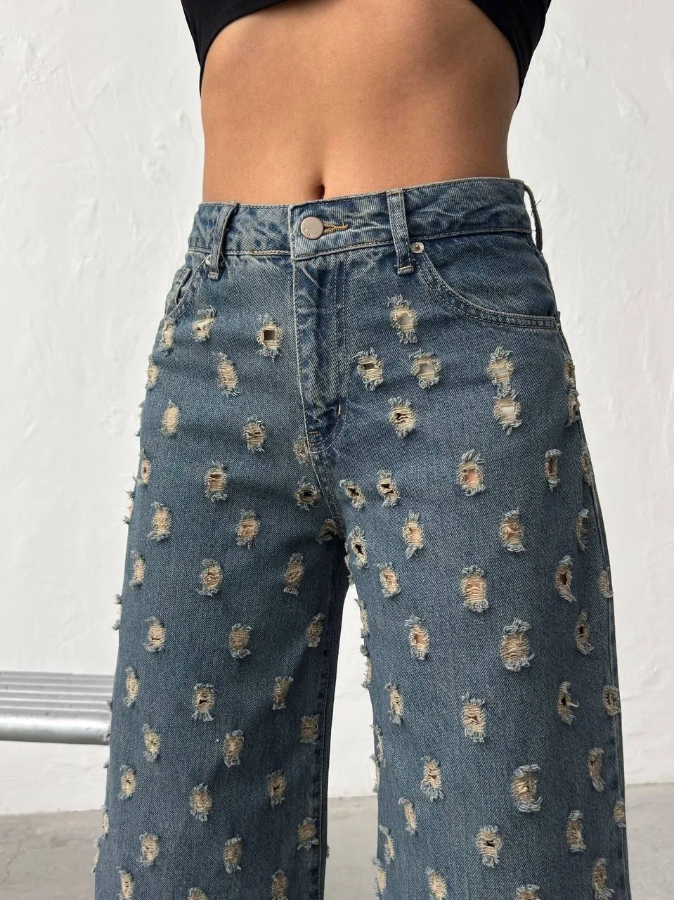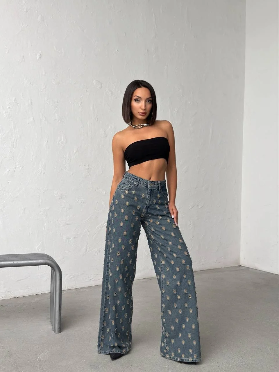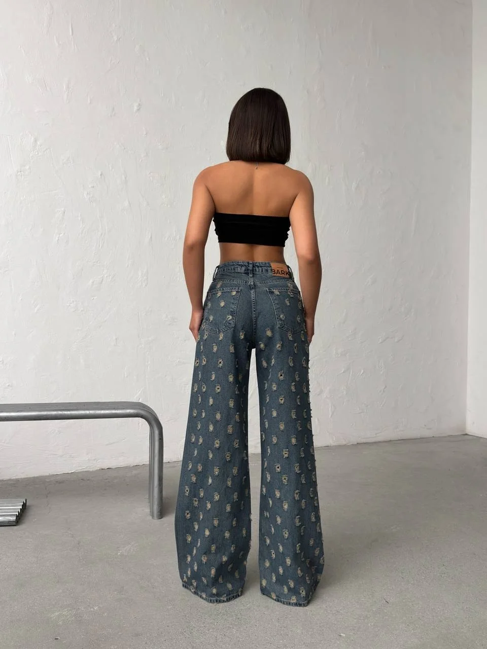 Sıradan denim dokularına veda edin! BARK koleksiyonunun en yenilikçi parçalarından biri olan bu koyu mavi jean pantolon, kumaşın tüm yüzeyine eşit olarak dağılmış mikro yırtık (distressed) ve eskitme detaylarıyla benzersiz bir karakter sergiliyor. Yüksek bel kalıbı ve aşağı doğru kusursuz bir şekilde dökülen palazzo geniş paçaları, hem modern bir silüet yaratır hem de gün boyu üstün konfor sağlar.