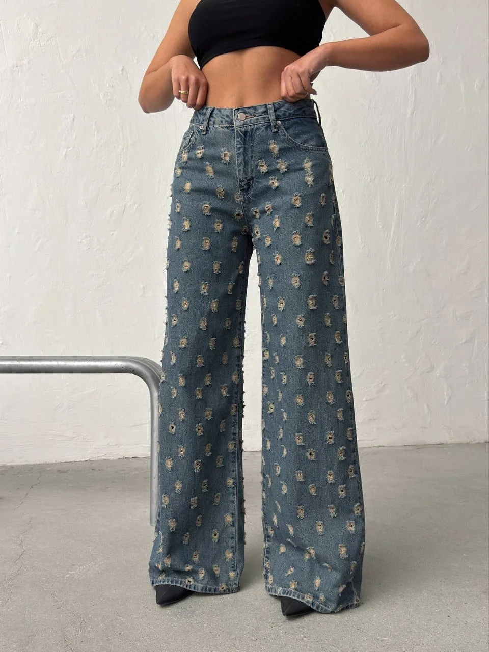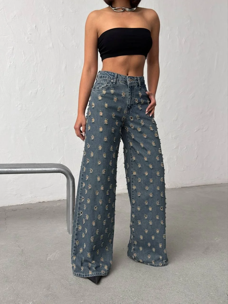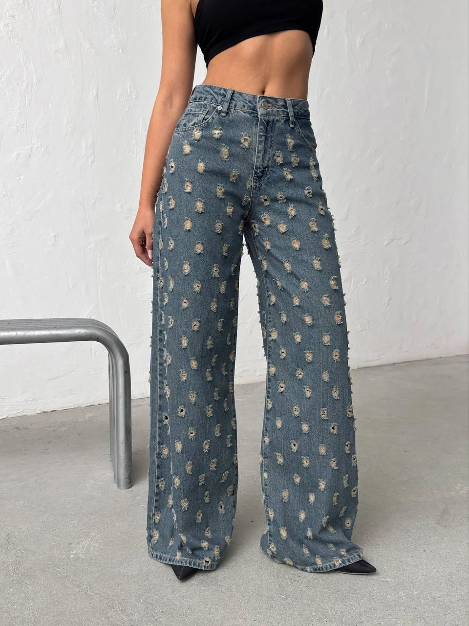 Sıradan denim dokularına veda edin! BARK koleksiyonunun en yenilikçi parçalarından biri olan bu koyu mavi jean pantolon, kumaşın tüm yüzeyine eşit olarak dağılmış mikro yırtık (distressed) ve eskitme detaylarıyla benzersiz bir karakter sergiliyor. Yüksek bel kalıbı ve aşağı doğru kusursuz bir şekilde dökülen palazzo geniş paçaları, hem modern bir silüet yaratır hem de gün boyu üstün konfor sağlar.