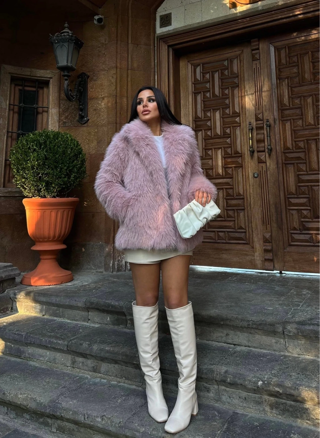 Pembe Şal Yaka İçi Astarlı Kürk Kaban