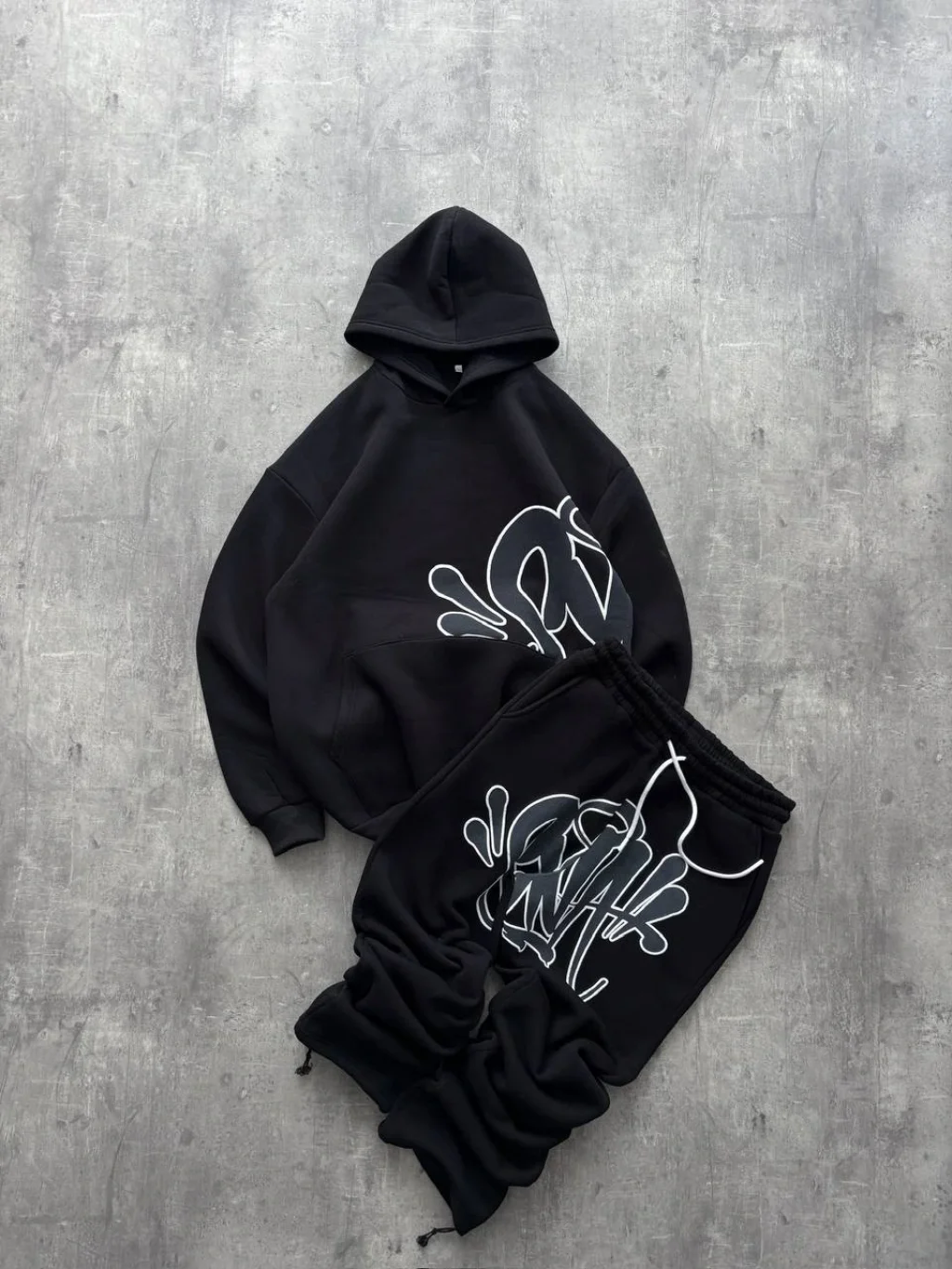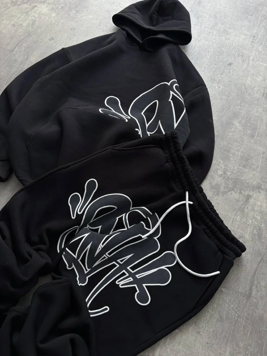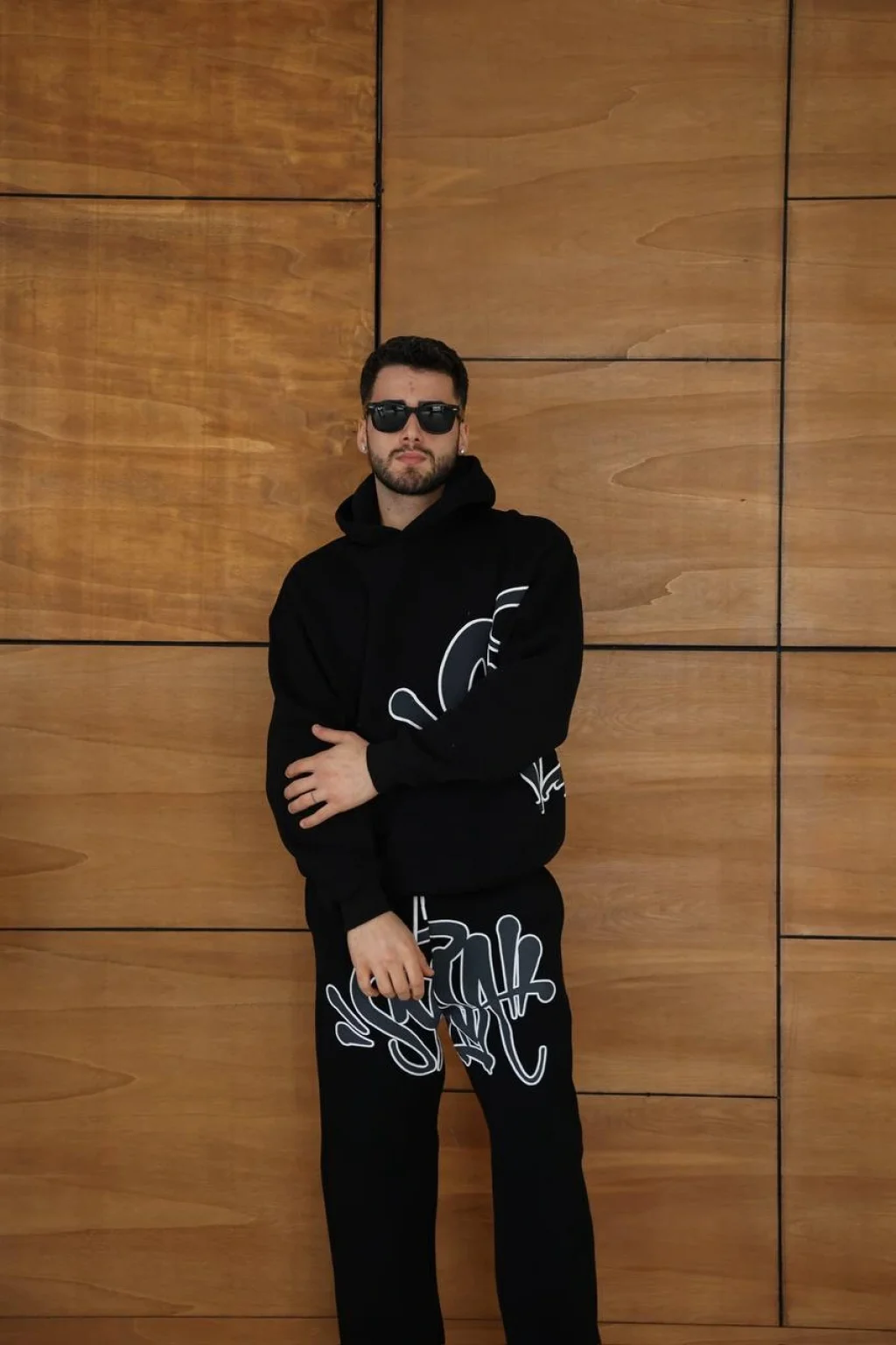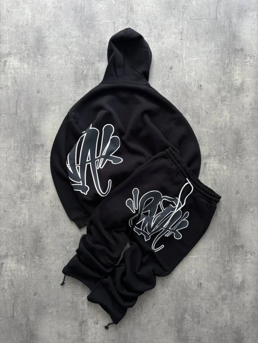 Siyah Baskılı Kapşonlu Unisex Oversize Eşofman Takımı