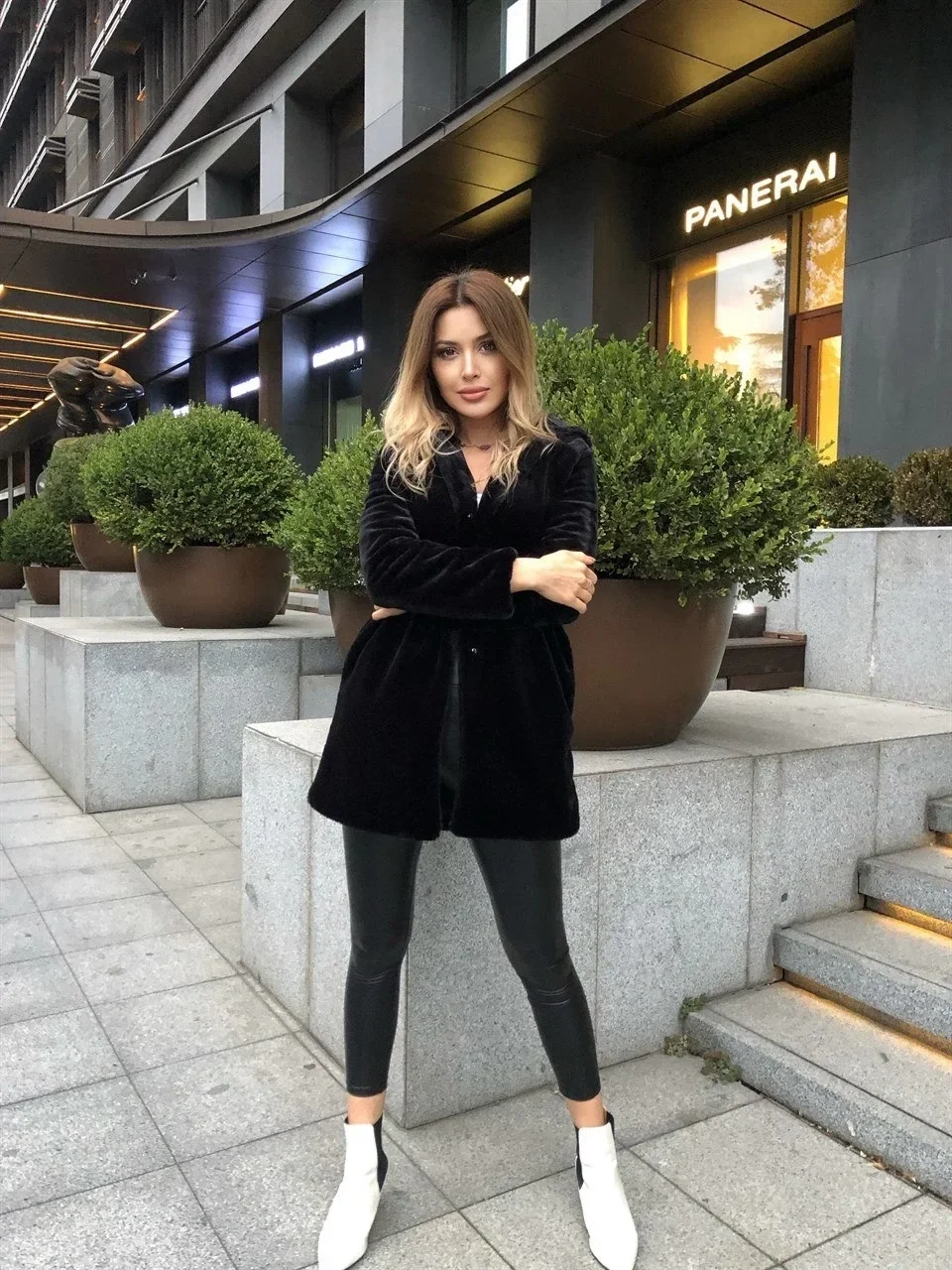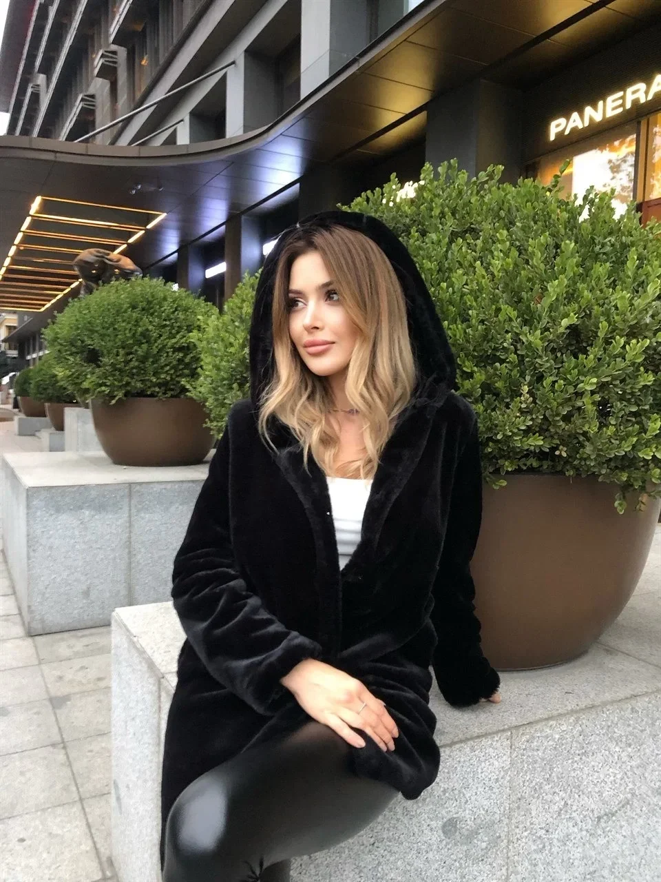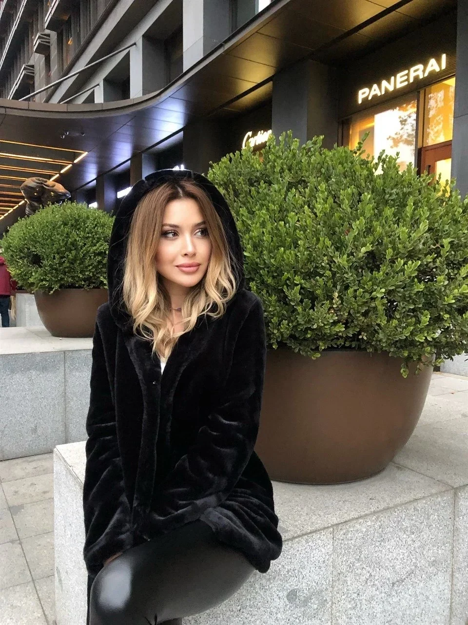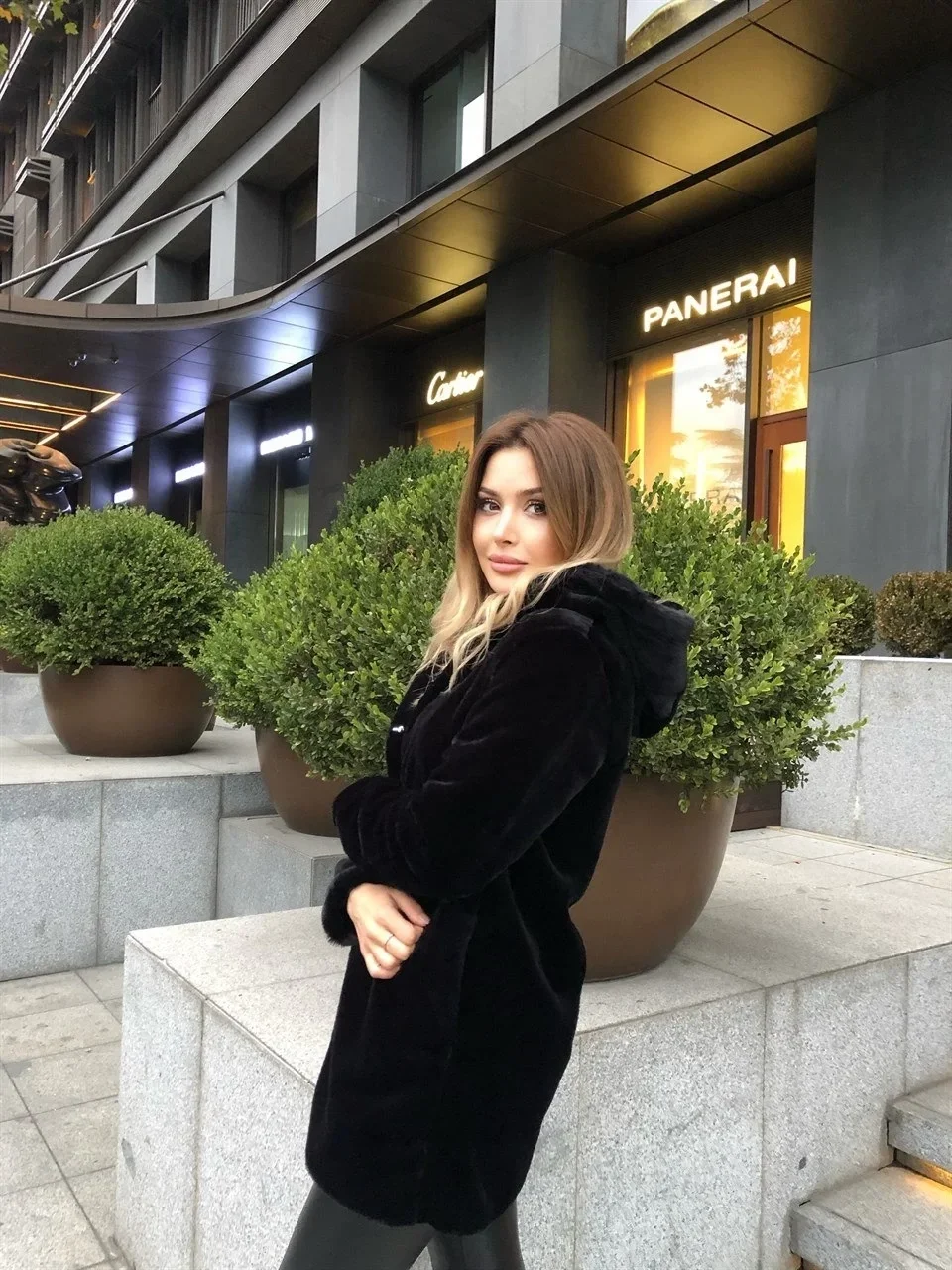 • Siyah Kapşonlu İçi Astarlı Rabbit Peluş Kaban