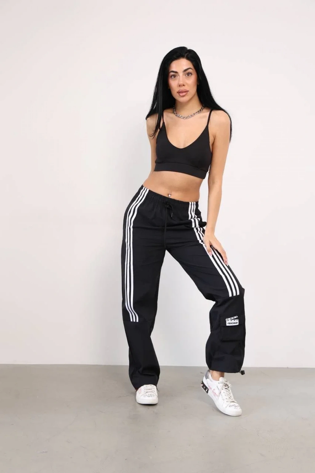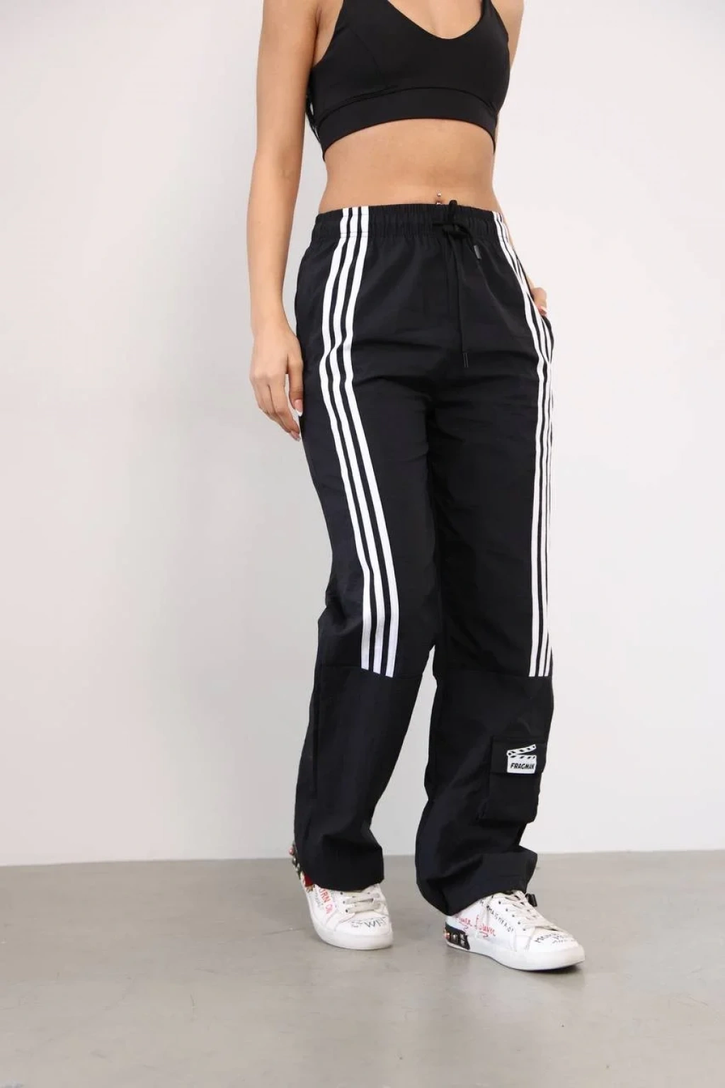 Siyah Önden Üç Şerit Paça Cep Detay Paraşüt Eşofman