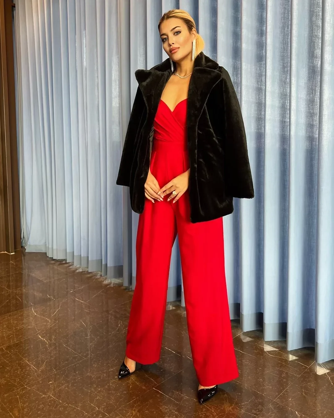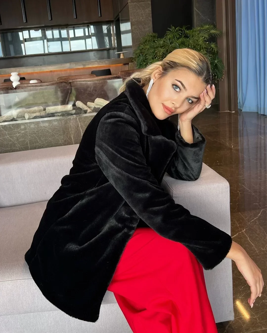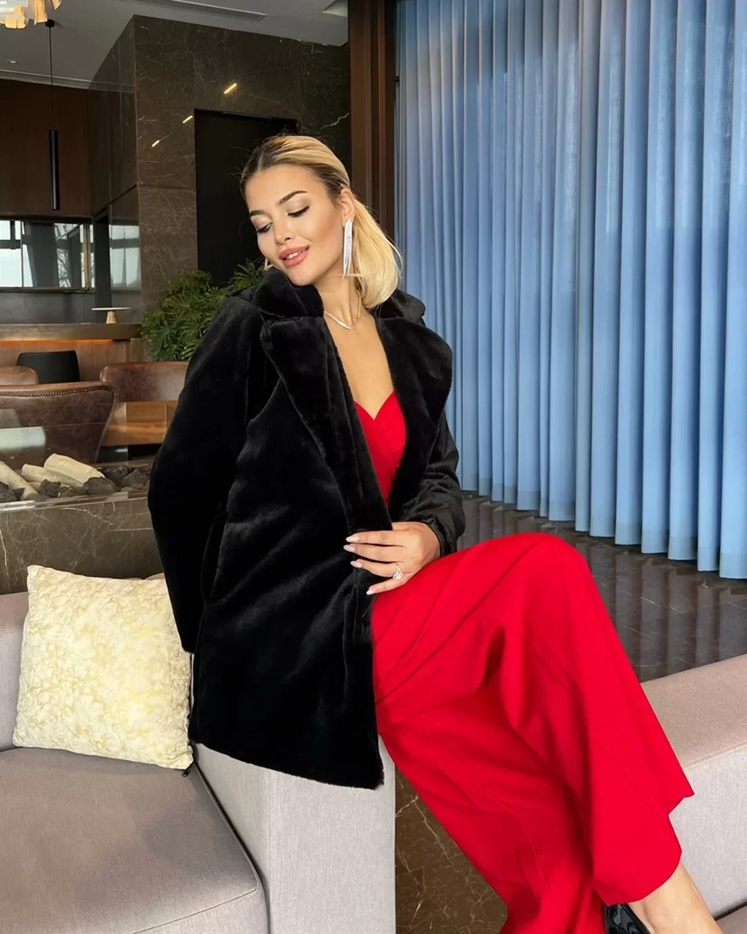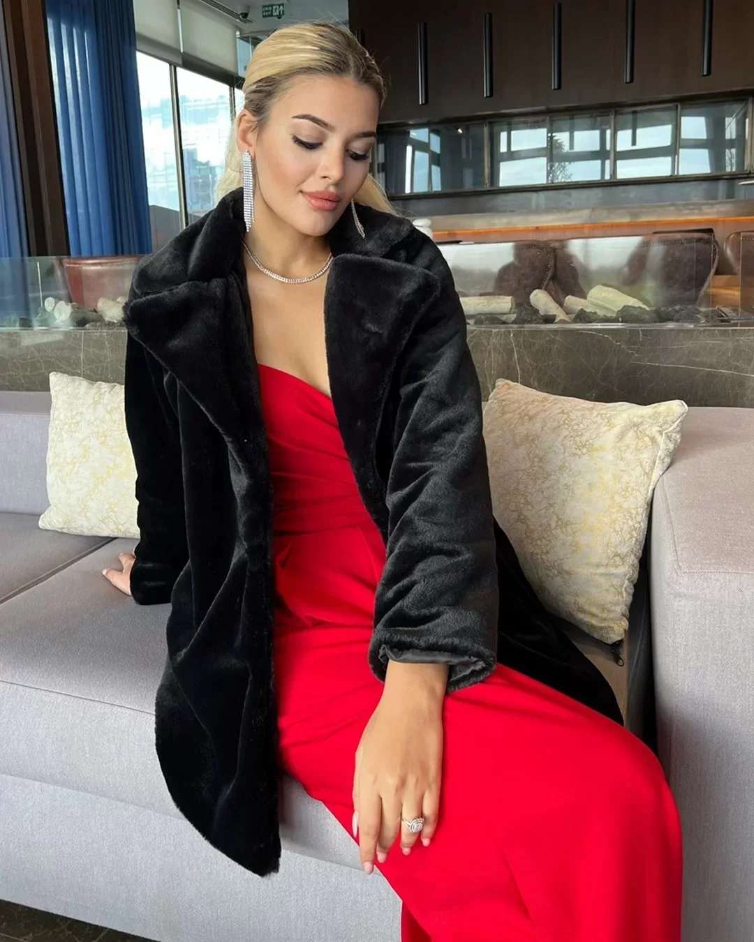 • Siyah Şal Yaka İçi Astarlı Rabbit Peluş Kaban