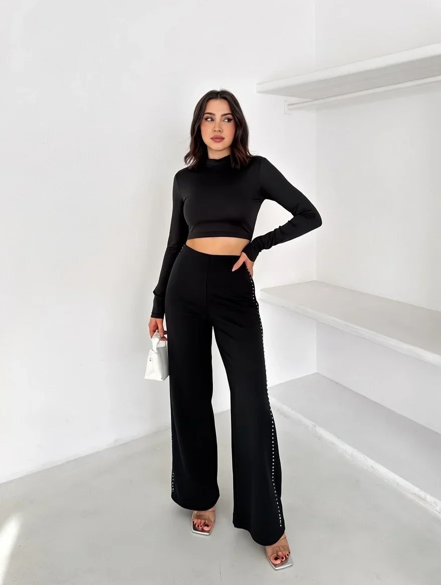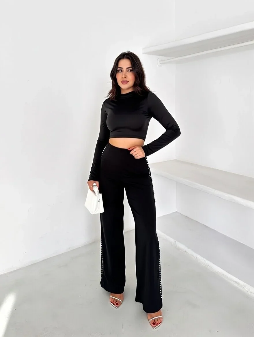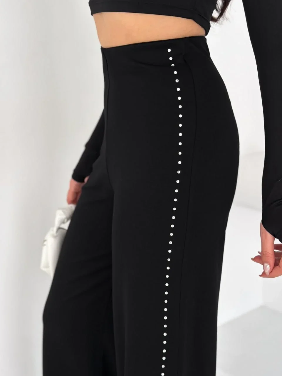Siyah Yandan Taşlı Bol Paça Pantolon