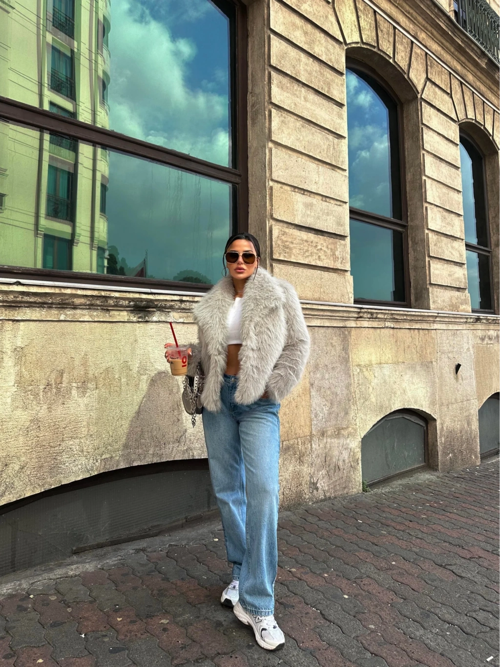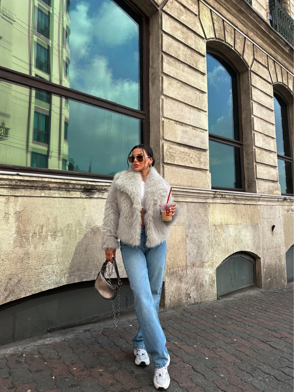 Beyaz Leopar Ceket Yaka İçi Satarlı Uzun Kürk Kaban