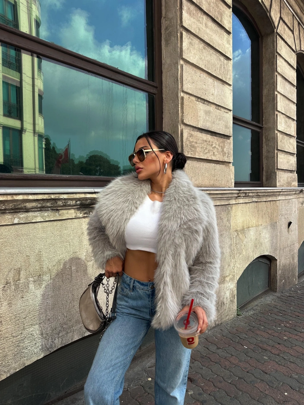 Gri Kapitone İçi Astarlı Kürklü Mont