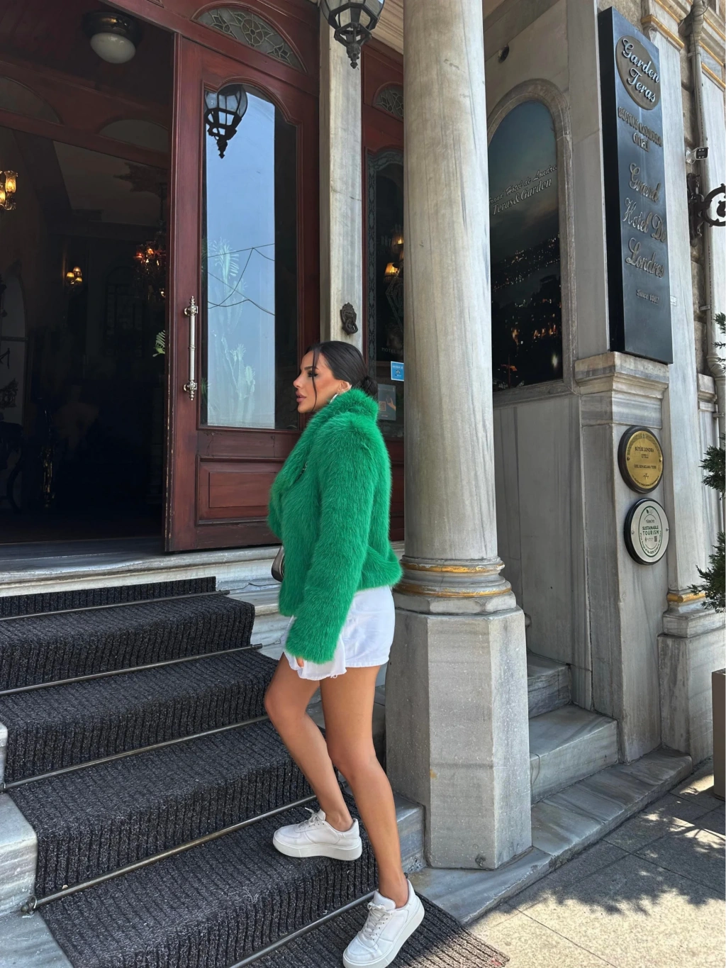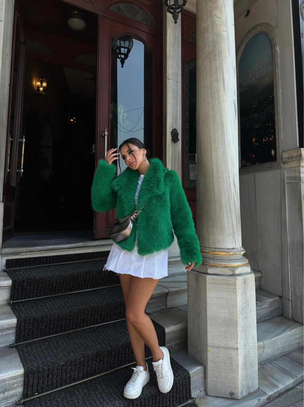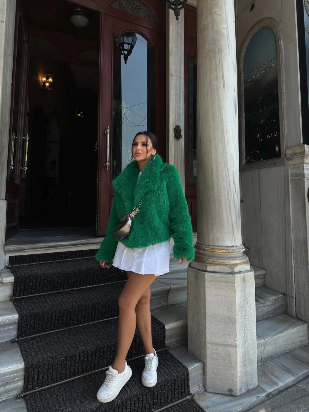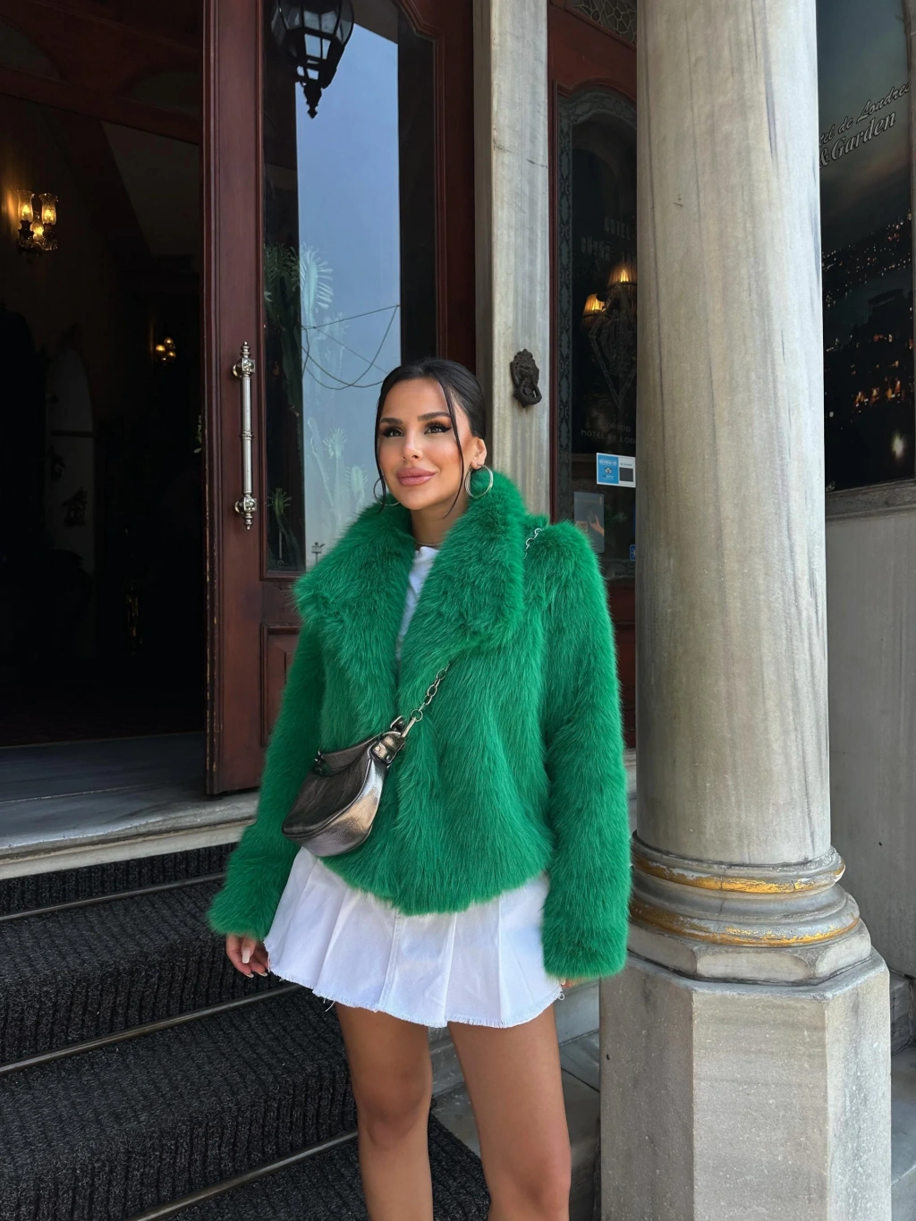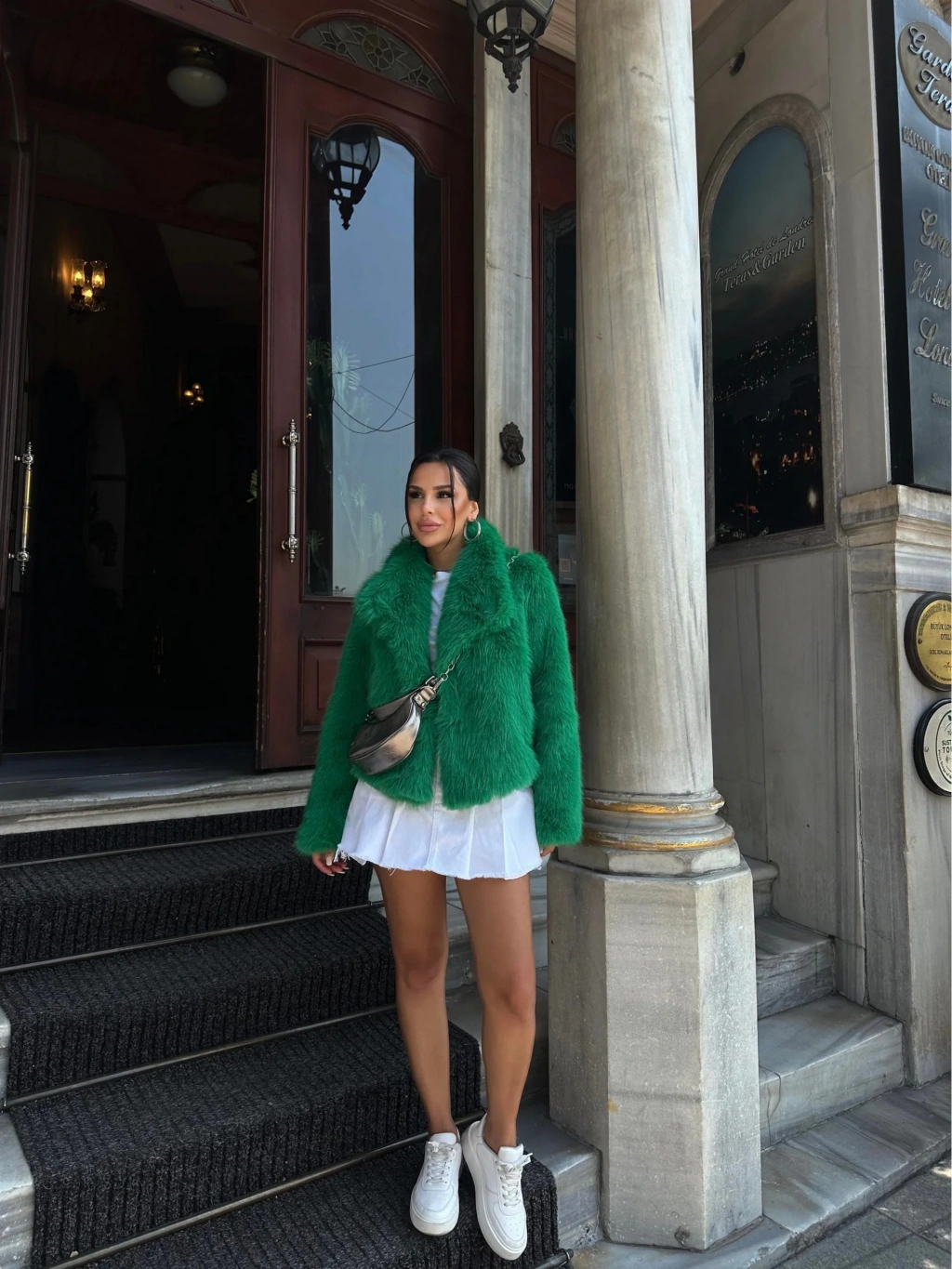 Yeşil Şal Yaka İçi Astarlı Kürk Kaban