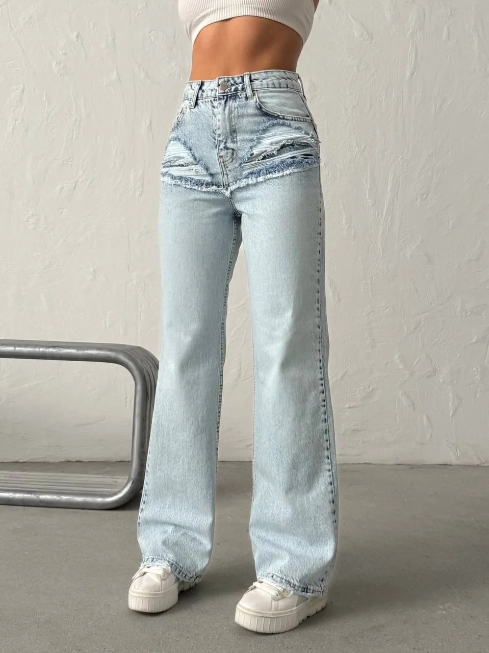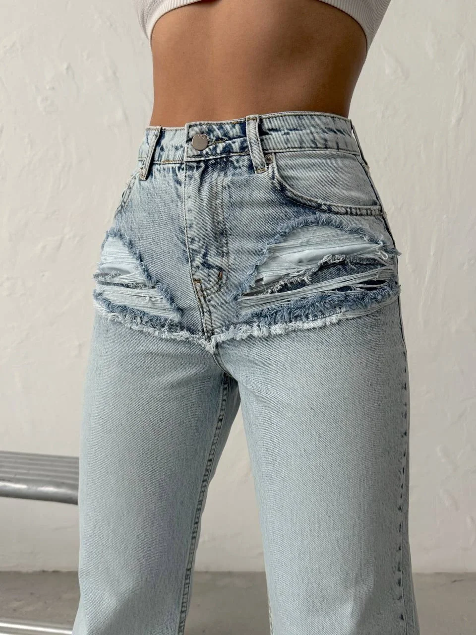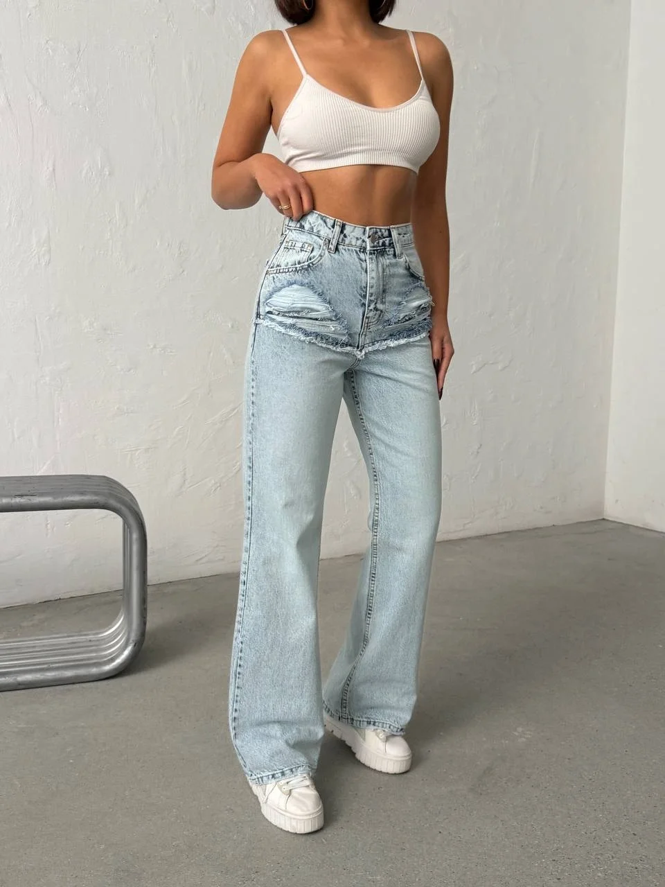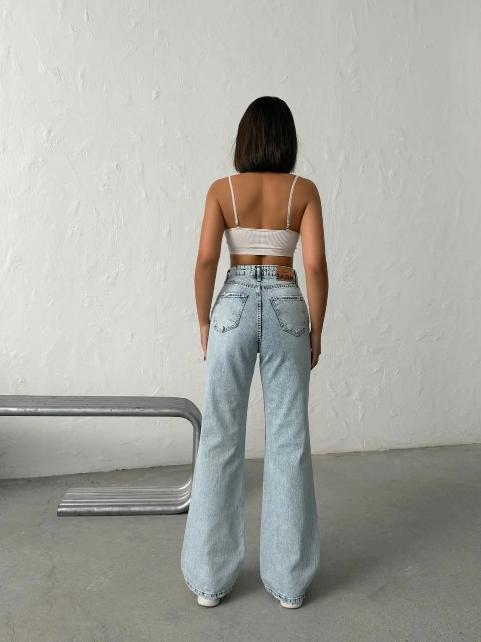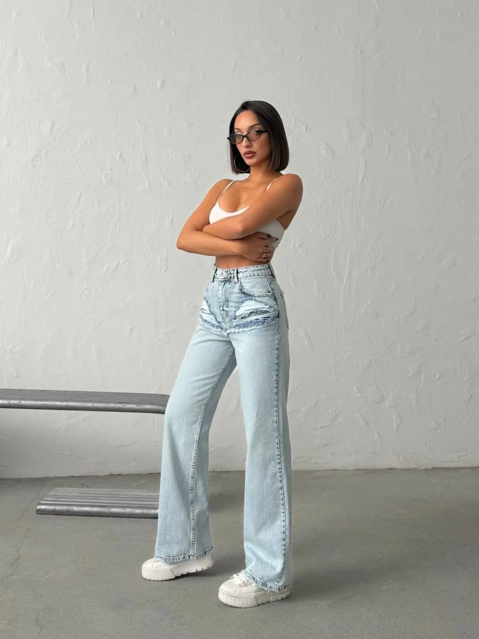 Sıradan denim tasarımlarına veda edin! BARK'ın yenilikçi ruhunu yansıtan bu açık mavi jean pantolon, bel ve kalça bölgesindeki asimetrik, saçaklı dikiş detaylarıyla fark yaratıyor. "Çift bel" illüzyonu yaratan bu çarpıcı tasarım, sade bir kombini bile anında üst seviyeye taşıyacak güce sahip.